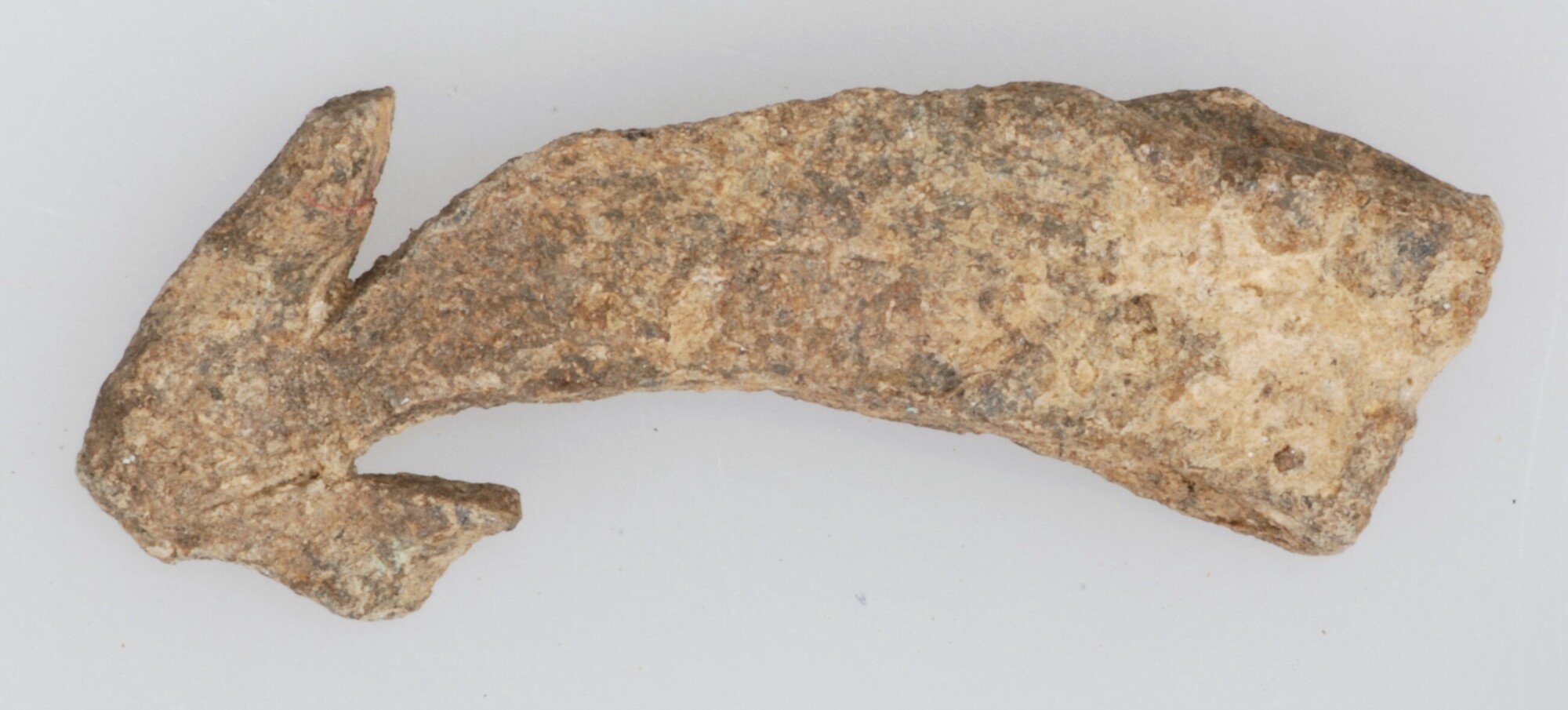 Anker?; smalle steel die aan het uiteinde is omgebogen. Aan de andere zijde zijn uitsparingen in de vorm van ''weerhaken'' gemaakt