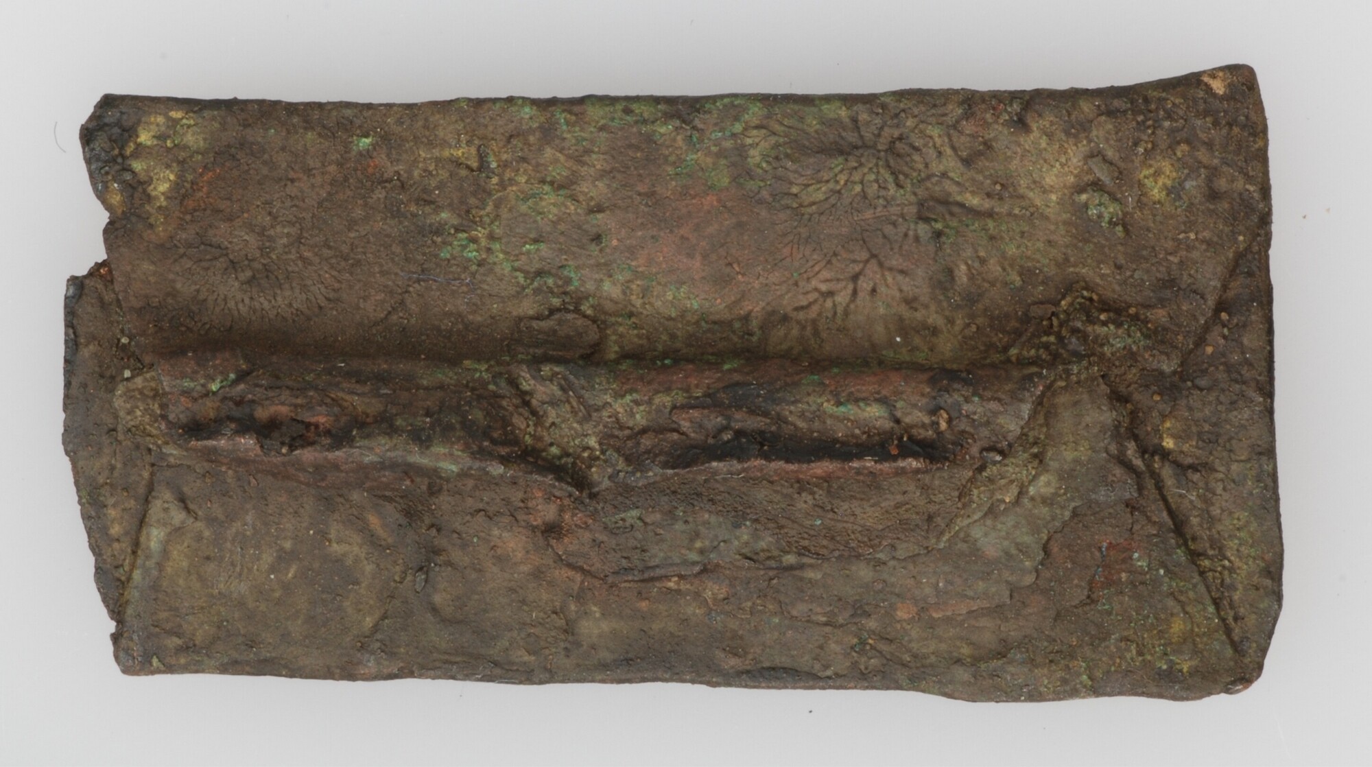 Plaat; rechthoekig met aan de achterzijde een aanhechting; vondstomstandigheden: detector stort