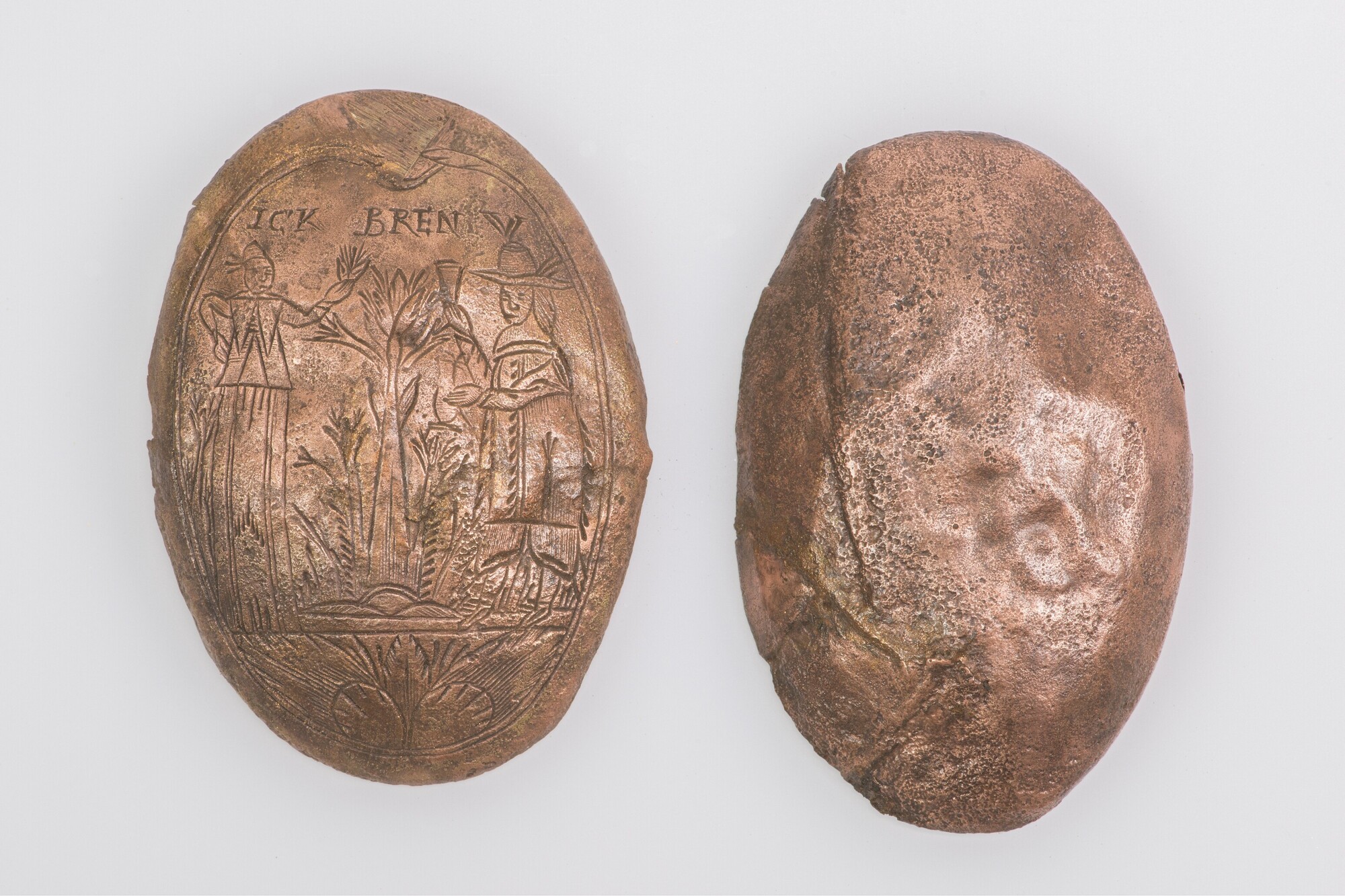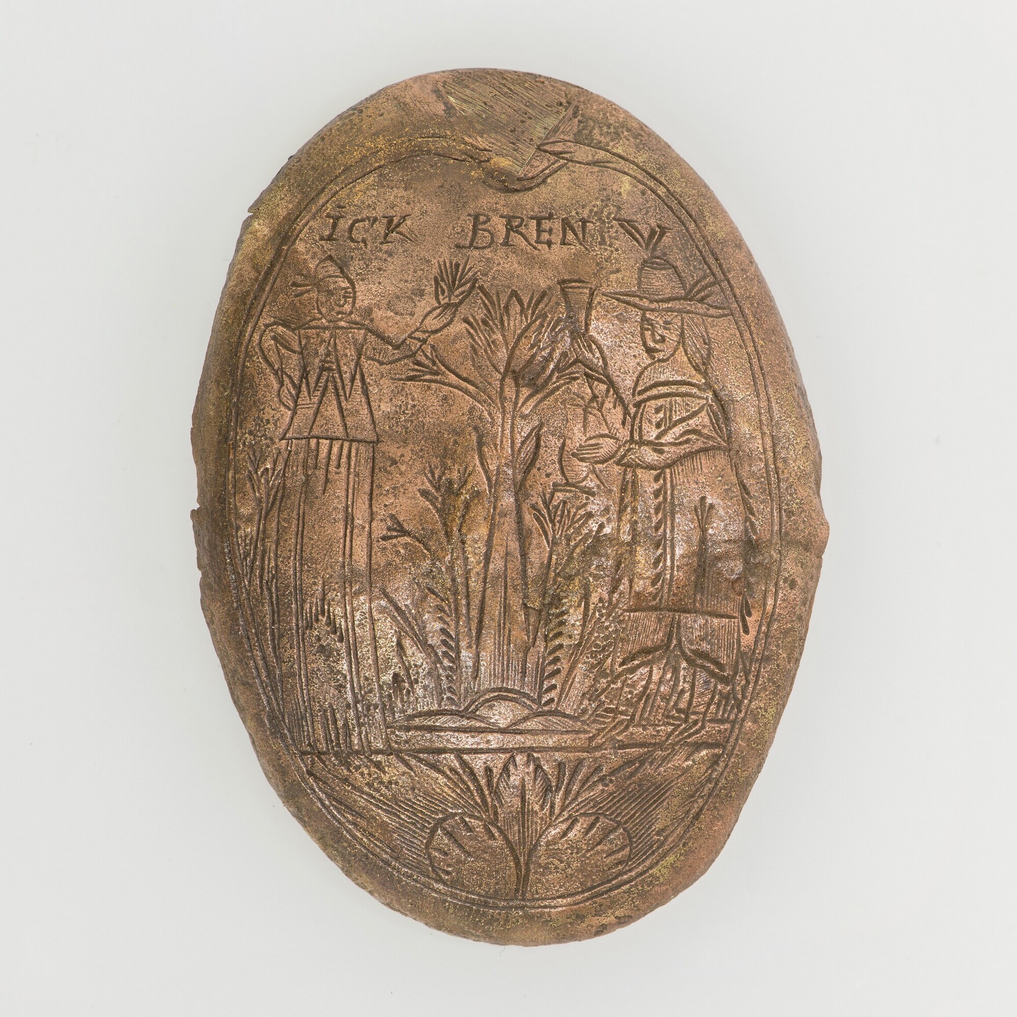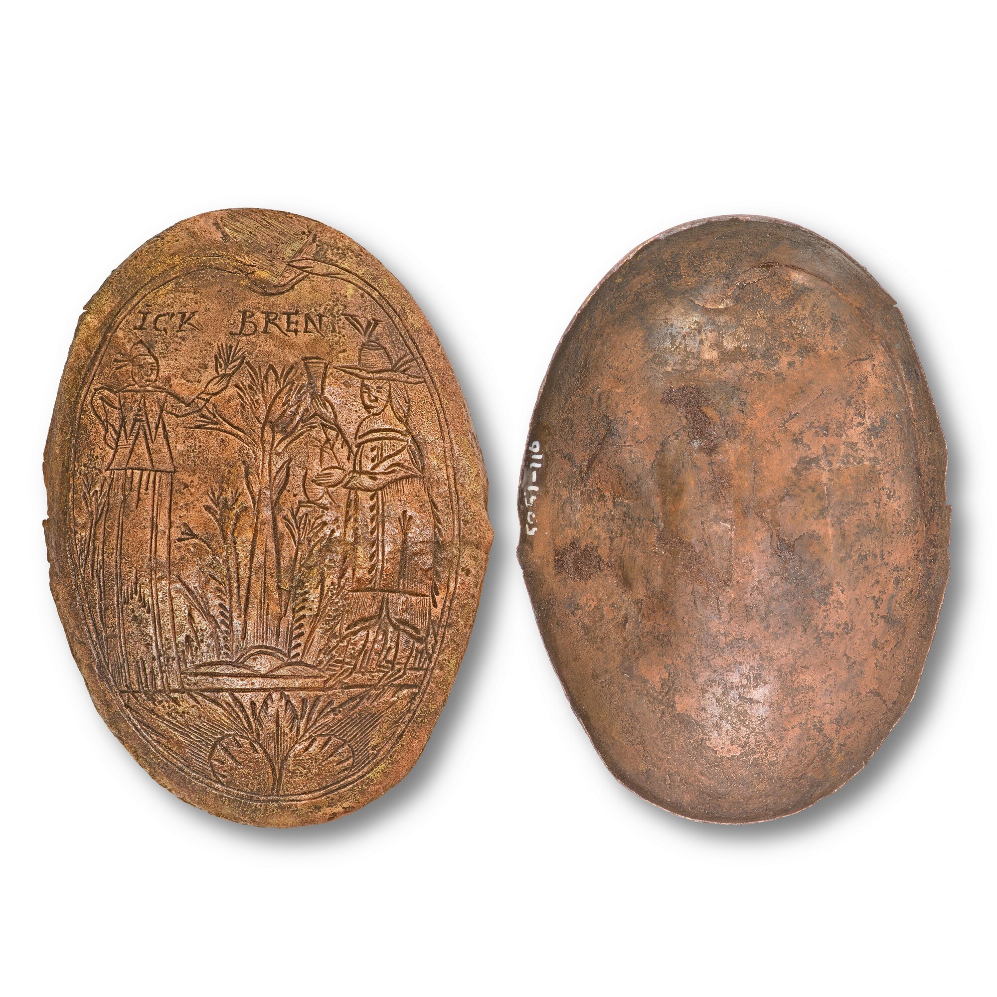 Tabaksdoos; bol eivormig, met los deksel (zijwand ontbreekt); deksel versierd met gravure van een vrouw en een man met tussen hun in een tabaksplant; de vrouw heeft tabaksbladeren in haar hand en de man heeft een beker en een kan in zijn handen; het betreft mogelijk de Indiaanse Pocahontas en haar man: tabakshandelaar John Rolfe; ...
