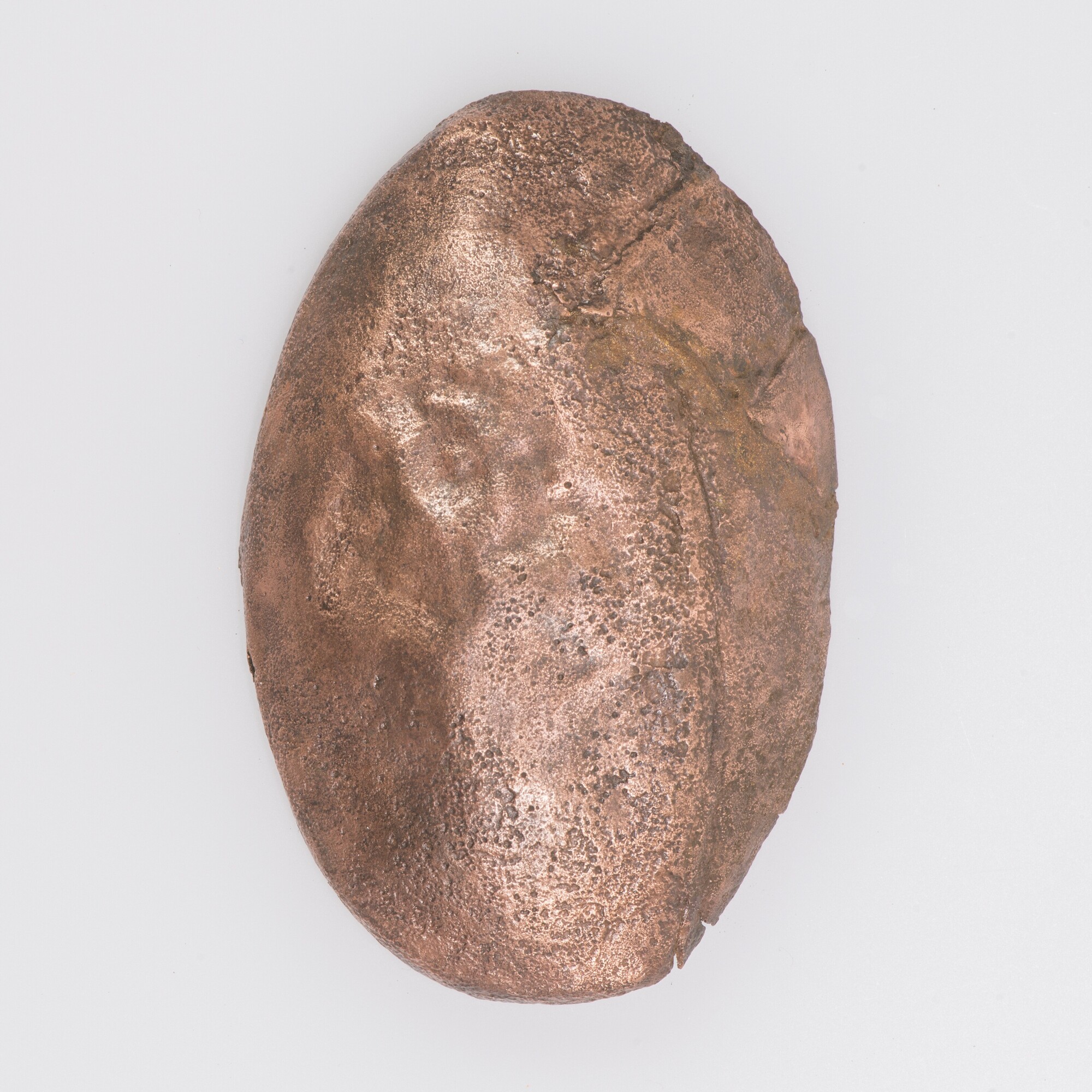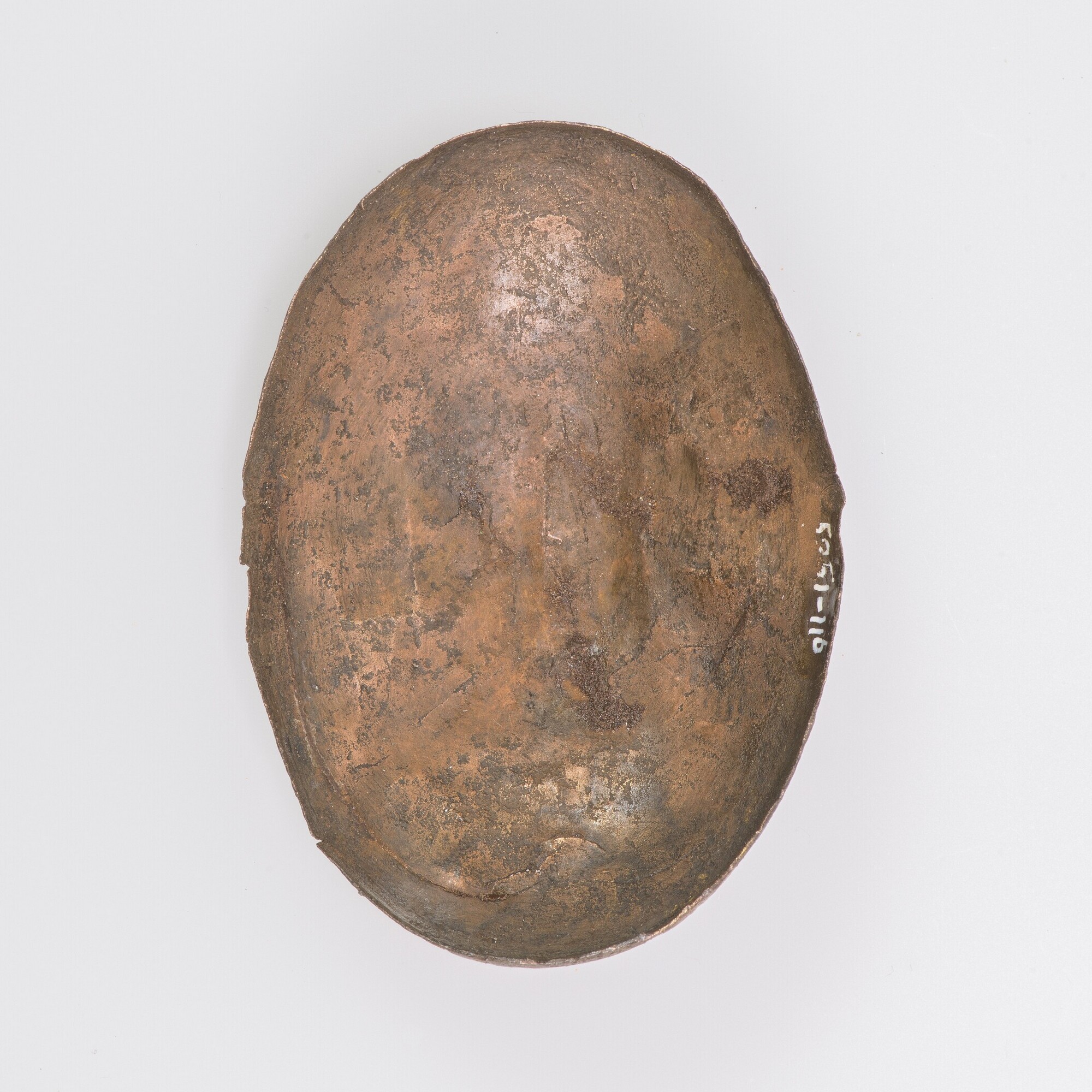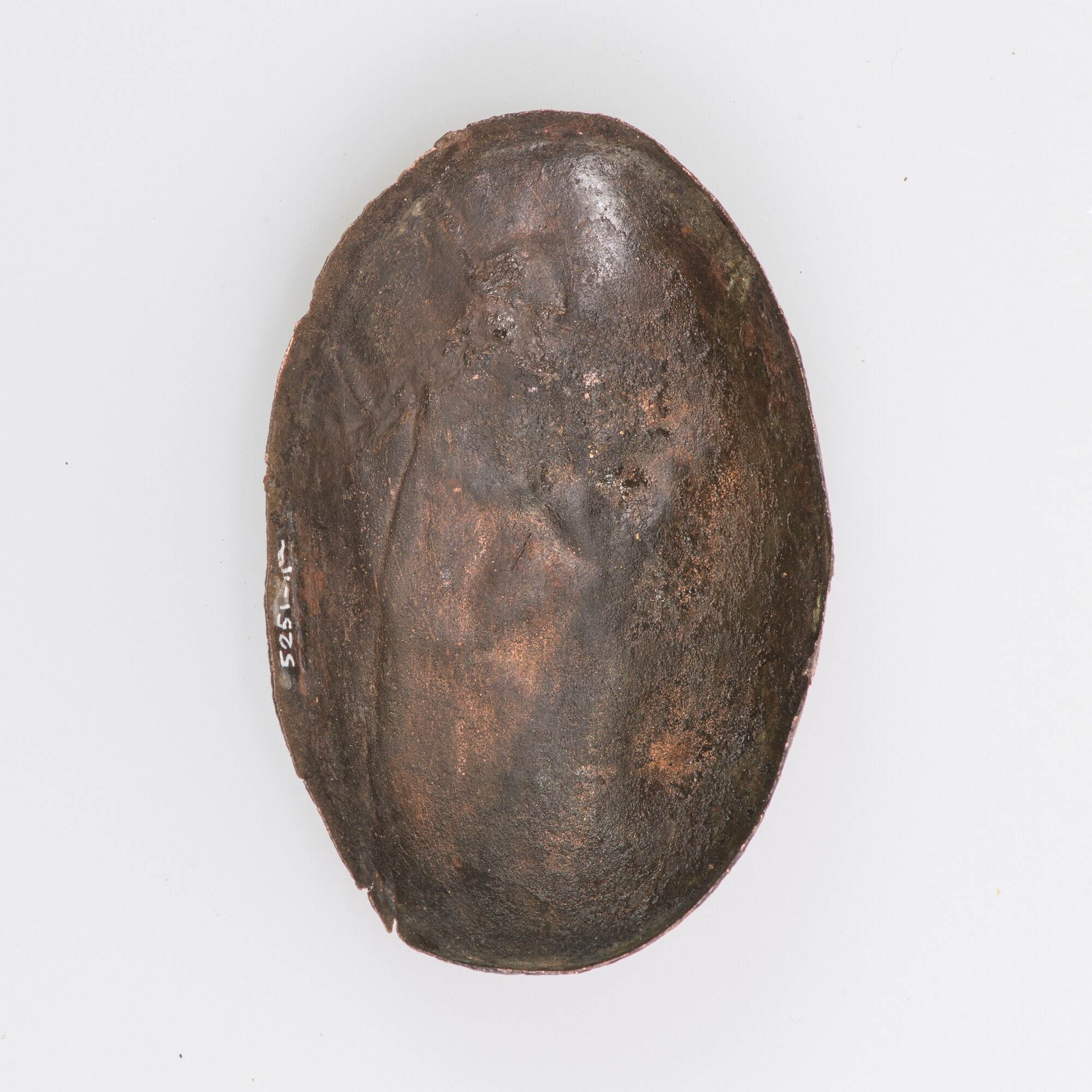 Tabaksdoos; bol eivormig, met los deksel (zijwand ontbreekt); deksel versierd met gravure van een vrouw en een man met tussen hun in een tabaksplant; de vrouw heeft tabaksbladeren in haar hand en de man heeft een beker en een kan in zijn handen; het betreft mogelijk de Indiaanse Pocahontas en haar man: tabakshandelaar John Rolfe; ...