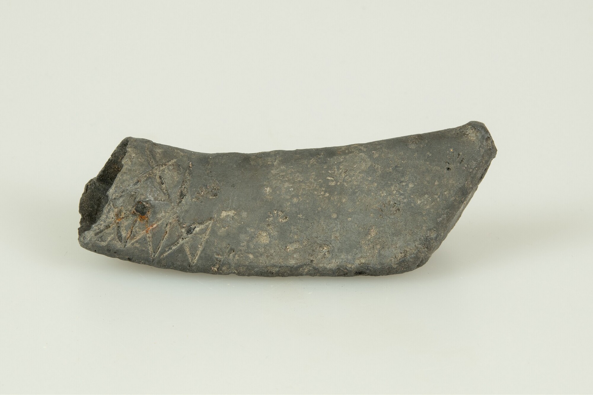 Kolfslof; voorzien van een huismerk en stervormige stempels; aan het uiteinde bevinden zich twee spijkergaten waarmee de kolfslof aan de houten golfstok bevestigd heeft gezeten; driehoekig in doorsnede; vondstomstandigheden: aanleg vlak/detector, datum: 20-10-2010