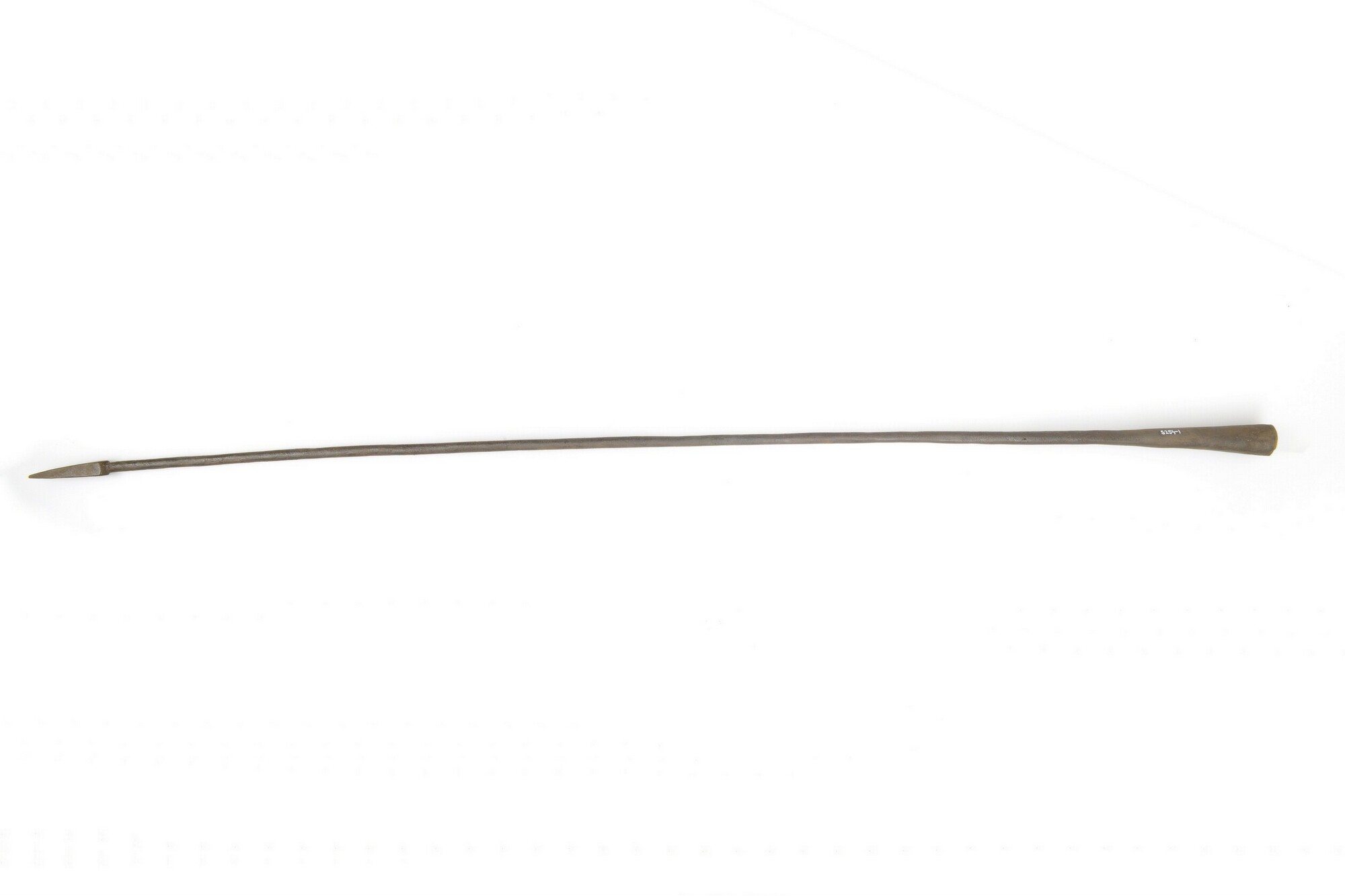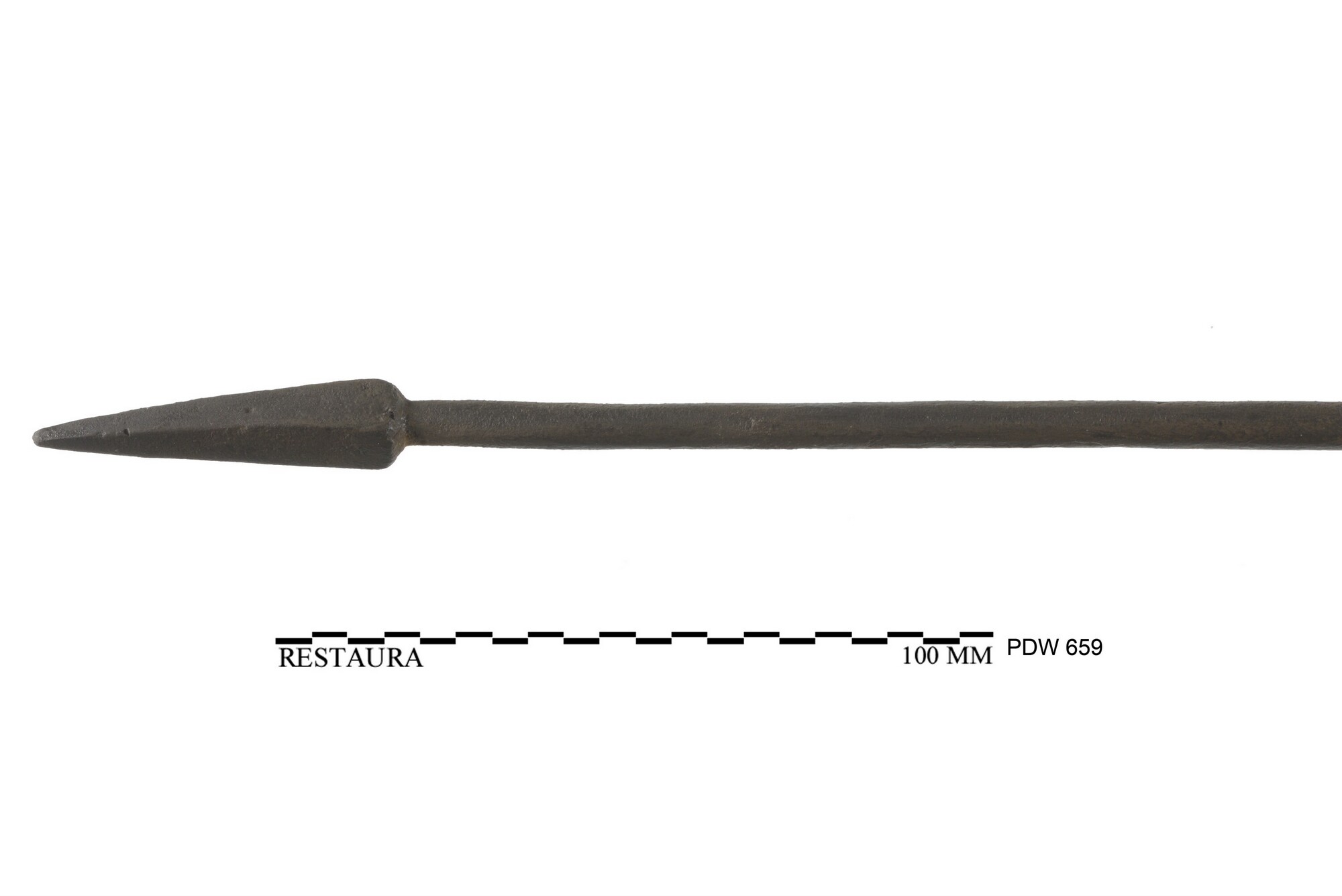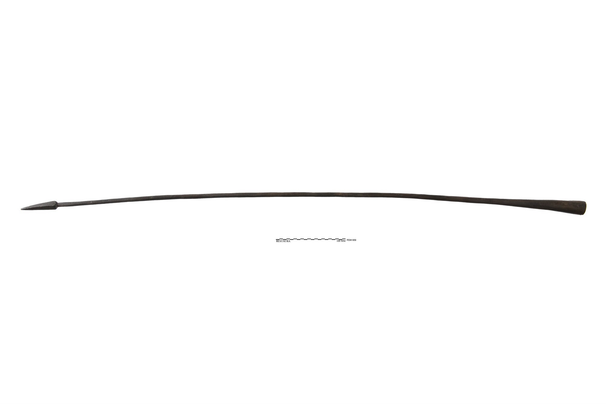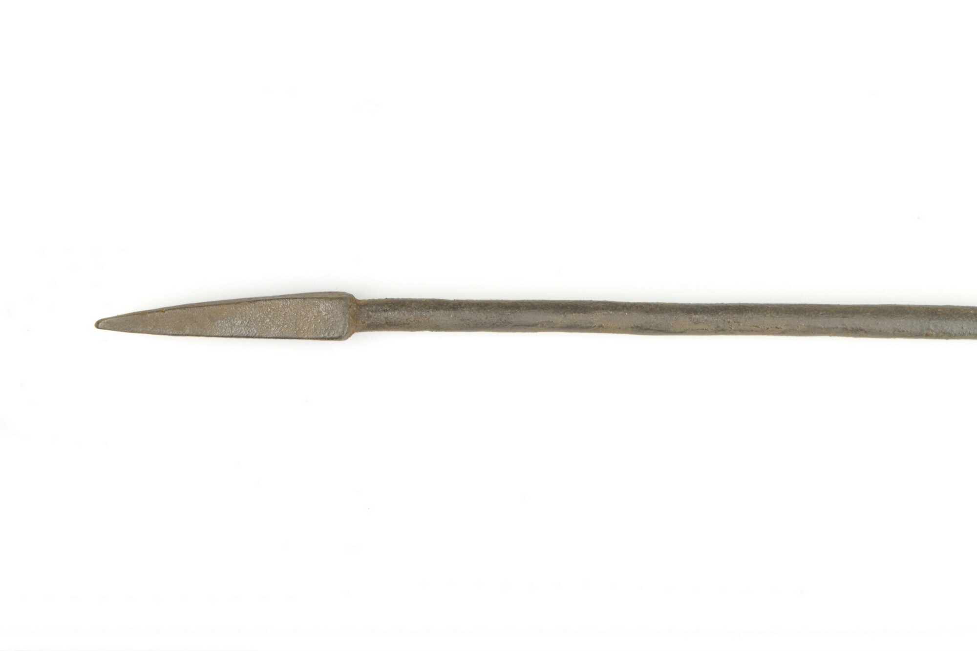 Pilum; compleet met ronde sok en schacht. De punt heeft een vierkante doorsnede. De schacht en huls voor de bevestiging aan het hout zijn rond