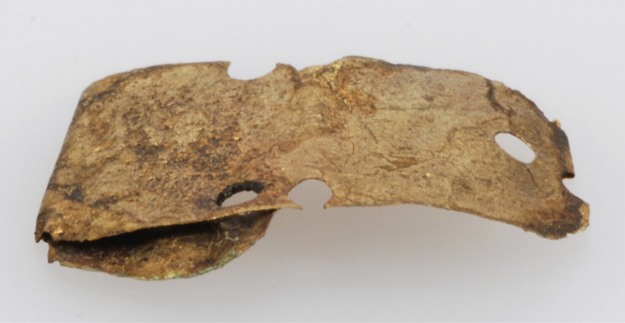 Schubbenpantser (Lorica Squamata); de dunne plaat is om gebogen. acht gaten, mogelijk behoort dit plaatje toe tot één van de bovenste rijen van een pantser.