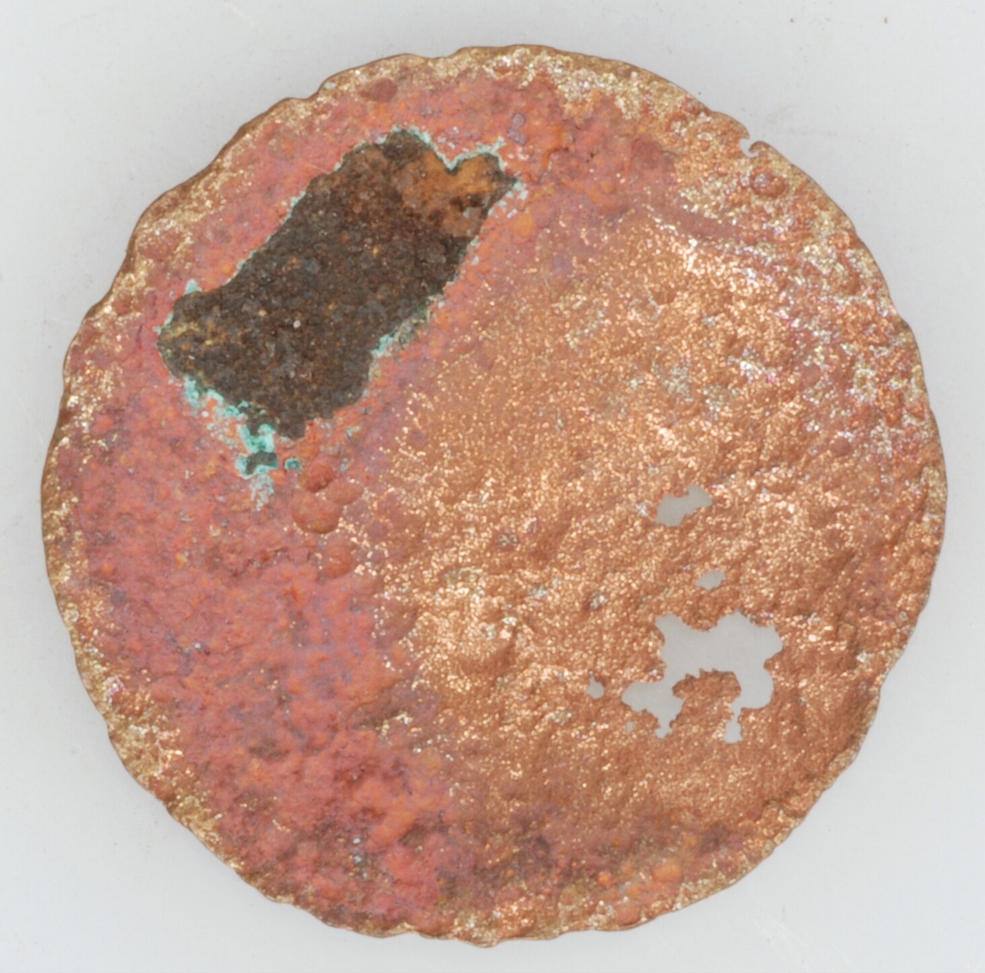 Duit; te versleten voor determinatie; klein gat langs rand; gewicht: 0.84 gram