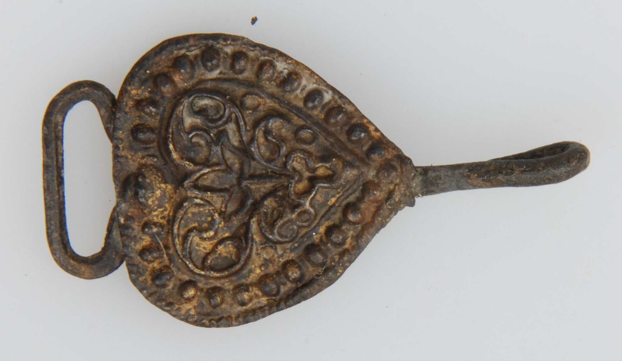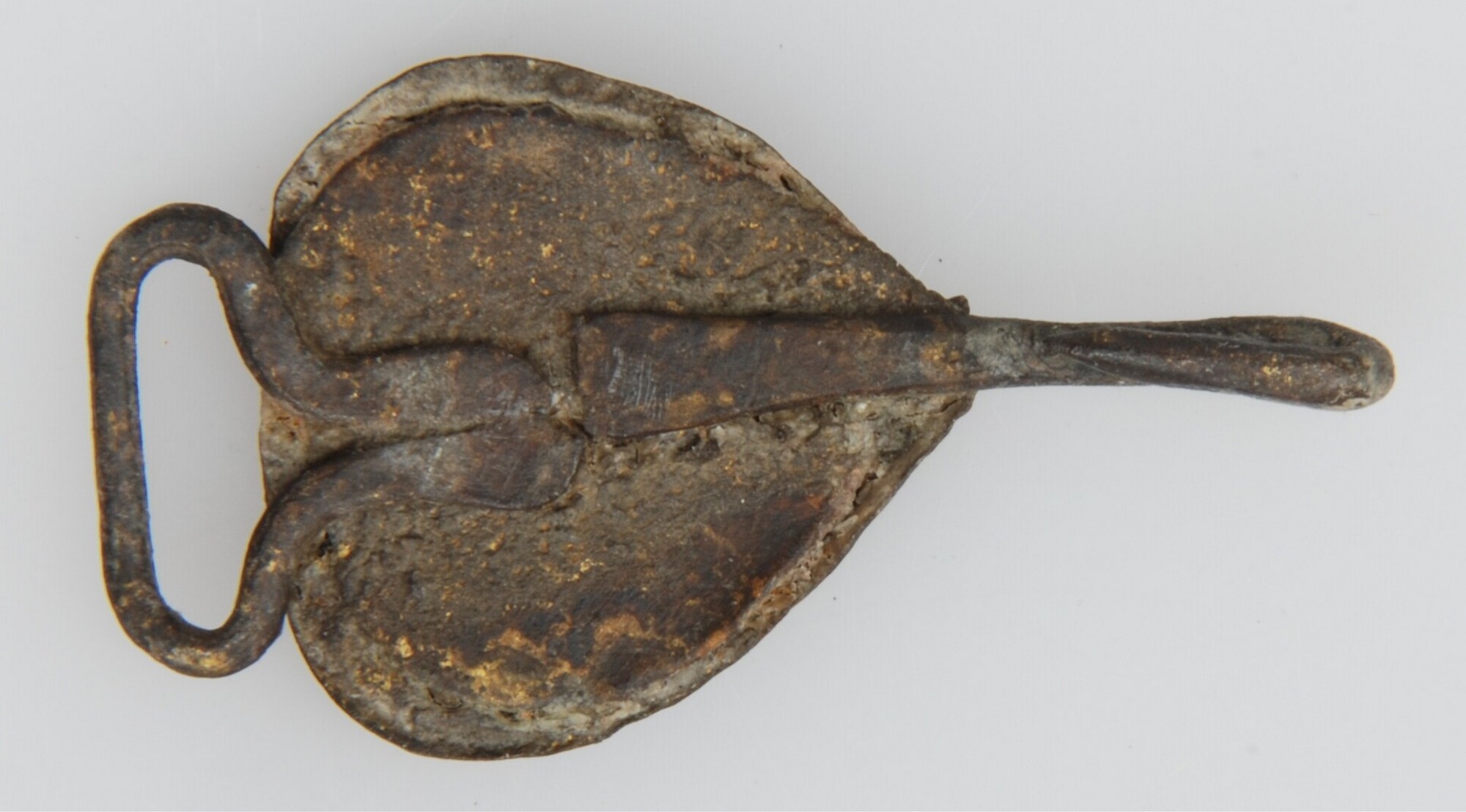 Kledinghaak; hartvormig middenlijf met bovenaan een rechthoekig oog en aan de onderzijde een haak