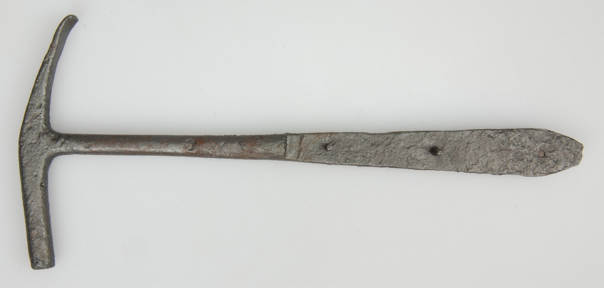 Hamer; een massief ronde zijde en het andere uiteinde loopt gebogen. op de steel zitten nog twee klinknagels; mogelijk gebruikt voor fabricage van schoenen