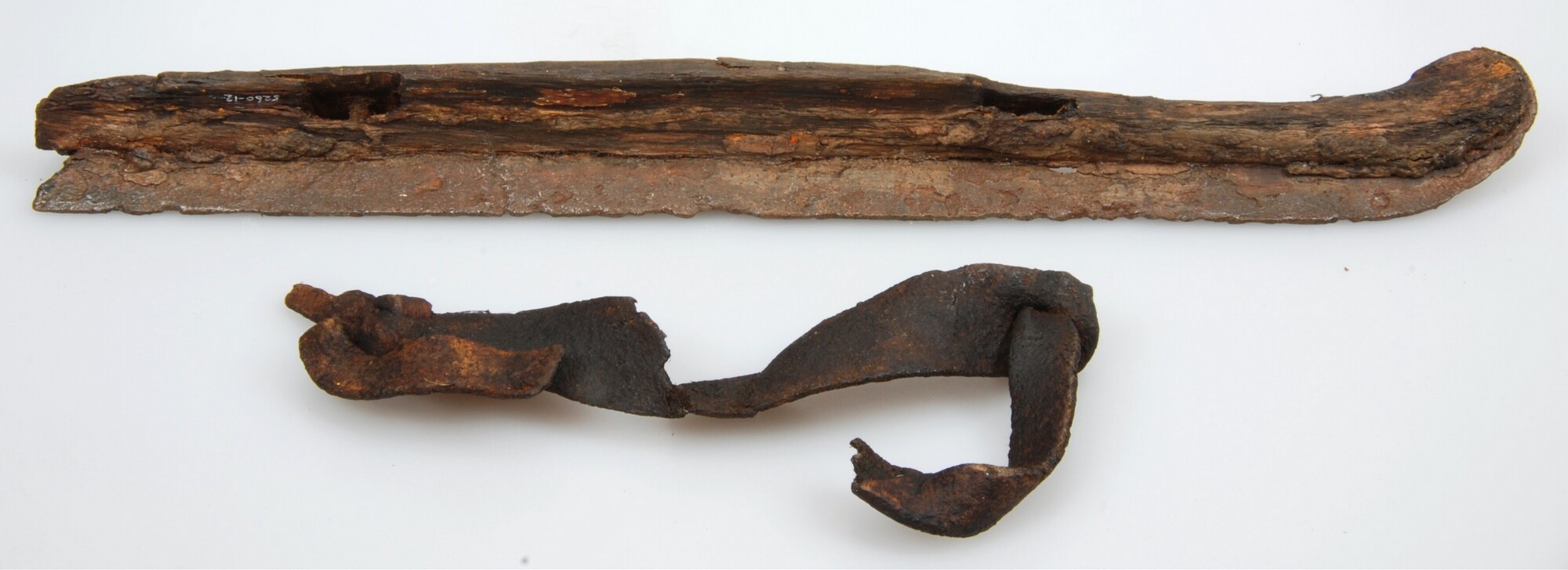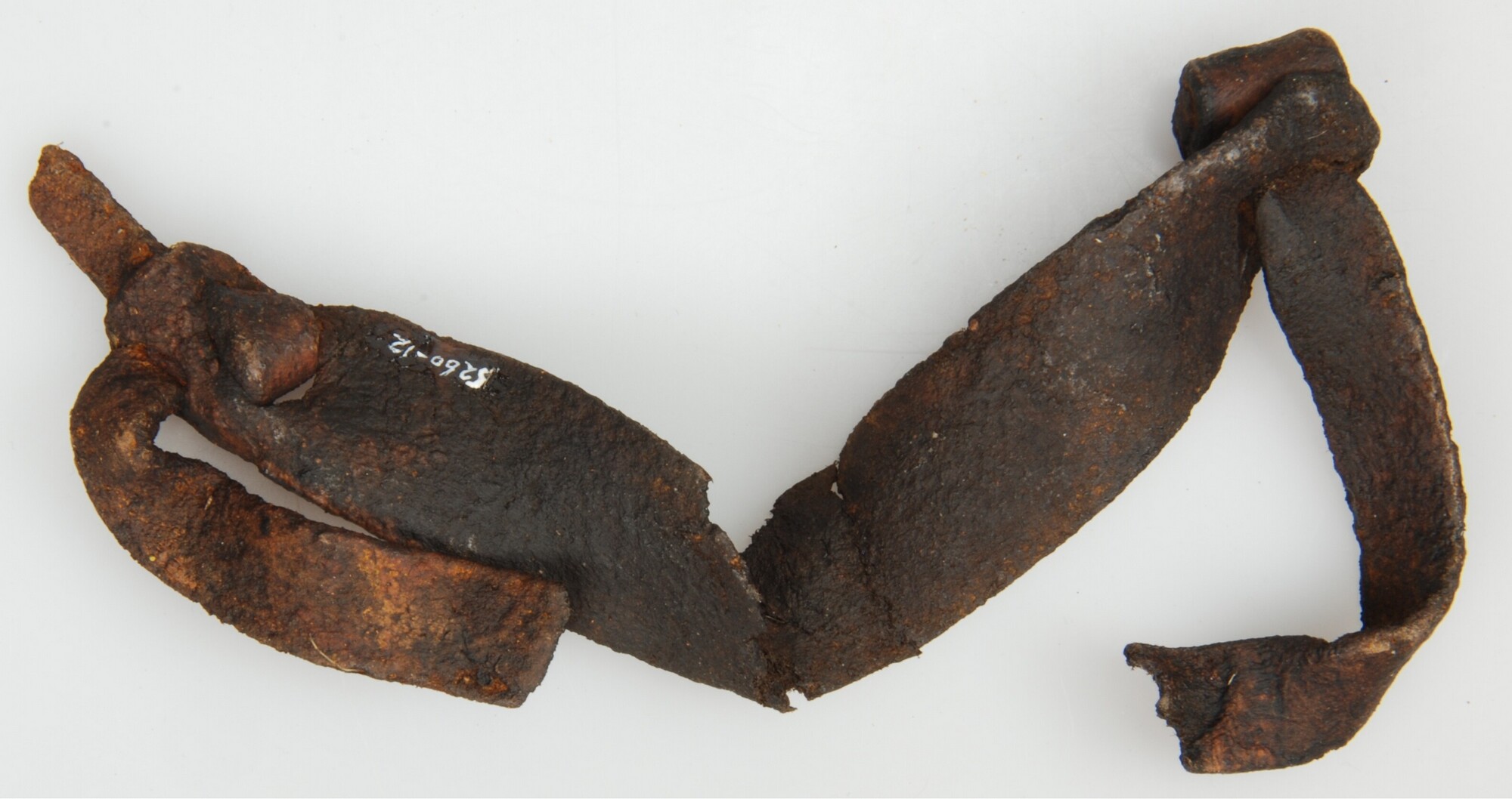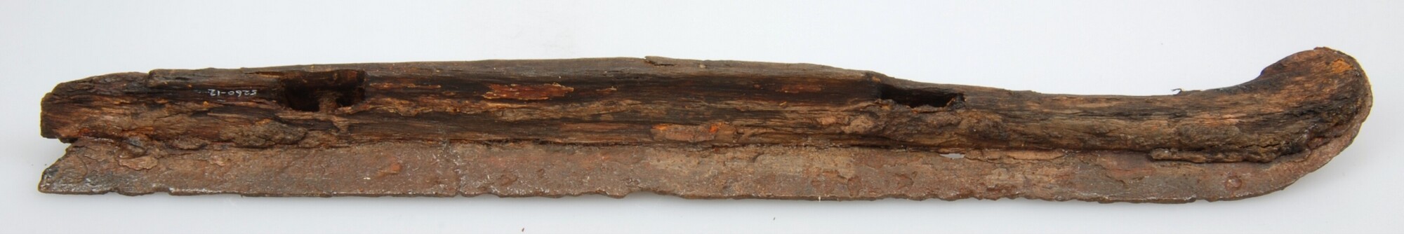 Schaats; type Friese doorloper; fragment leren band; het uiteinde van het ijzer loopt uit in een kromme punt