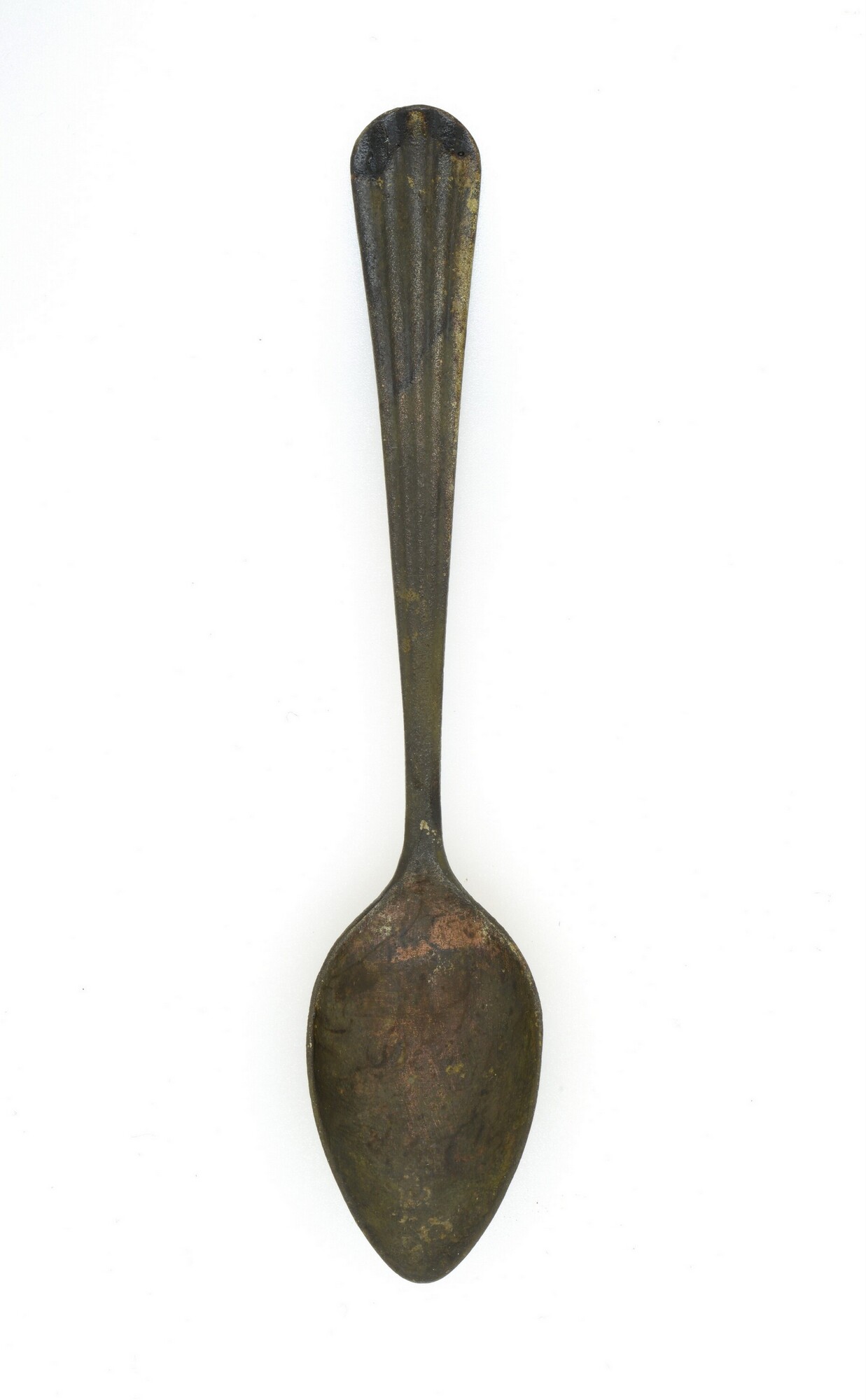 Lepel; ronde steelbeeindiging en een ovaalvormige bak; achterzijde steel merkteken