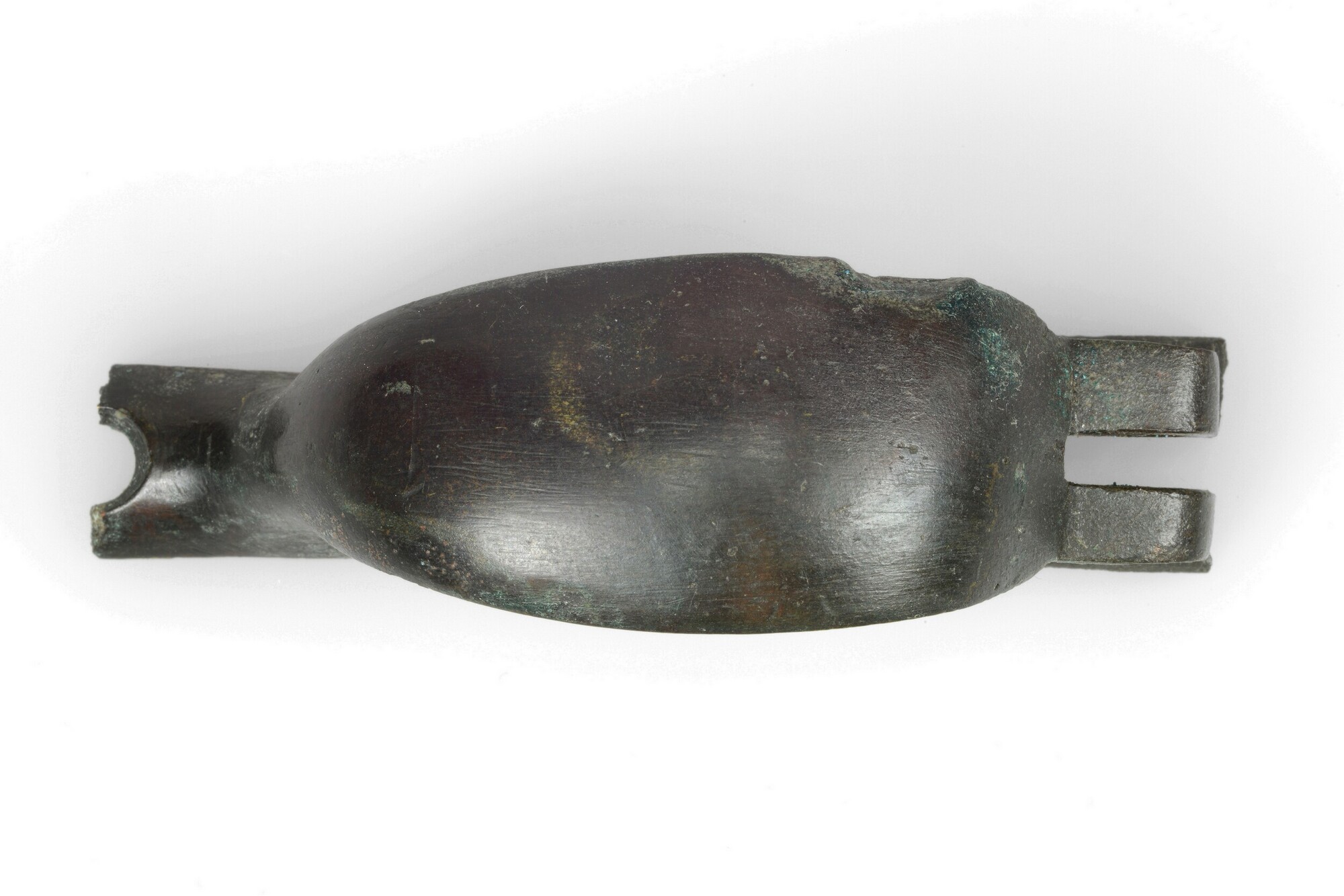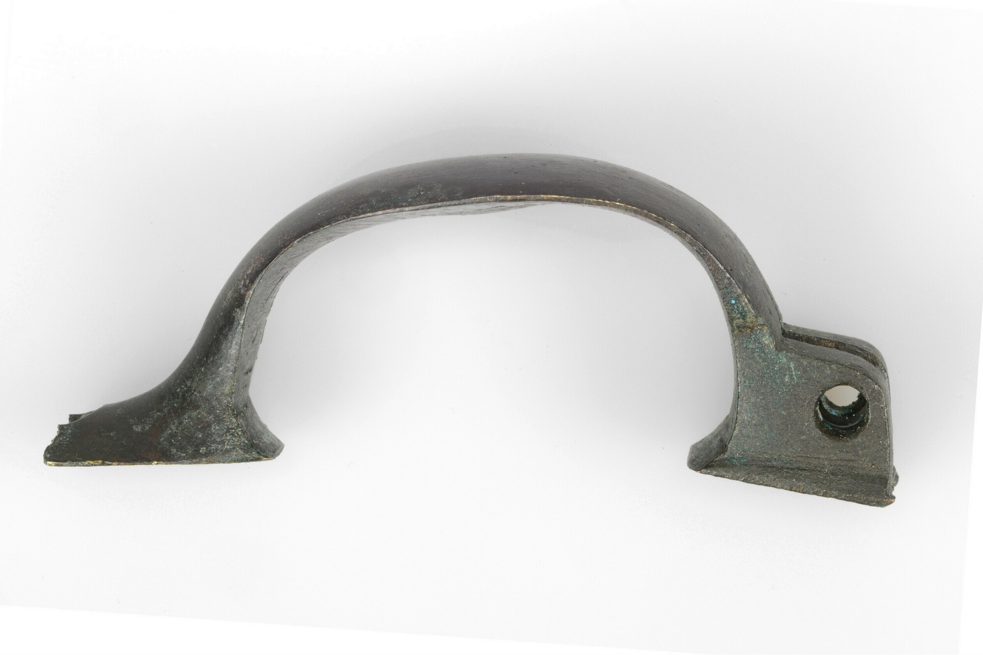 Trekkerbeugel (fragment); onderdeel musket; aan beide zijden afgebroken; beschadiging aan zijkanten en onderzijde, vermoedelijk veroorzaakt door kogelinslagen; herkomst: Groot-Brittanië