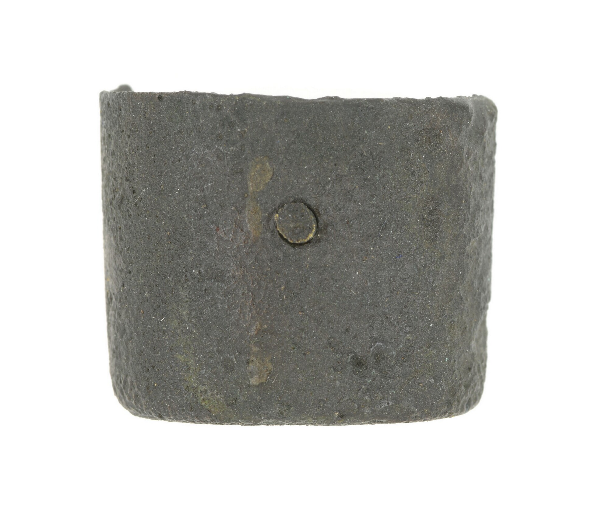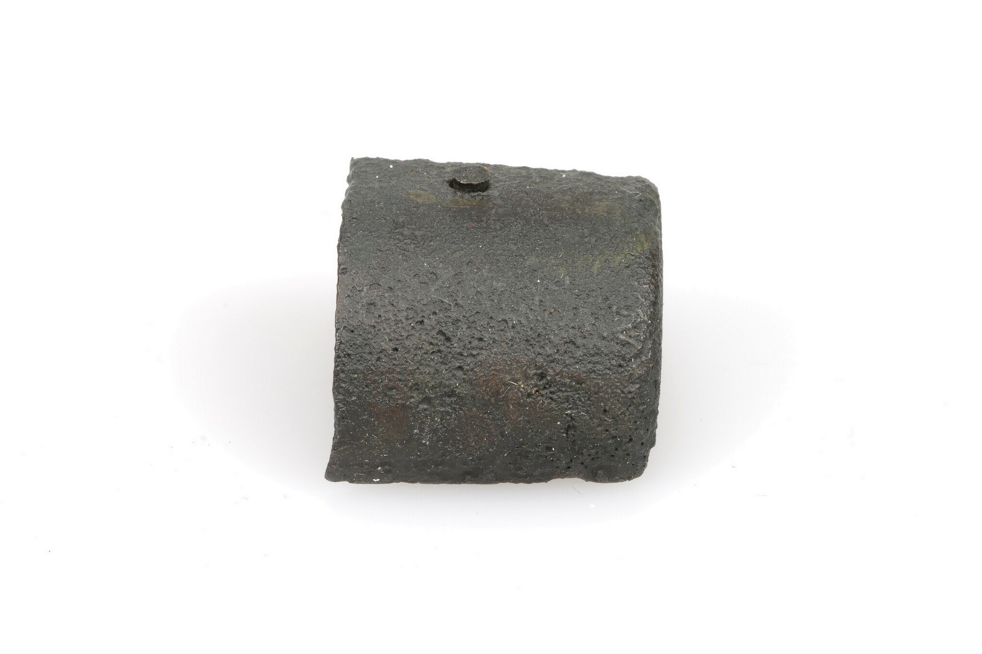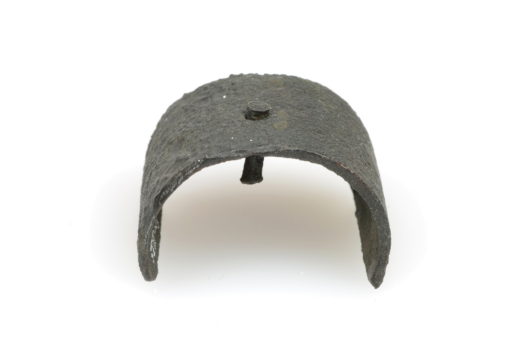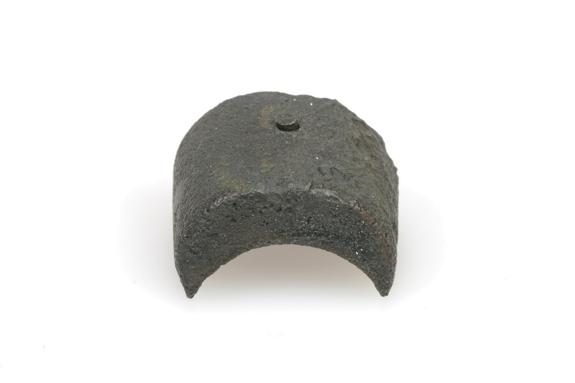 Beschermkapje; onderdeel musket; oorspronkelijk bevestigd aan de voorzijde van de loop van een musket; 1 bevestigingsgat, bevestigingspen nog aanwezig; herkomst: Groot-Brittanië