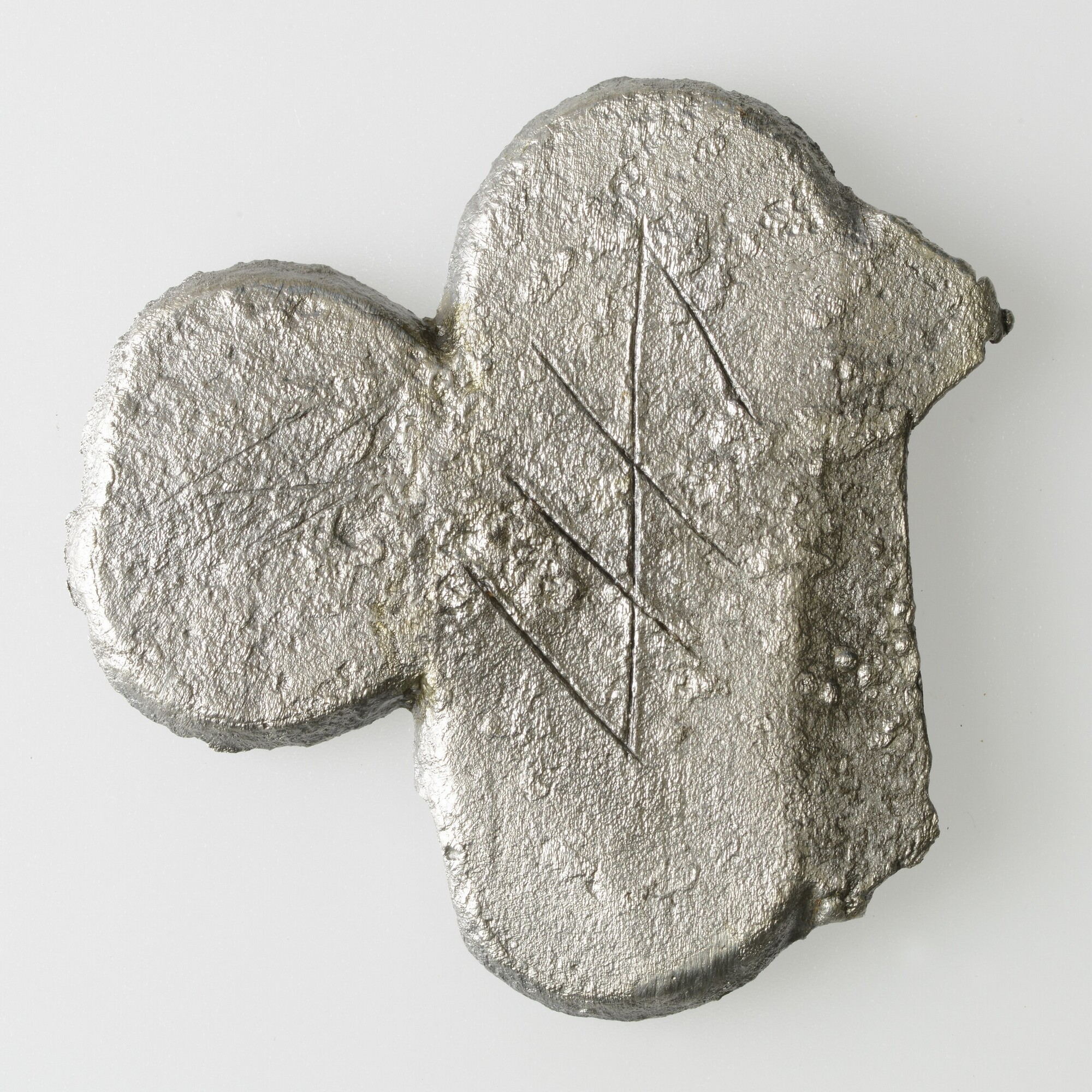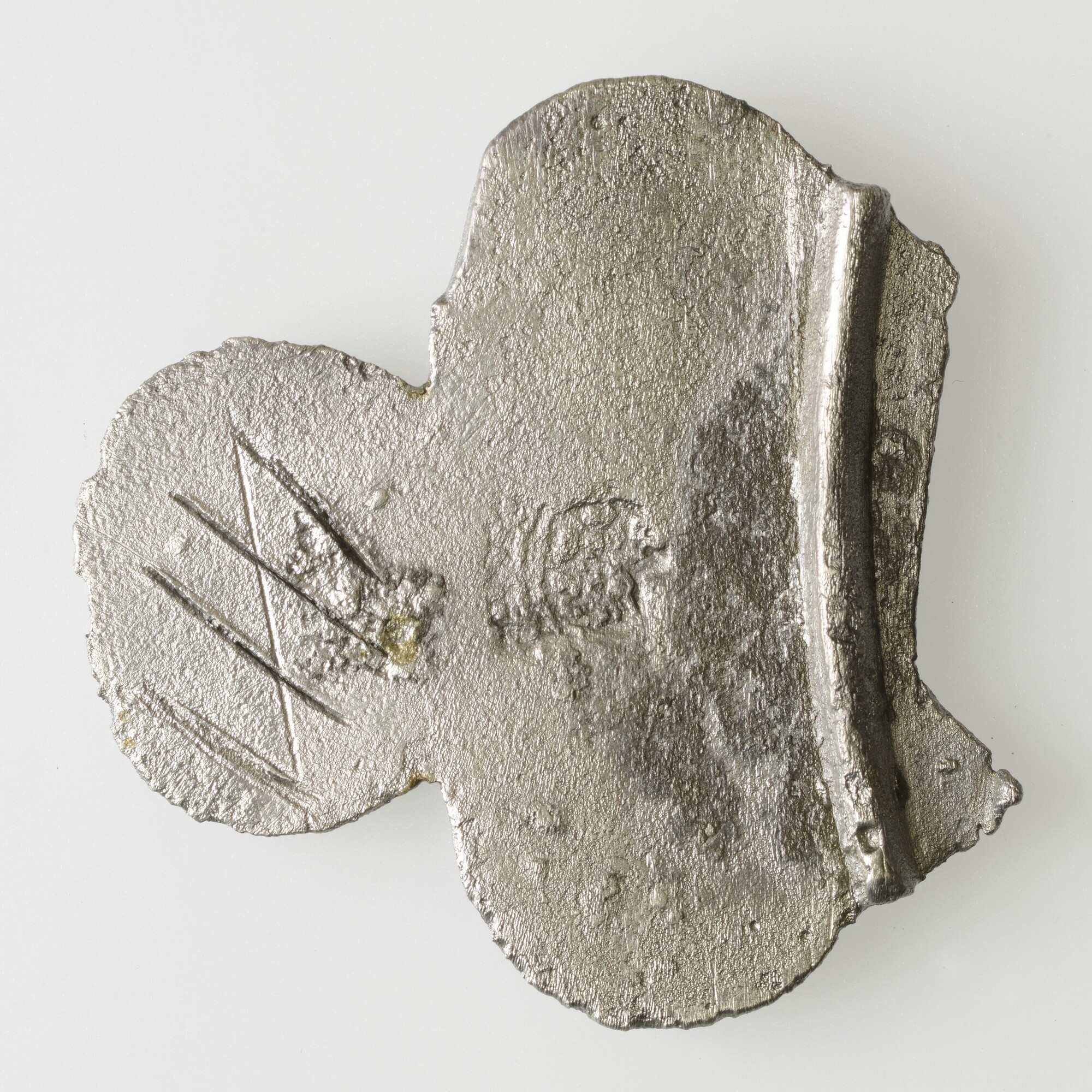 Brandewijnkom; drielobbige greep met ingekraste huismerken (stok met vier strepen) op zowel de voor- als de keerzijde