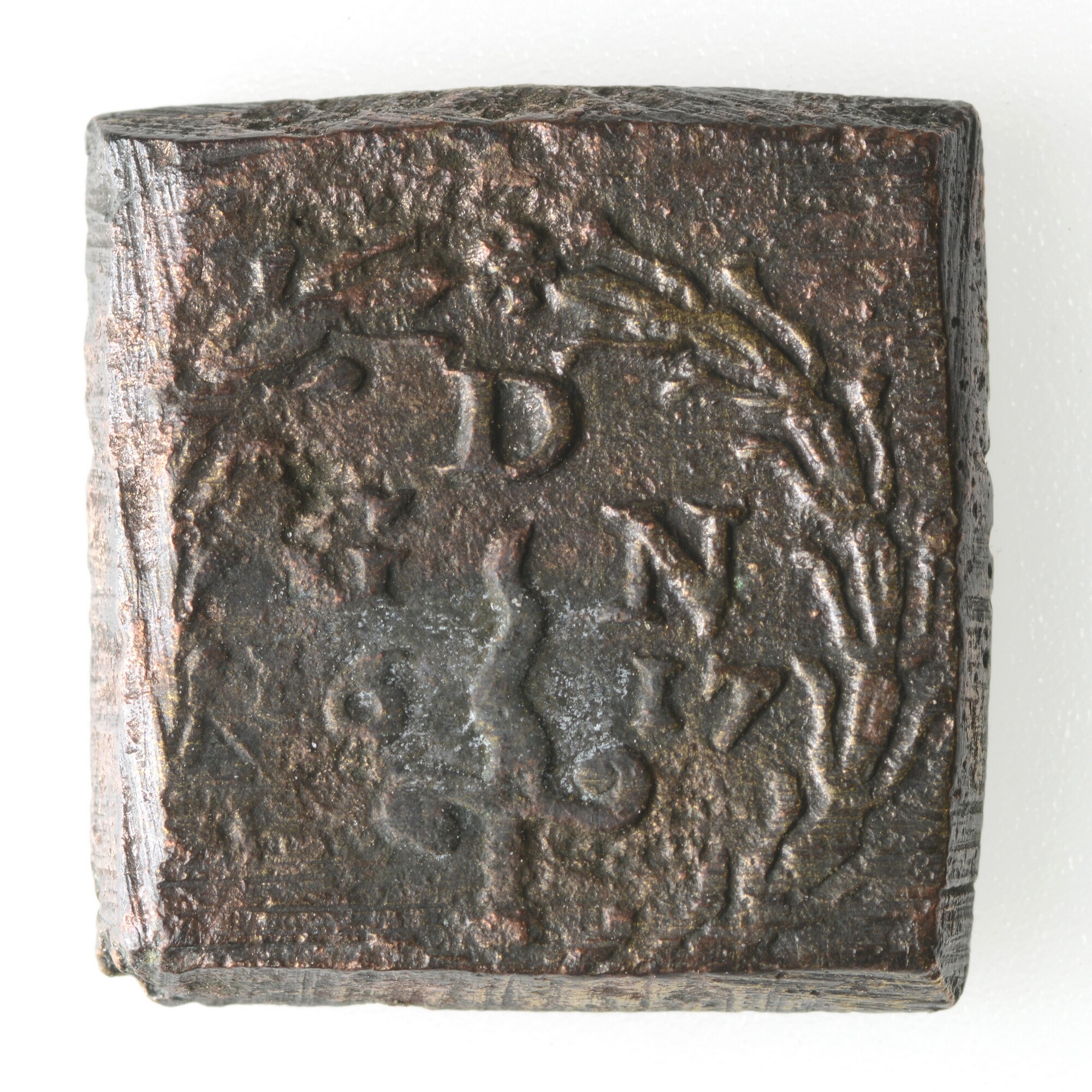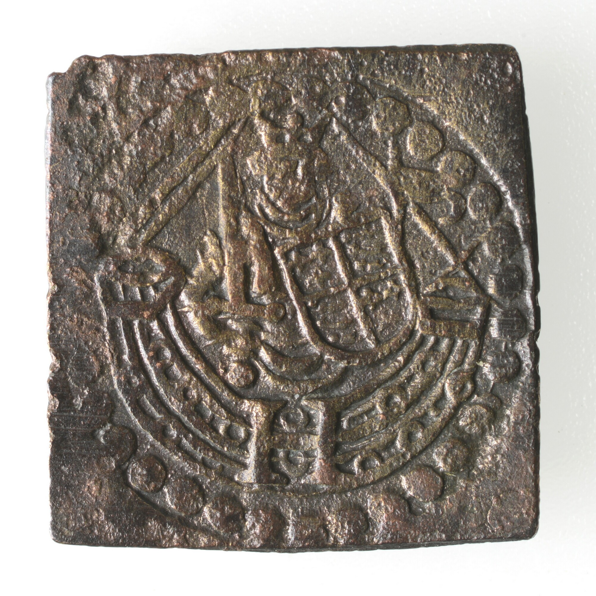 Muntgewicht Henricusnobel; vz.: koning met kroon, zwaard en schild in een koggenschip. Op het koggenschip staat de letter H; kz.: binnen een lauwerkrans een kris, de letters DGN en het jaartal 1617; Amsterdam; gewicht: 3.26 gram