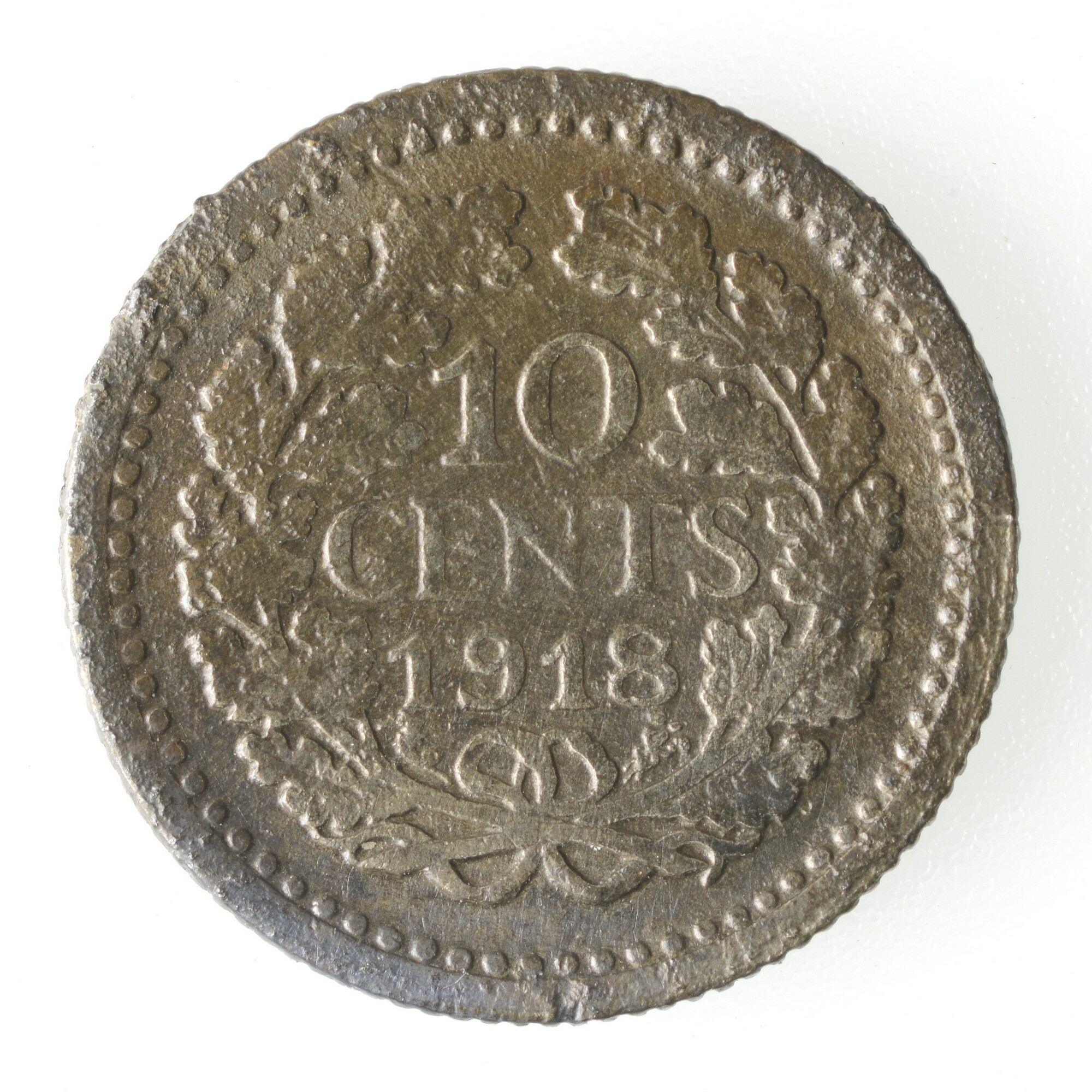 Dubbeltje; Nederland Koninkrijk (1813-heden); Wilhelmina (1890-1948); vz.: gedrapeerde buste met hermelijnen mantel naar rechts, met omschrift WILHELMINA KONINGIN DER NEDERLANDEN; kz.: binnen een bladerkrans in vier regels: 10 / CENTS / 1918; muntplaats: Utrecht; gewicht: 1.33 gram