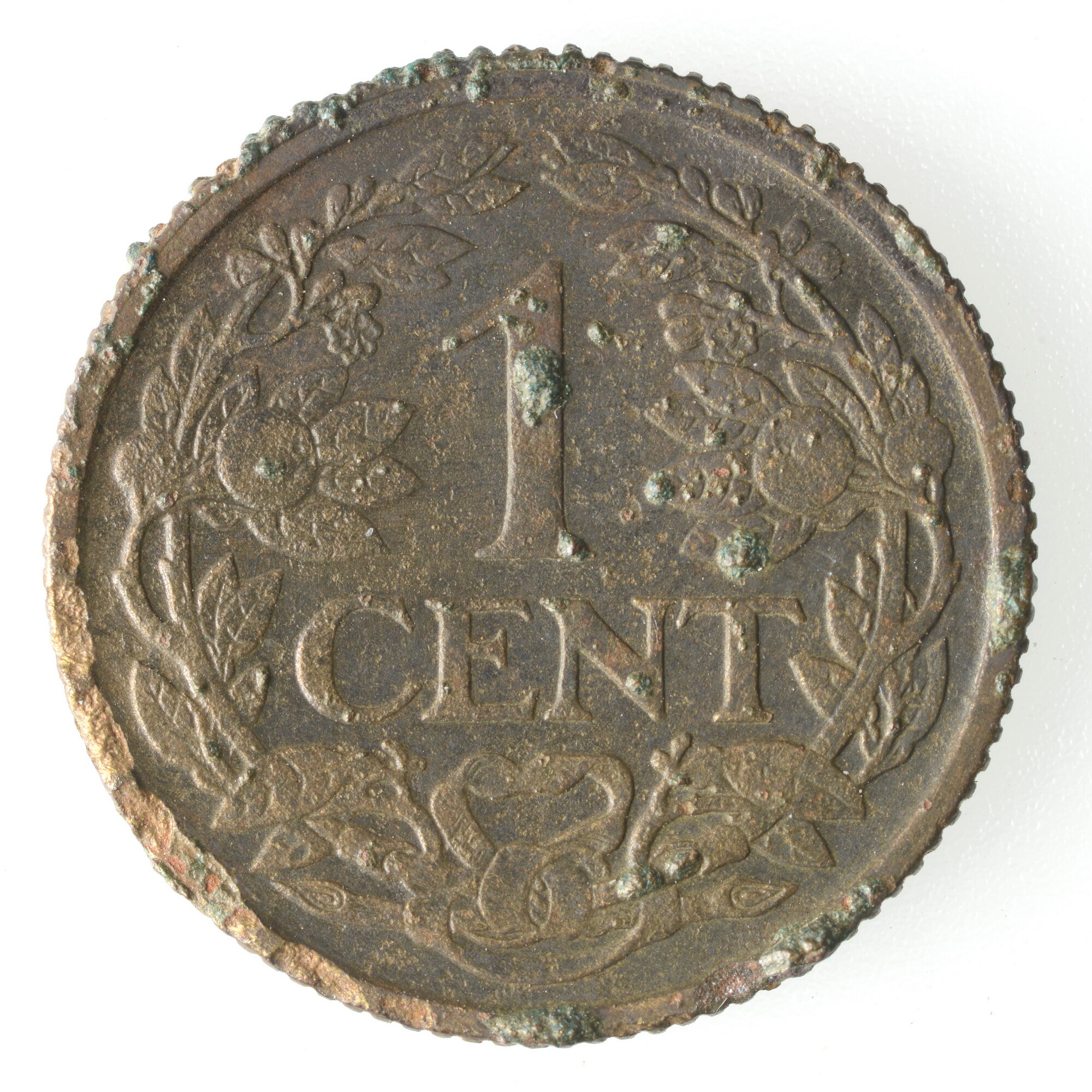 1 Cent Nederland Koninkrijk (1813-heden); Wilhelmina (1890-1948); vz.: klimmende leeuw naar links met zwaard en pijlenbundel op een veld van azuur met zeventien blokken binnen parelcirkel, met omschrift (zeepaardje) KONINGRIJK DER NEDERLANDEN (mercuriusstaf) 1917; kz.: binnen een krans van twee samengebonden oranjetakken in twee regels: 1 / CENT; muntplaats: Utrecht; gewicht: 2.45 gram
