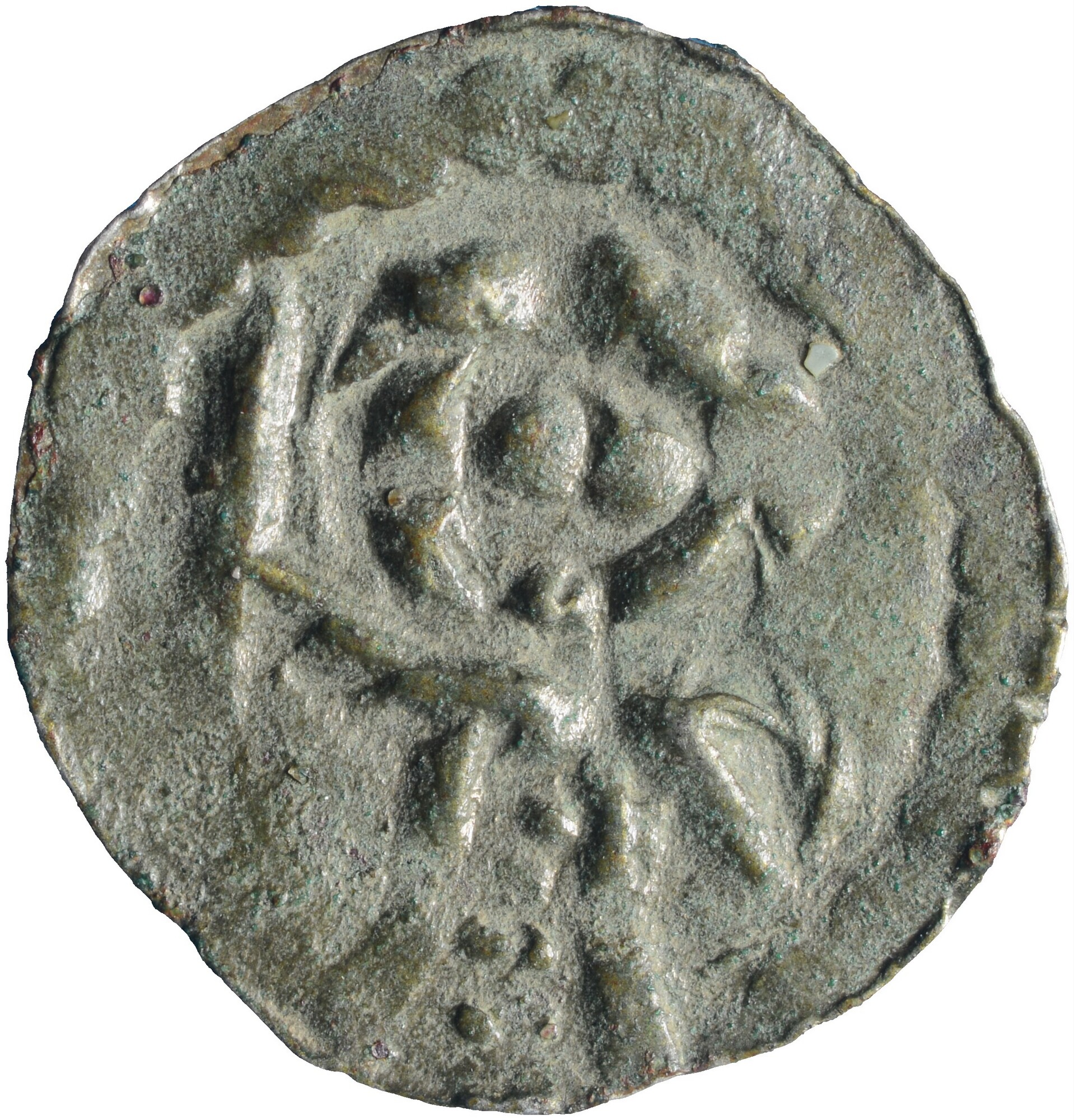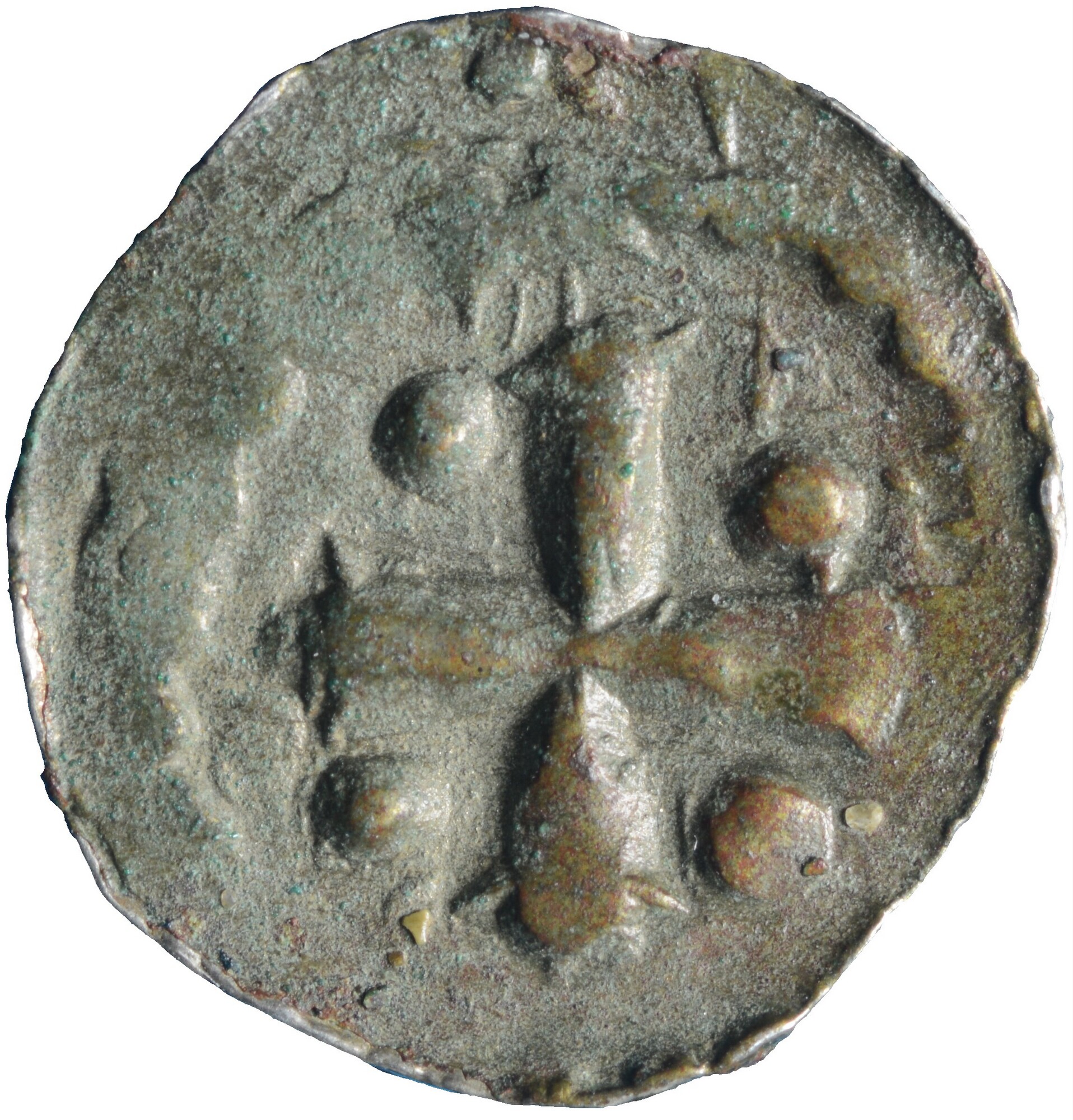 Penning; Holland Graafschap?; vz.: staand personage met zwaard naar rechts binnen een cirkel; kz.: kort gevoet kruis met punten in de kwadranten binnen een cirkel; muntplaats: onbekend; gewicht: 0.50 gram; uiterst zeldzaam; referentie: vdChijs XLIV, nog later ontdekte muntjes 1. Dit exemplaar is gevonden in het Adelbertusputje in Egmond
