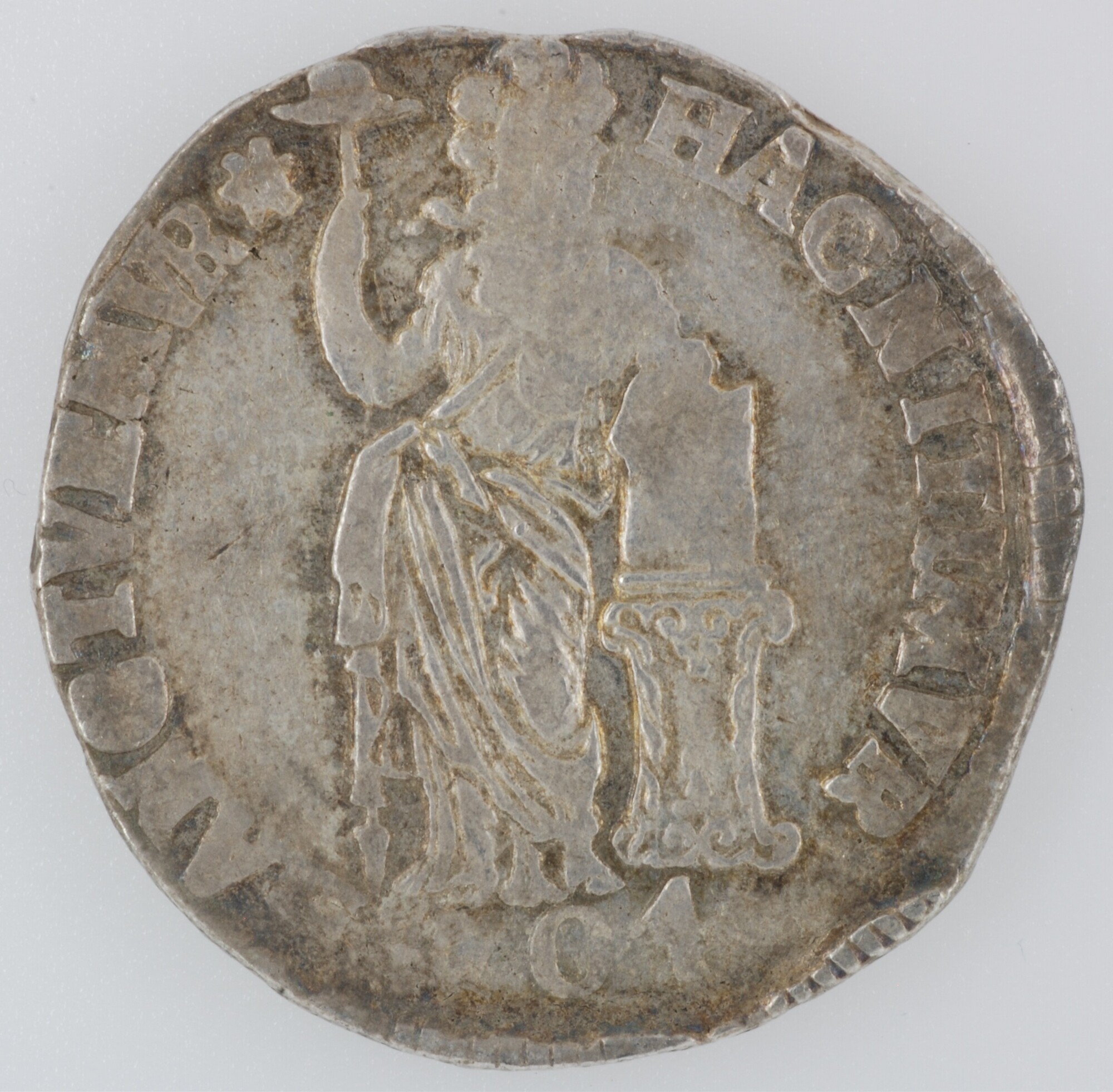 Gulden; Overijssel Provincie (1581-1795); vz.: gekroond generaliteitswapen met ter weerszijden waardeaanduiding 1 – G, met omschrift MO ARG ORD FAED BELG TRANS; kz.: Nederlands maagd, in de rechterhand een speer waarop een vrijheidshoed, met de linkerelleboog steunend op een rechtop op een zuil staande bijbel met in afsnede 1704, met omschrift HAC NITIMVR – [H]ANC ...