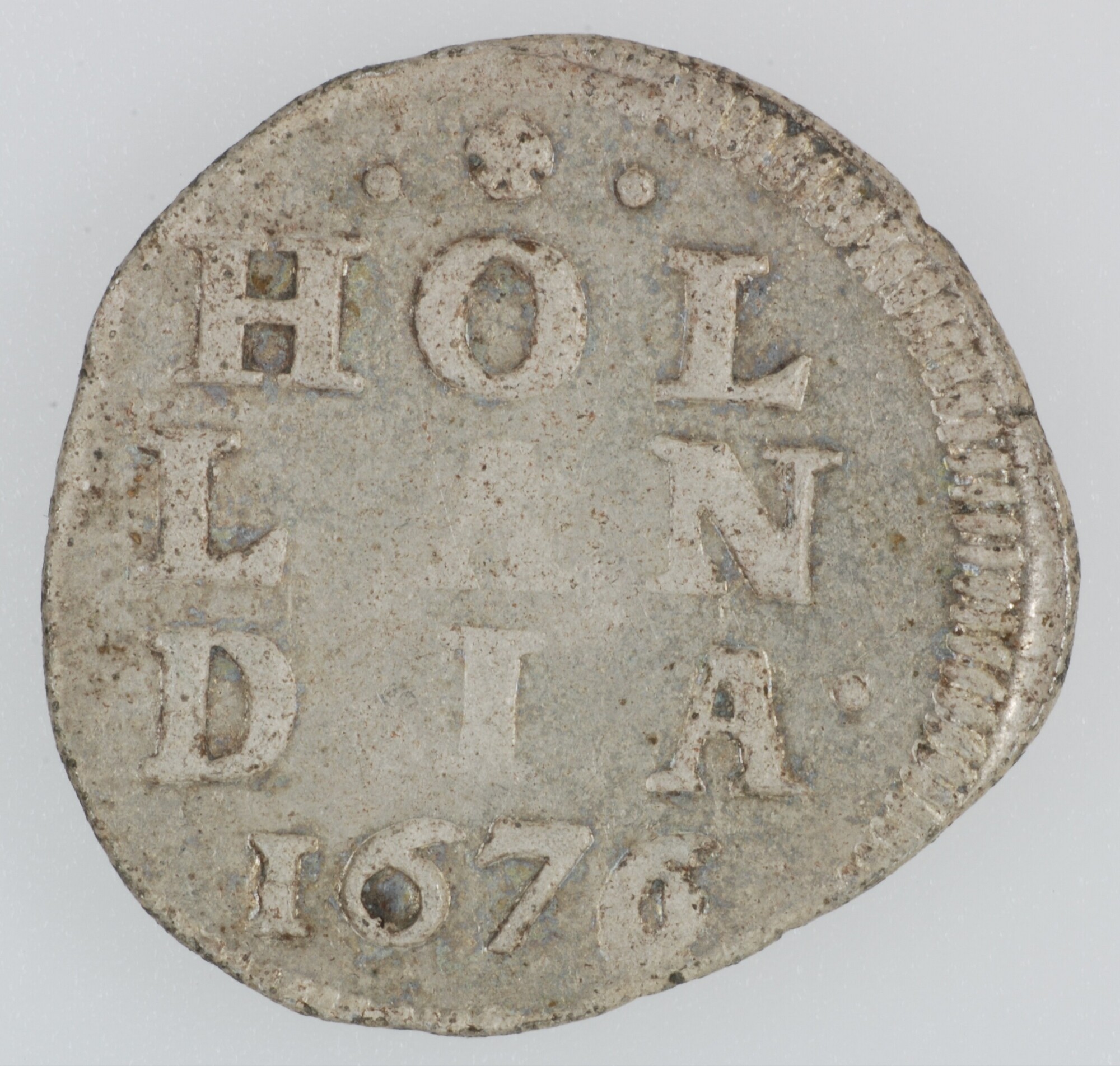 Dubbele wapenstuiver; Holland Provincie (1581-1795); vz.: in vier regels: • (rozet) • HOL / LAN / DIA • / 1676; gekroond provinciewapen met 2 – S ter weerszijden; muntplaats: Dordrecht; gewicht: 1.54 gram; referentie: CNM 2.28.118