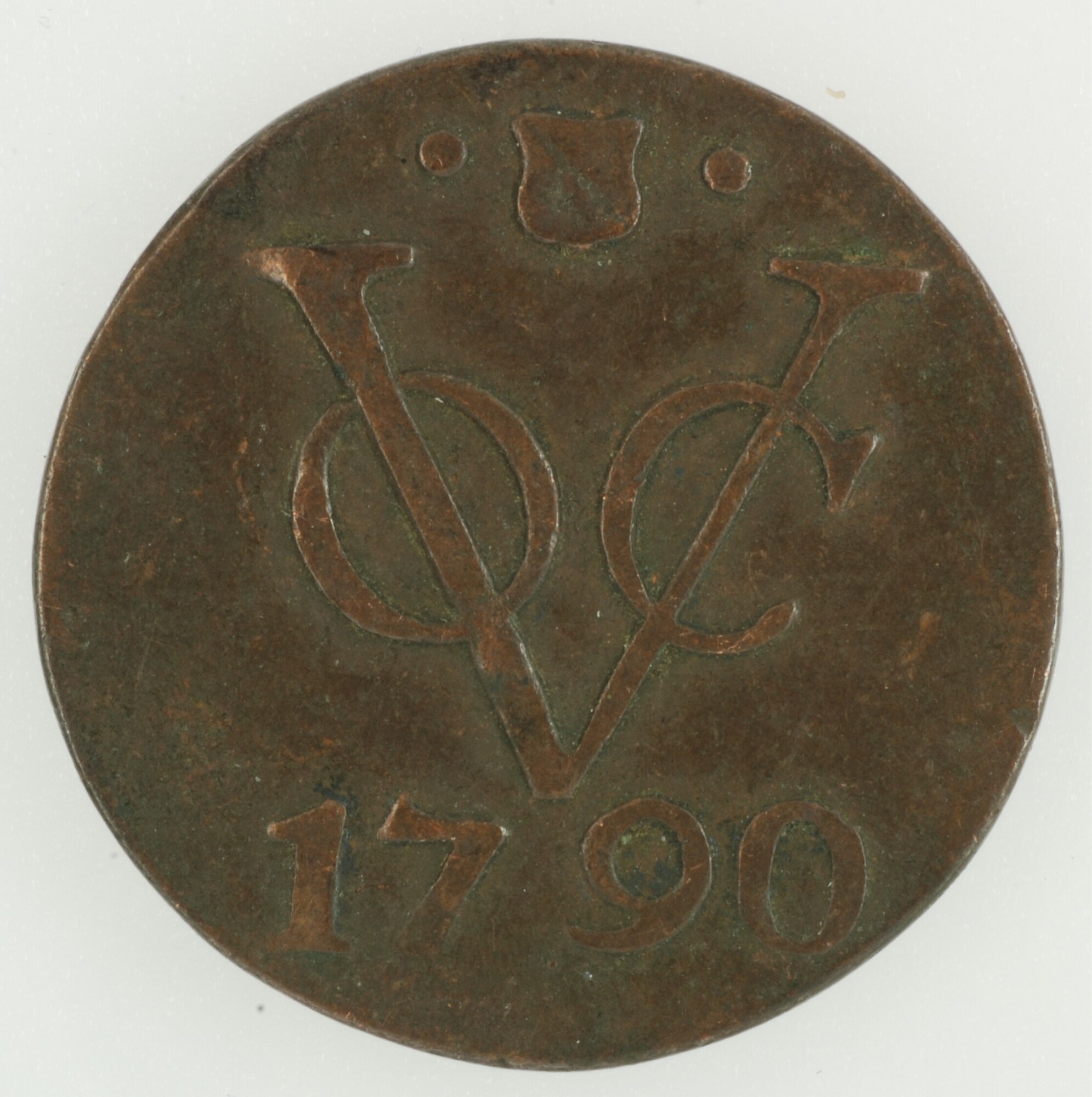 Dubbele duit; Utrecht; Verenigde Oost-Indische Compagnie; vz.: gekroond wapenschild van de stad Utrecht, gehouden door twee leeuwen; kz.: in drie regels: (ster) / monogram VOC / 1790; muntplaats: Utrecht; gewicht: 2.90 gram; referentie: Scholten 743