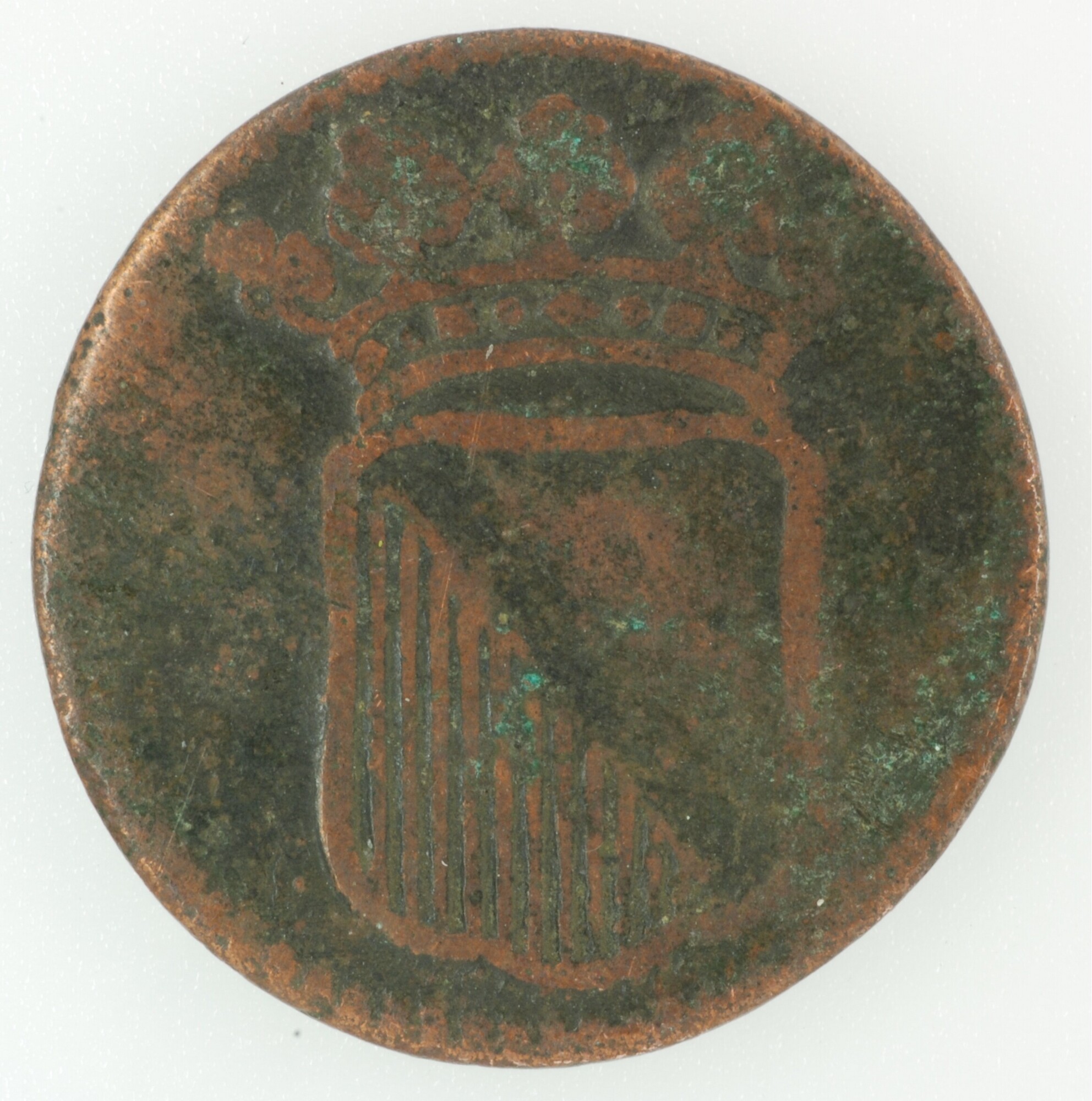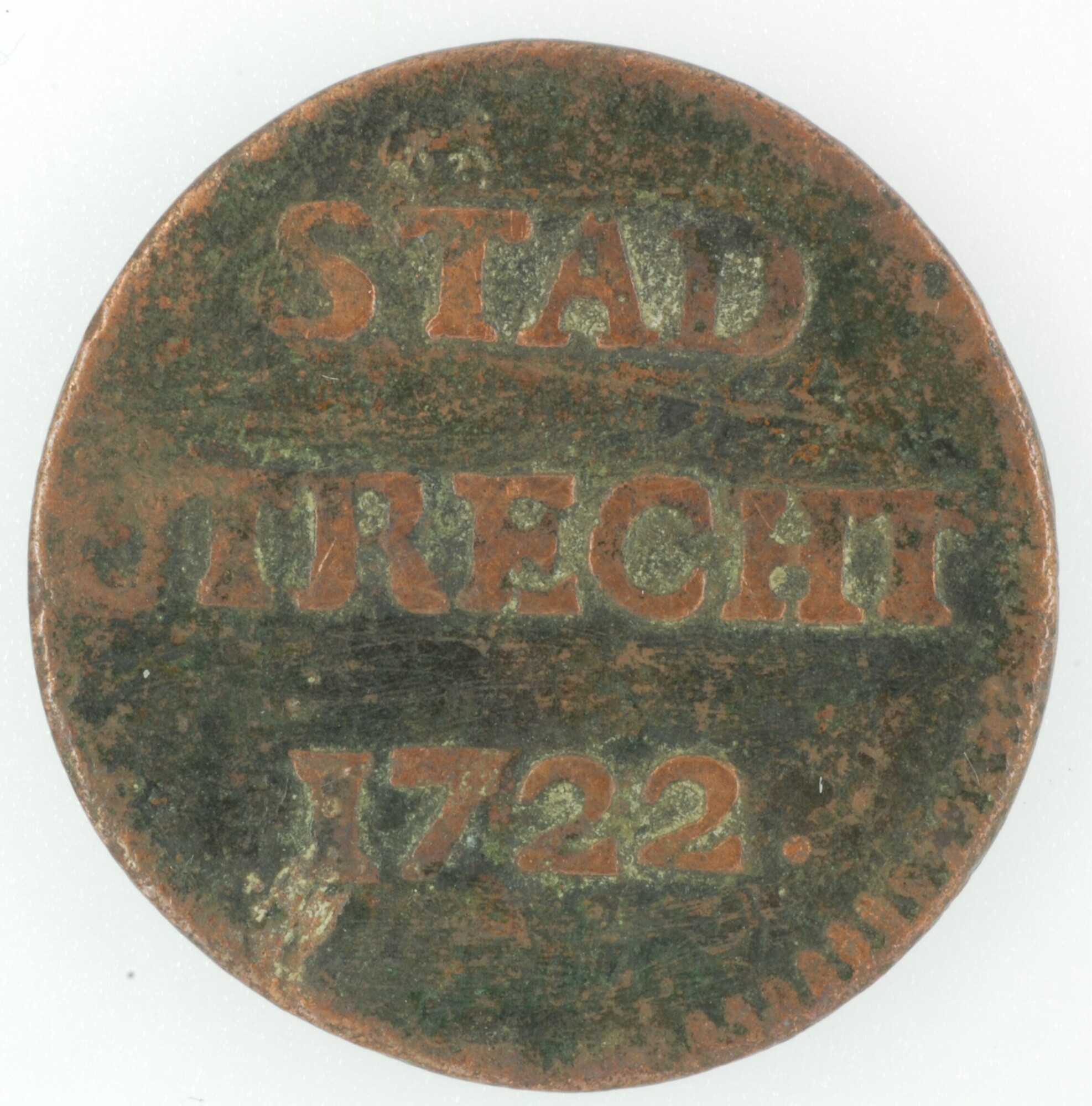 Duit; Utrecht Stad (1581-1795); vz.: in drie regels: STAD / UTRECHT / 1722; kz.: gedamasceerd stedelijk wapenschild; muntplaats: Utrecht; gewicht: 3.28 gram; referentie: Purmer / Wiel 5110, CNM 2.44.20