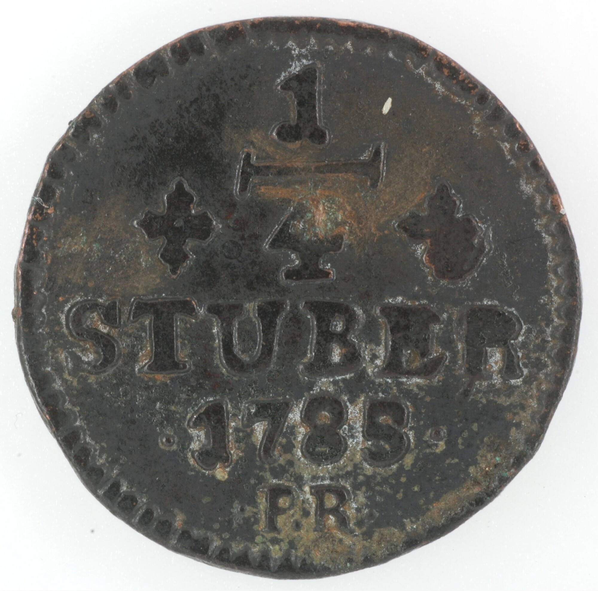 Kwart stuber; Duitsland; Duitse Staten; Gulik-Berg; Karel Theodoor (1742-1799); vz.: monogram van Düsseldorf, met omschrift GULICH•UND•BERGISCHE•LANDMUNZ; kz.: in vier regels: ster ¼ ster / STUBER / •1785• / •P•R•; muntplaats: Düsseldorf; gewicht: 3.60 gram; referentie: Krause / Mishler 205