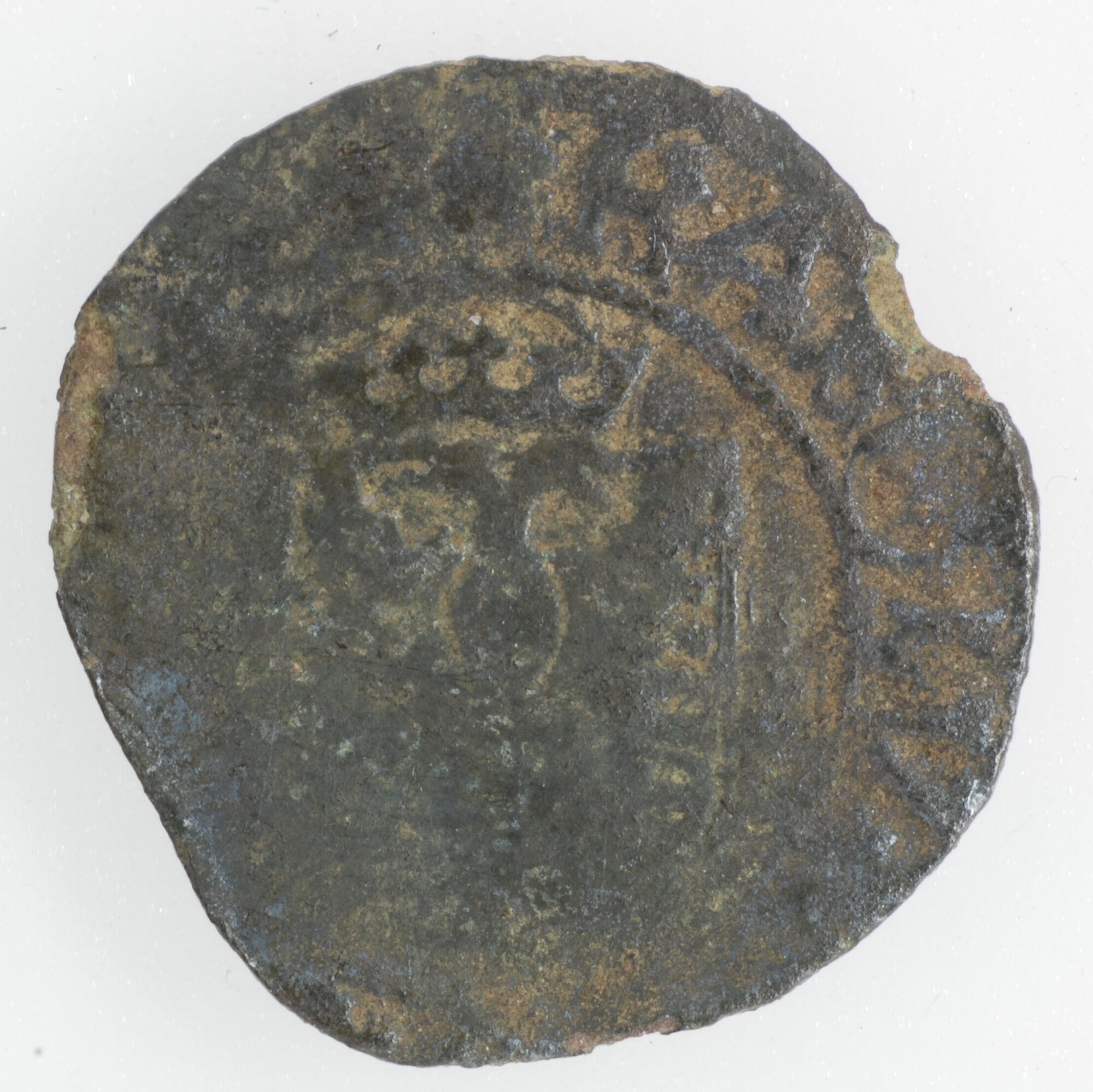 Hollandse penning; Holland Graafschap (1049-1581); Karel V (1506-1555); vz.: gekroond wapenschild met dubbelkoppige adelaar met omschrift (rozet) KAROLV[S+D+G+ROM+IMP(ET)+H]; kz.: dubbellijnig gevoet kruis met rozet in het hart met omschrift D[A•M / VIRT / CO(TR) / HOS(T)•T]; muntplaats: Dordrecht; gewicht: 0.68 gram; referentie: Gelder / Hoc 195-6a, vHoudt II 236.DOa
