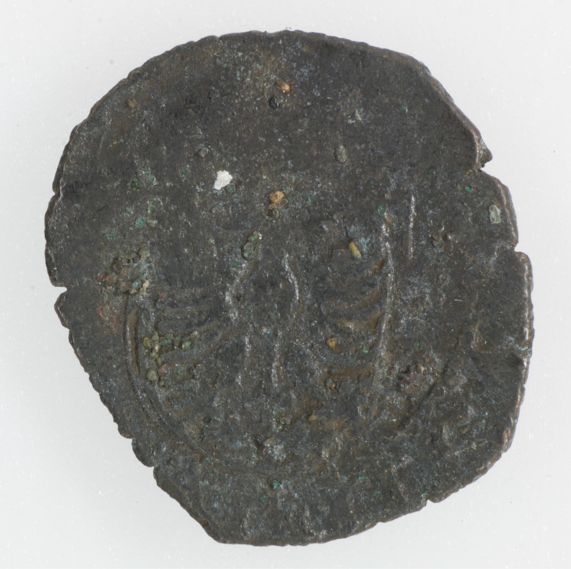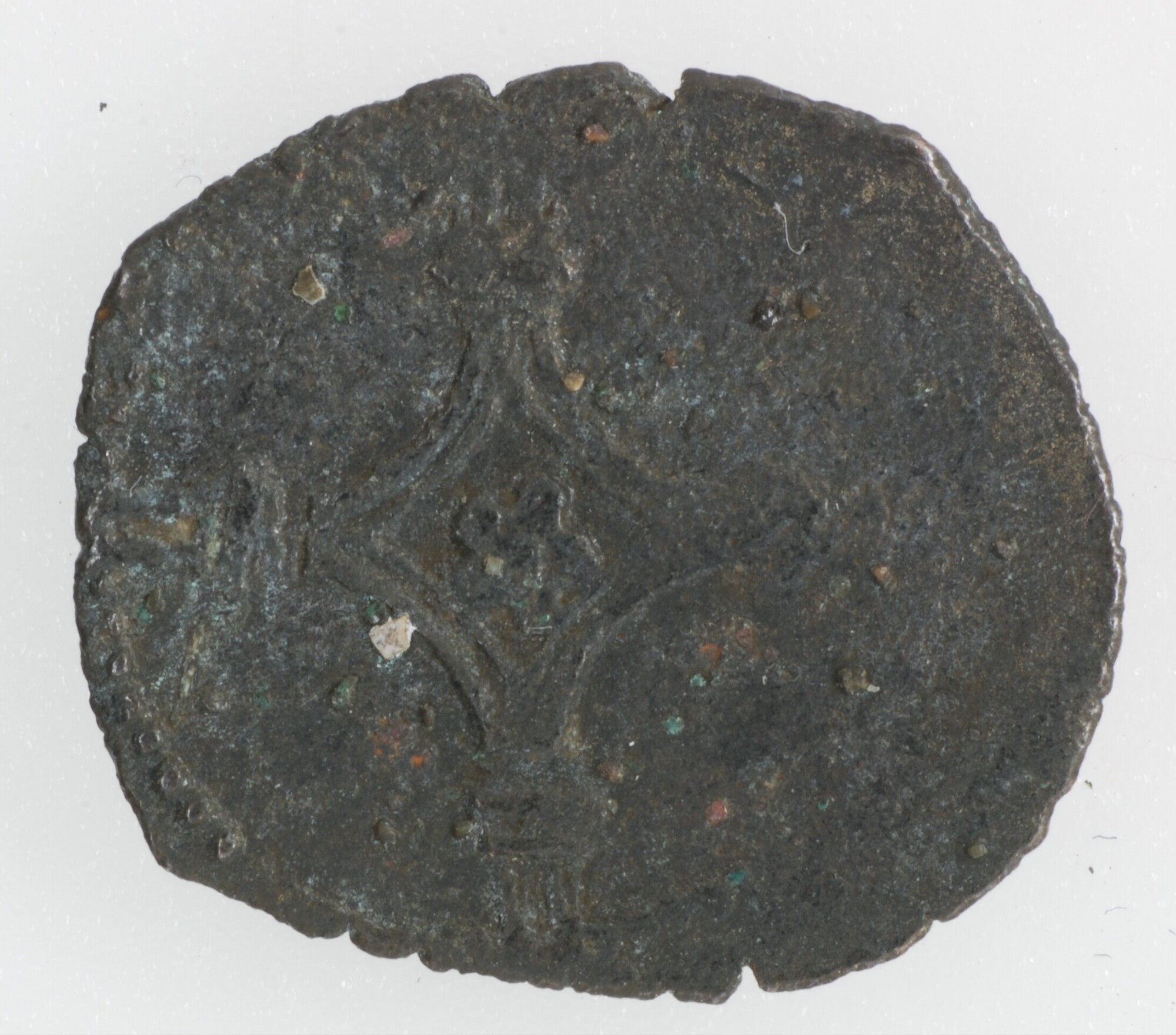 Hollandse penning; Gelre Hertogdom (1339-1581); Karel V (1506-1555); vz.: [KAR•]D•[G•ROM•IM(PET)•H] gekroond wapenschild met dubbelkoppige adelaar met omschrift ; kz.: dubbellijnig gevoet kruis met rozet in het hart met omschrift D[A•M / VIRT / CO(TR) / HOS(T)•T]; muntplaats: Nijmegen; gewicht: 0.52 gram; referentie: Gelder / Hoc 195-4, vHoudt II 236.NIJ
