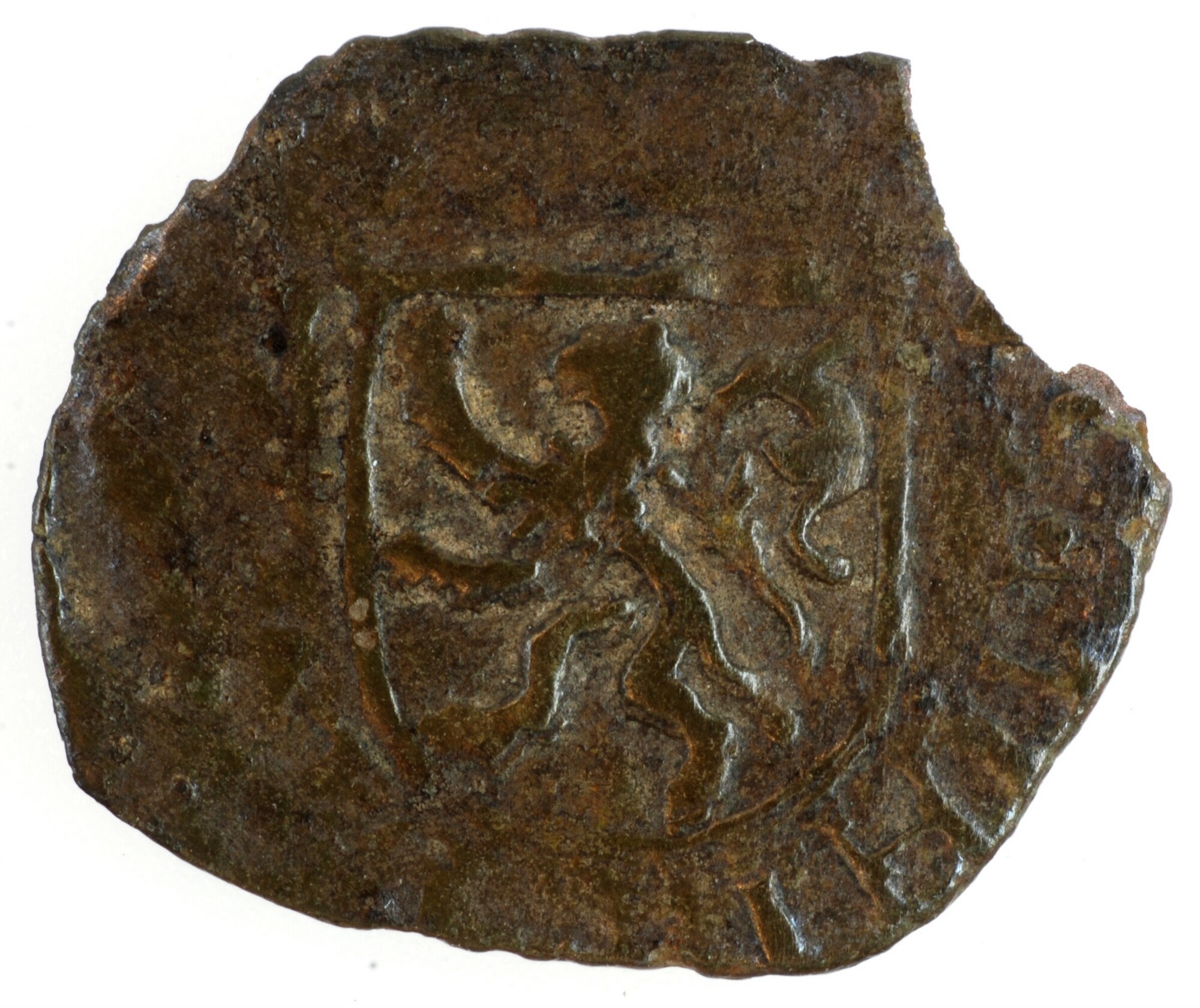 Hollandse penning; Holland Graafschap (1049-1581); Philips II (1555-1598); vz.: gekroonde letter P binnen parelcirkel, met omschrift [(rozet)] D•G•HISP •ANG•Z•RE[X•C•H]; kz.: gekroond wapenschild met klimmende leeuw naar links binnen parelcirkel, met omschrift [DN]S•MIHI[•AD]IV[TOR]; muntplaats: Dordrecht; gewicht: 0.42 gram; referentie: Gelder / Hoc 228-11a, vHoudt II 279.DO