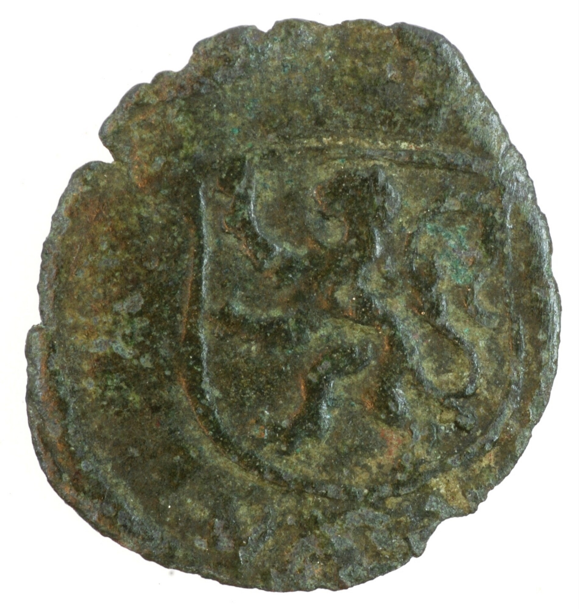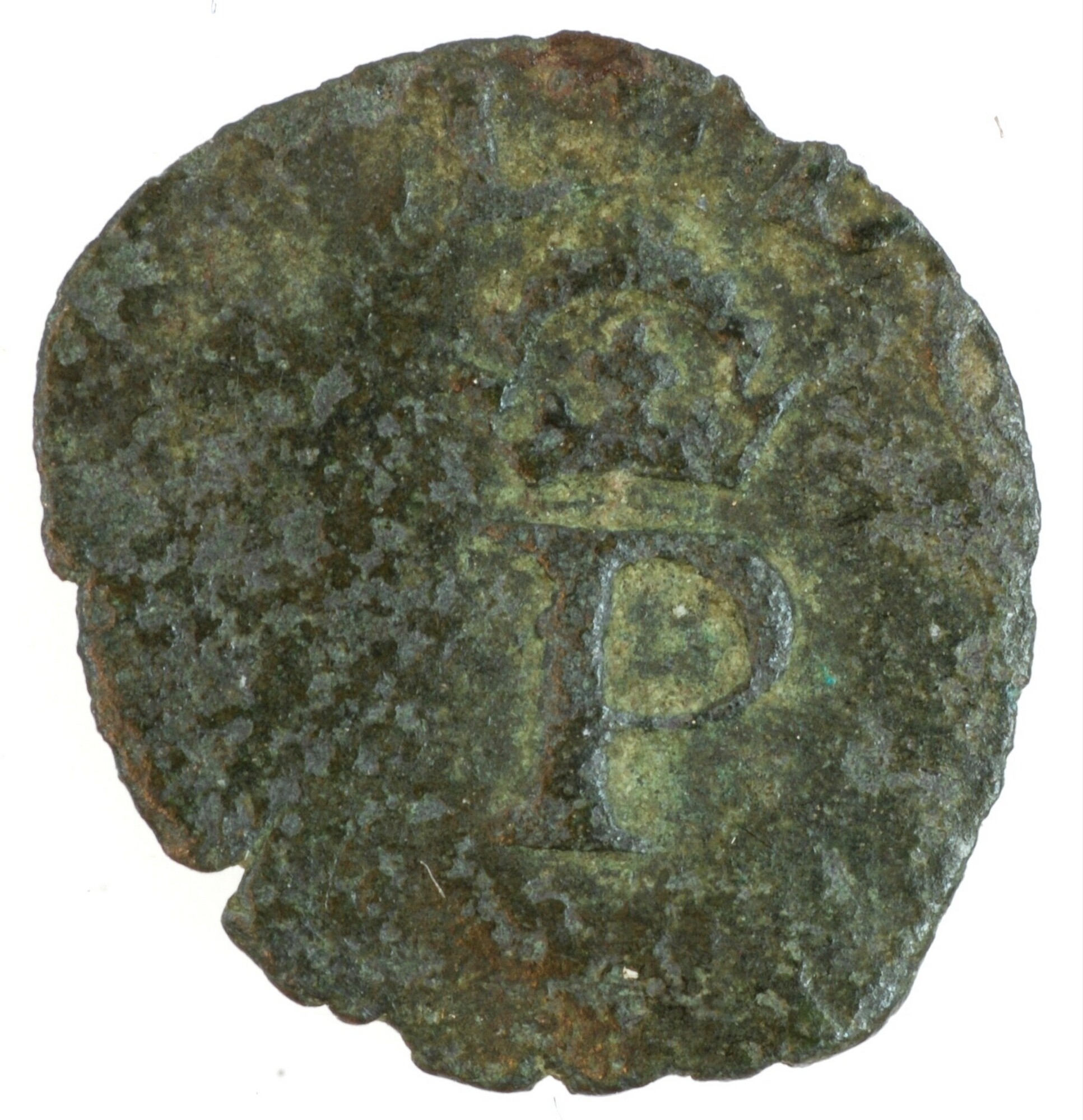 Hollandse penning; Holland Graafschap (1049-1581); Philips II (1555-1598); vz.: gekroonde letter P binnen parelcirkel, met omschrift (rozet) D•G[•HIS•REX•CO•H]OL[…]; kz.: gekroond wapenschild met klimmende leeuw naar links binnen parelcirkel, met omschrift [DNS MIHI ADIVTOR]; muntplaats: Dordrecht; gewicht: 0.30 gram; referentie: Gelder / Hoc 228-11b, vHoudt II 279.DO