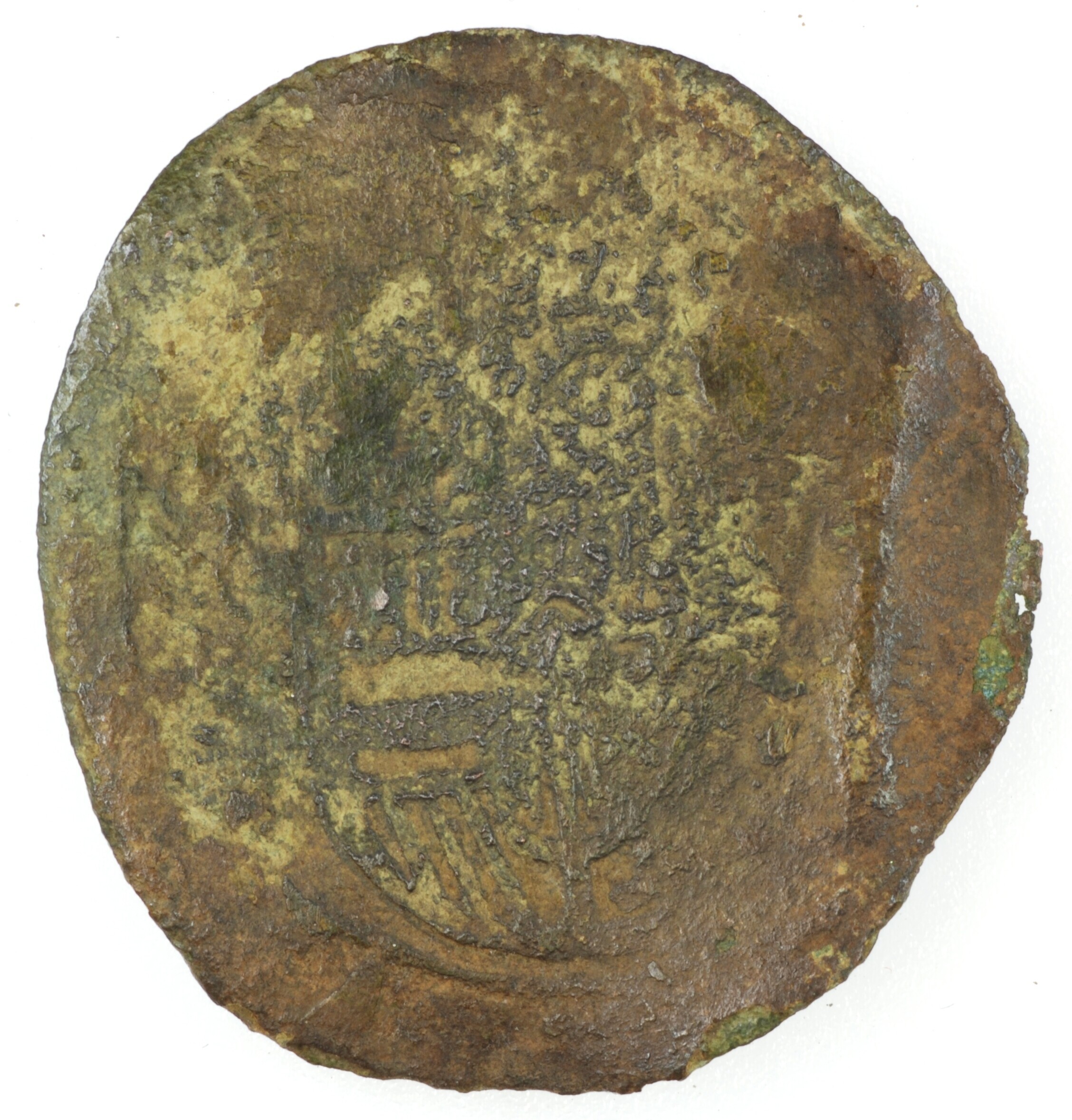 Oord; Albert & Isabella (1598-1621); vz.: gekroond vuurijzer omgeven door drie wapenschildjes binnen een parelcirkel met omschrift […]X; kz.: gekroond Spaans wapenschild met meerdere kwartieren met omschrift: .[…]; gewicht: 1.76 gram; referentie: Purmer / Wiel , CNM