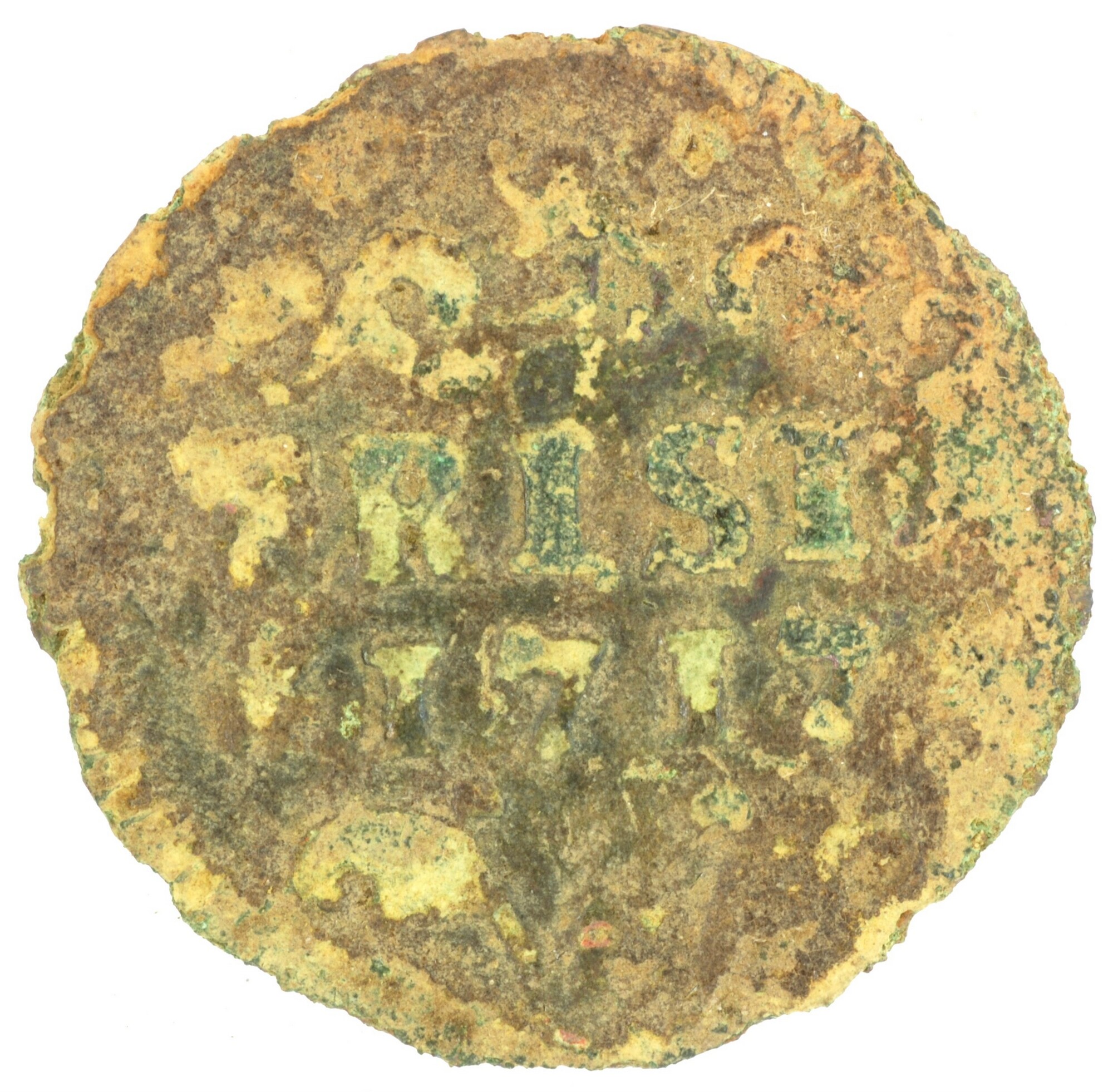 Duit; Friesland Provincie (1581-1795); vz.: in vier regels: muntteken klimmende leeuw tussen twee bladornamenten / FRISIA / (rozet) 1717 (rozet) / bladornament (rozet) bladornament; kz.: met open kroon gekroond wapenschild van Friesland met ter weerszijden naar boven krullende bladornamenten; muntplaats: Leeuwarden; gewicht: 1.94 gram; referentie: Purmer / Wiel 6009, CNM 2.16.145