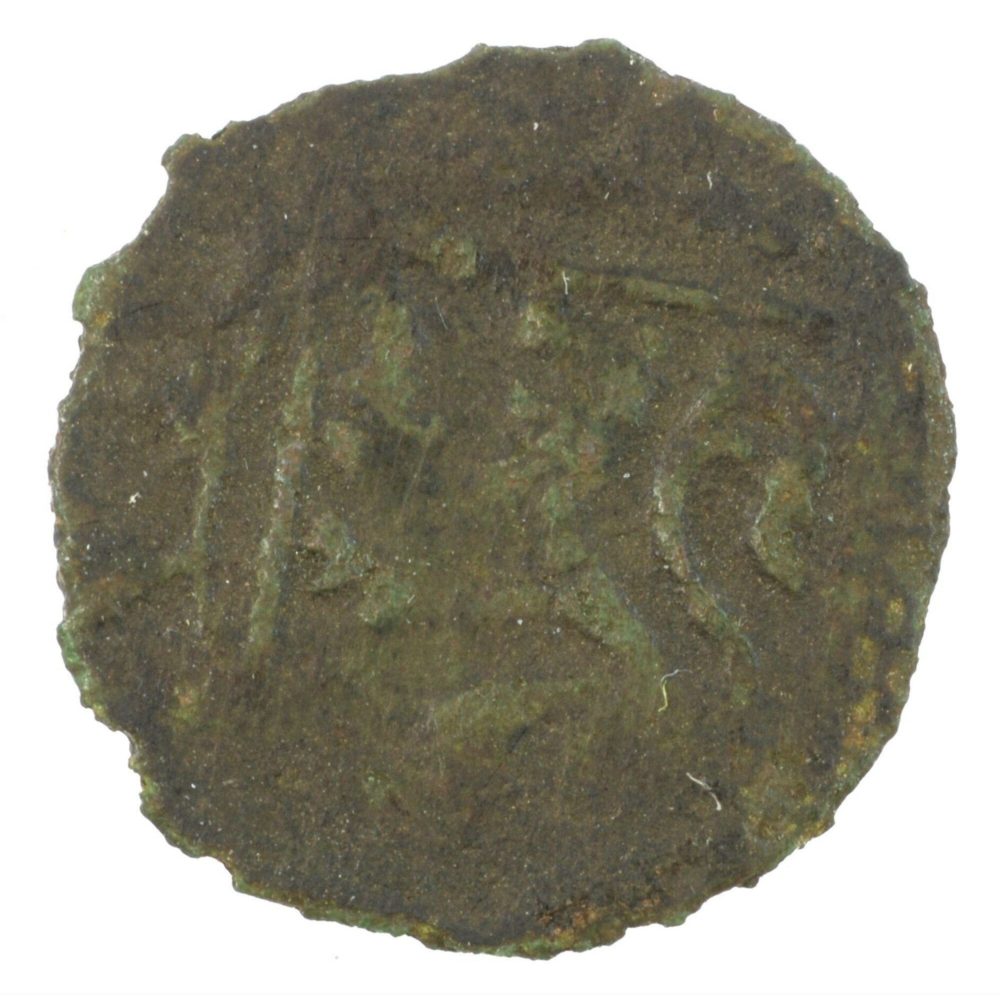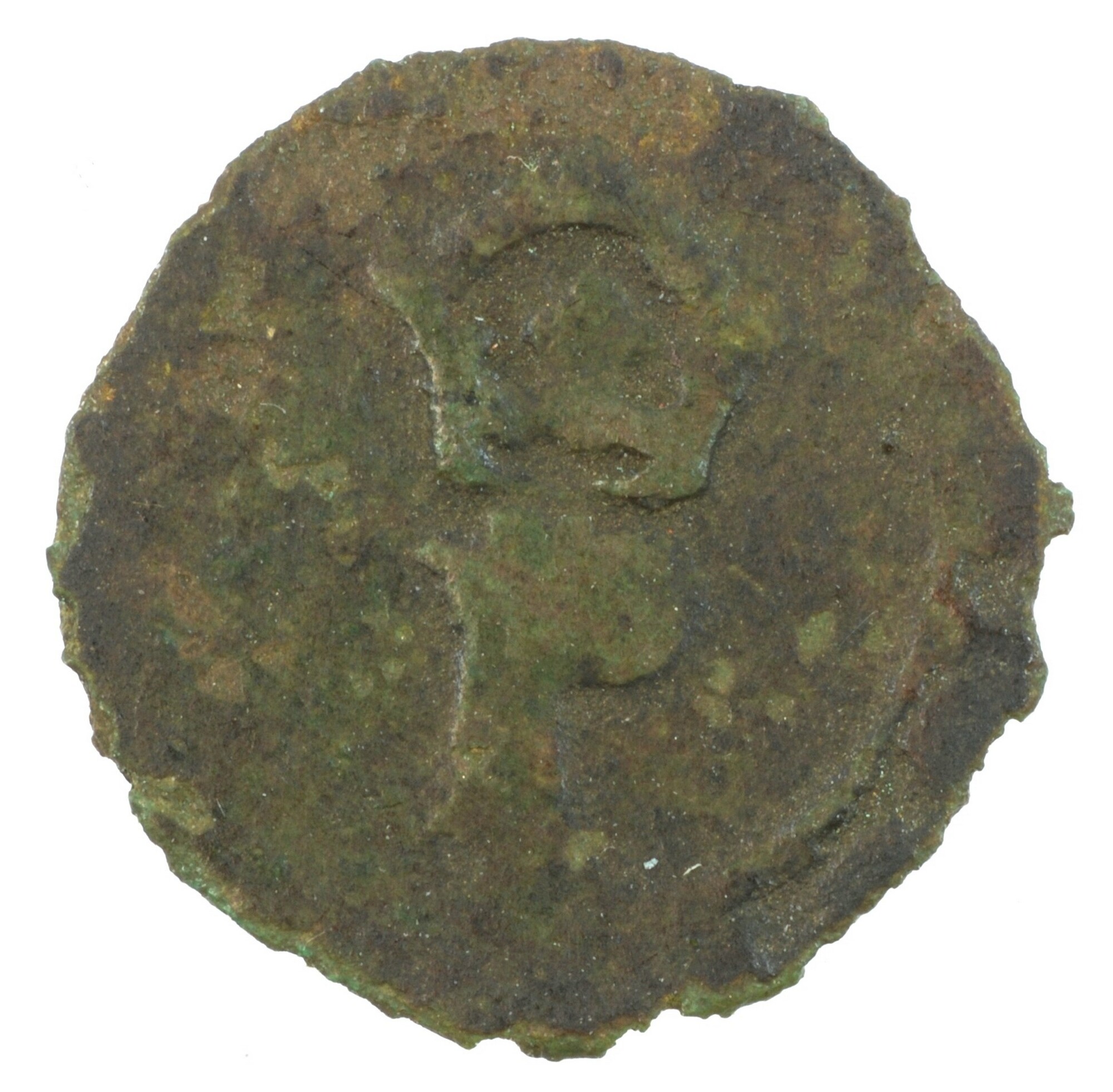 Hollandse penning; Philips II (1555-1598); vz.: gekroonde letter P binnen parelcirkel, met omschrift […]; kz.: gekroond wapenschild met klimmende leeuw naar links binnen parelcirkel, met omschrift [DNS•MICHI•ADI]VTO[R]; muntplaats: meerdere mogelijkheden; gewicht: 0.24 gram; referentie: Gelder / Hoc 228, vHoudt II 279
