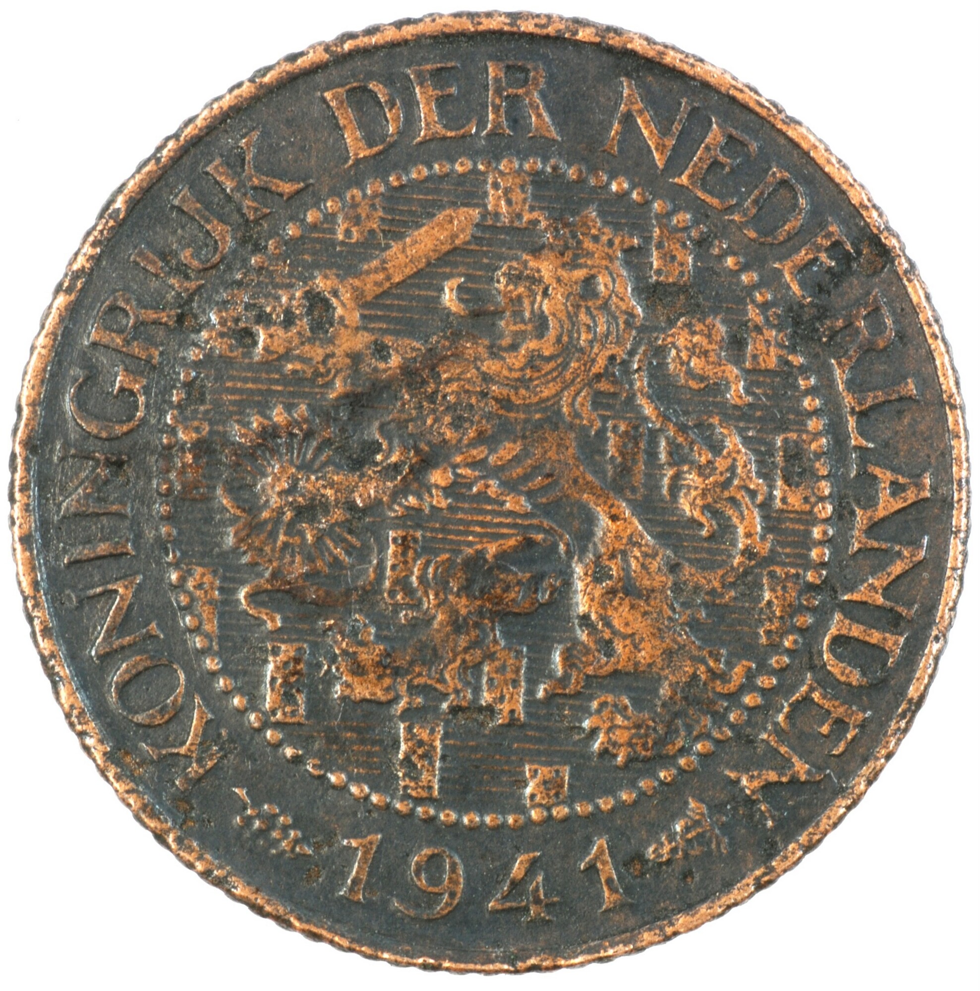 Cent; Nederland Koninkrijk (1813-heden); Wilhelmina (1890-1948); vz.: klimmende leeuw naar links met zwaard en pijlenbundel op een veld van azuur met zeventien blokken binnen parelcirkel, met omschrift (druiventros) KONINGRIJK DER NEDERLANDEN (mercuriusstaf) 1941; kz.: binnen een krans van twee samengebonden oranjetakken in twee regels: 1 / CENT; muntplaats: Utrecht; 2.38 gram; referentie: Schulman 998
