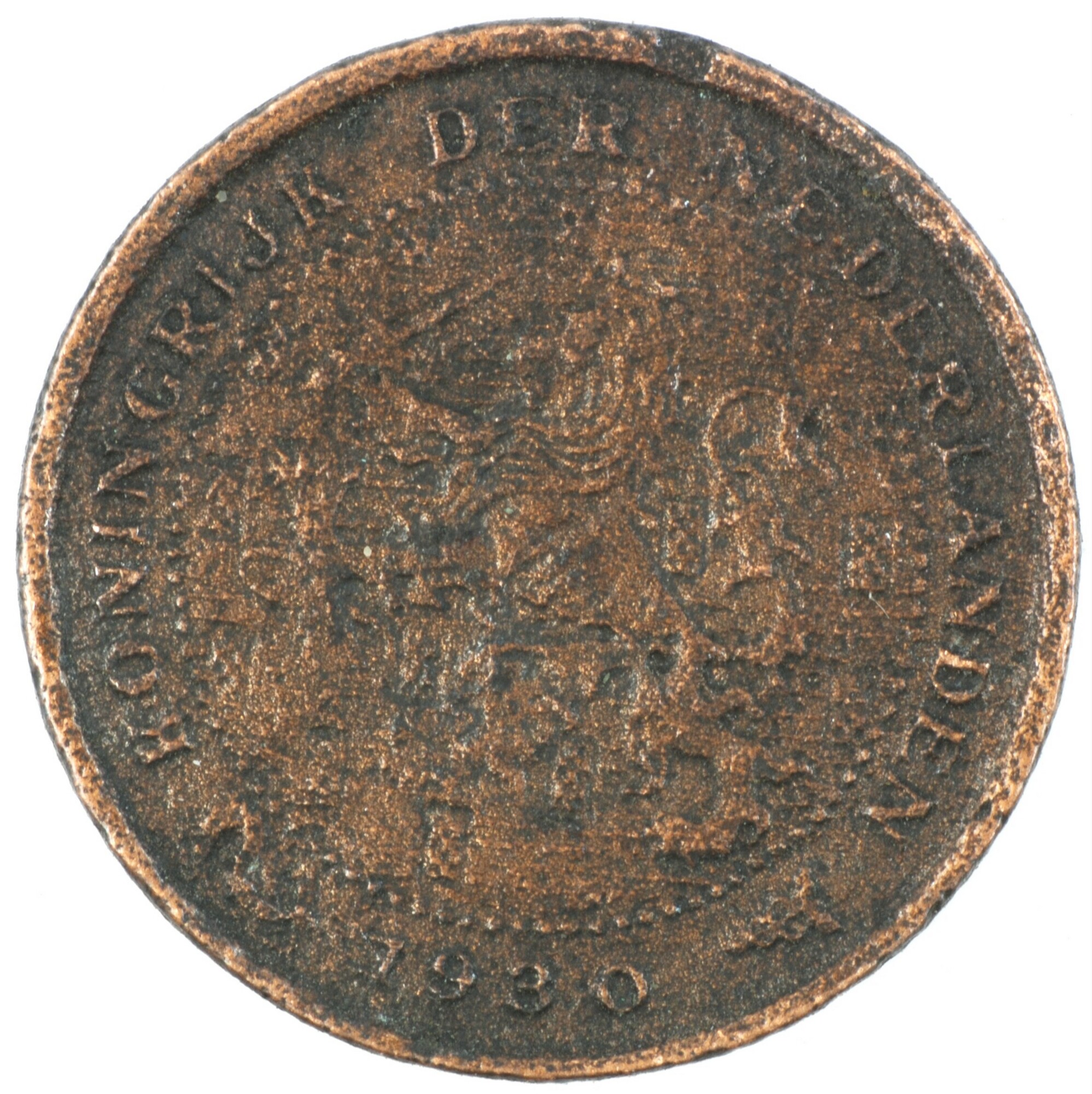 Halve cent; Nederland Koninkrijk (1813-heden); Wilhelmina (1890-1948); vz.: klimmende leeuw naar links met zwaard en pijlenbundel op een veld van azuur met zeventien blokken binnen parelcirkel, met omschrift (zeepaardje) KONINGRIJK DER NEDERLANDEN (mercuriusstaf) 1930; kz.: binnen een krans van twee samengebonden oranjetakken in twee regels: ½ / CENT; muntplaats: Utrecht; gewicht: 1.02 gram; referentie: Schulman ...