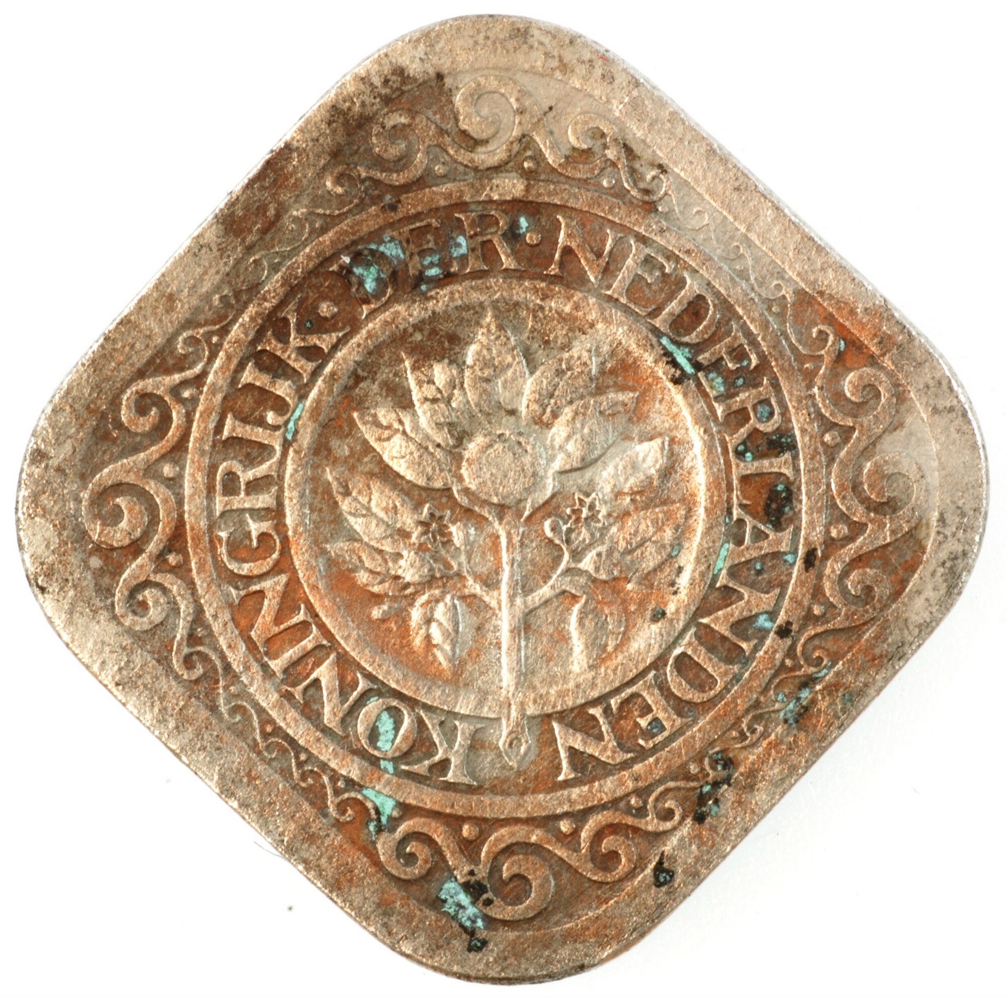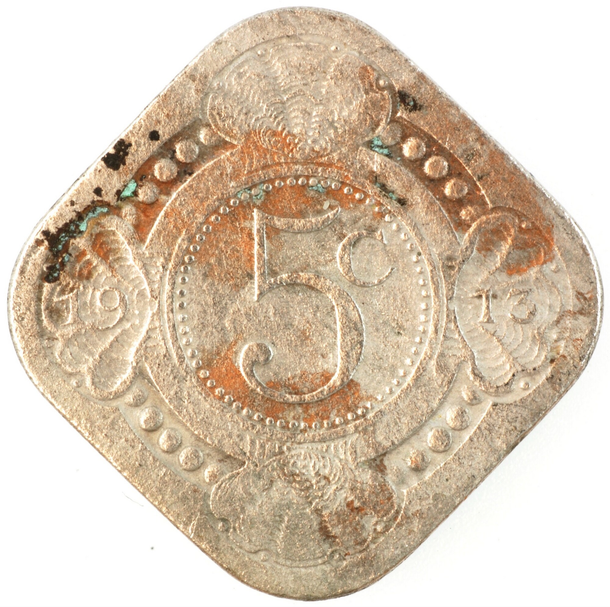 Stuiver; Nederland Koninkrijk (1813-heden); Wilhelmina (1890-1948); vz.: vruchtdragende tak van een oranje-appel binnen een dubbele cirkel, waartussen KONINGRIJK•DER•NEDERLANDEN; kz.:waarde-aanduiding 5c binnen een parelcirkel met 19 – 13 in twee schelpversieringen links en rechts; muntplaats: Utrecht; gewicht: 4.21 gram; referentie: Schulman 915