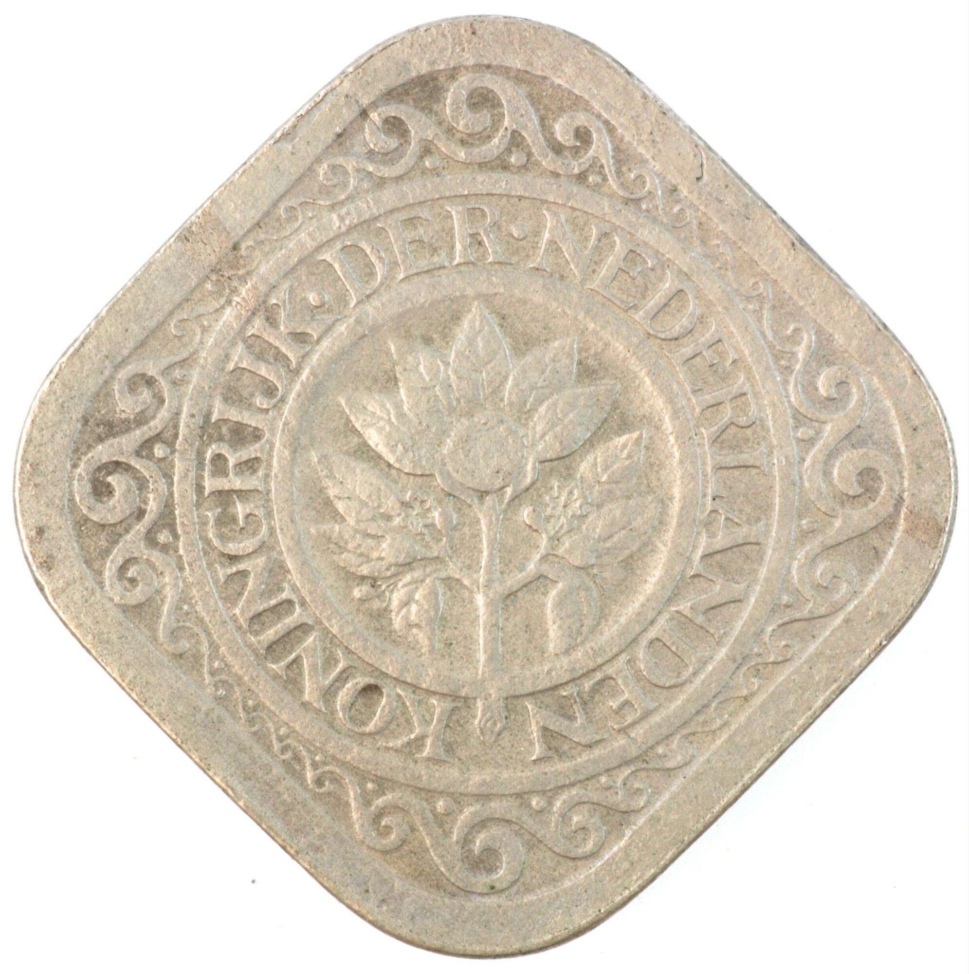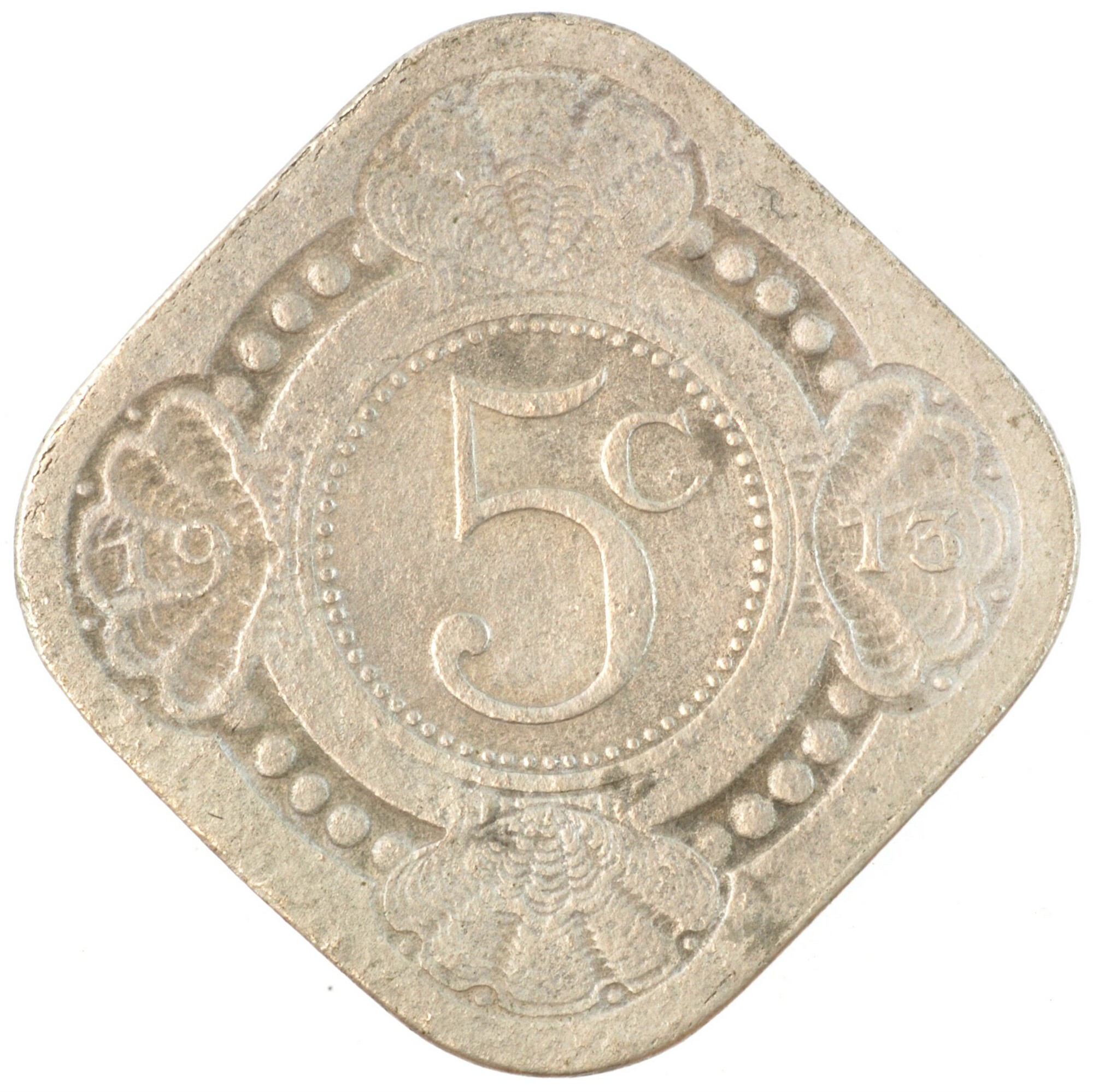 Stuiver; Nederland Koninkrijk (1813-heden); Wilhelmina (1890-1948); vz.: vruchtdragende tak van een oranje-appel binnen een dubbele cirkel, waartussen KONINGRIJK•DER•NEDERLANDEN; kz.:waarde-aanduiding 5c binnen een parelcirkel met 19 – 13 in twee schelpversieringen links en rechts; muntplaats: Utrecht; gewicht: 4.23 gram; referentie: Schulman 915