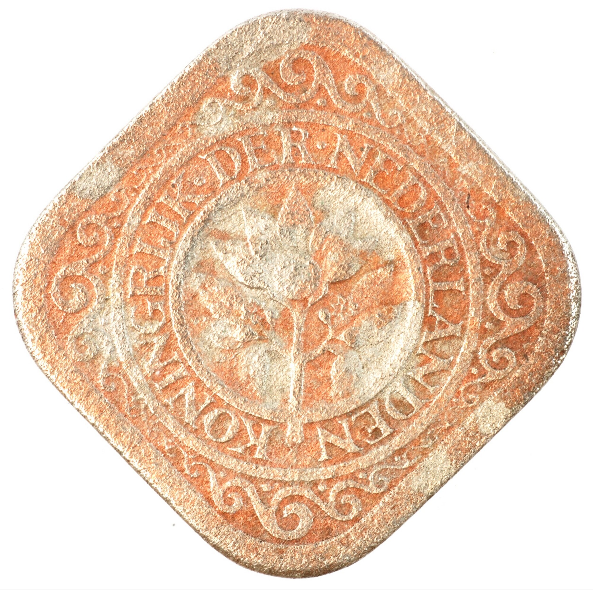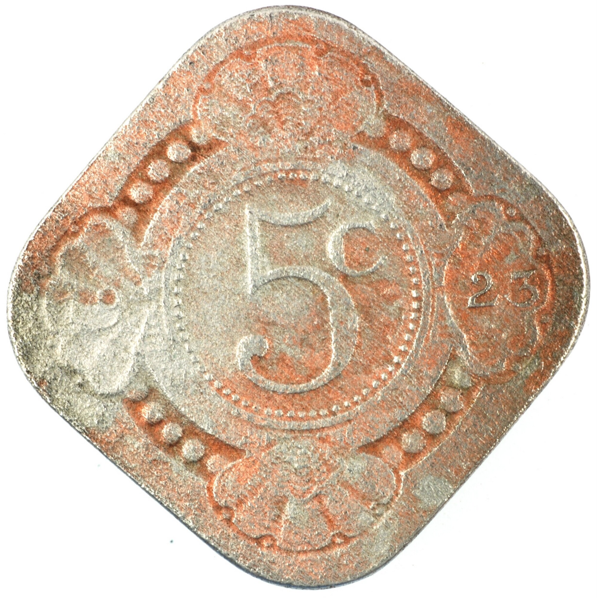 Stuiver; Nederland Koninkrijk (1813-heden); Wilhelmina (1890-1948); vz.: vruchtdragende tak van een oranje-appel binnen een dubbele cirkel, waartussen KONINGRIJK•DER•NEDERLANDEN; kz.:waarde-aanduiding 5c binnen een parelcirkel met 19 – 23 in twee schelpversieringen links en rechts; muntplaats: Utrecht; gewicht: 4.26 gram; referentie: Schulman 917