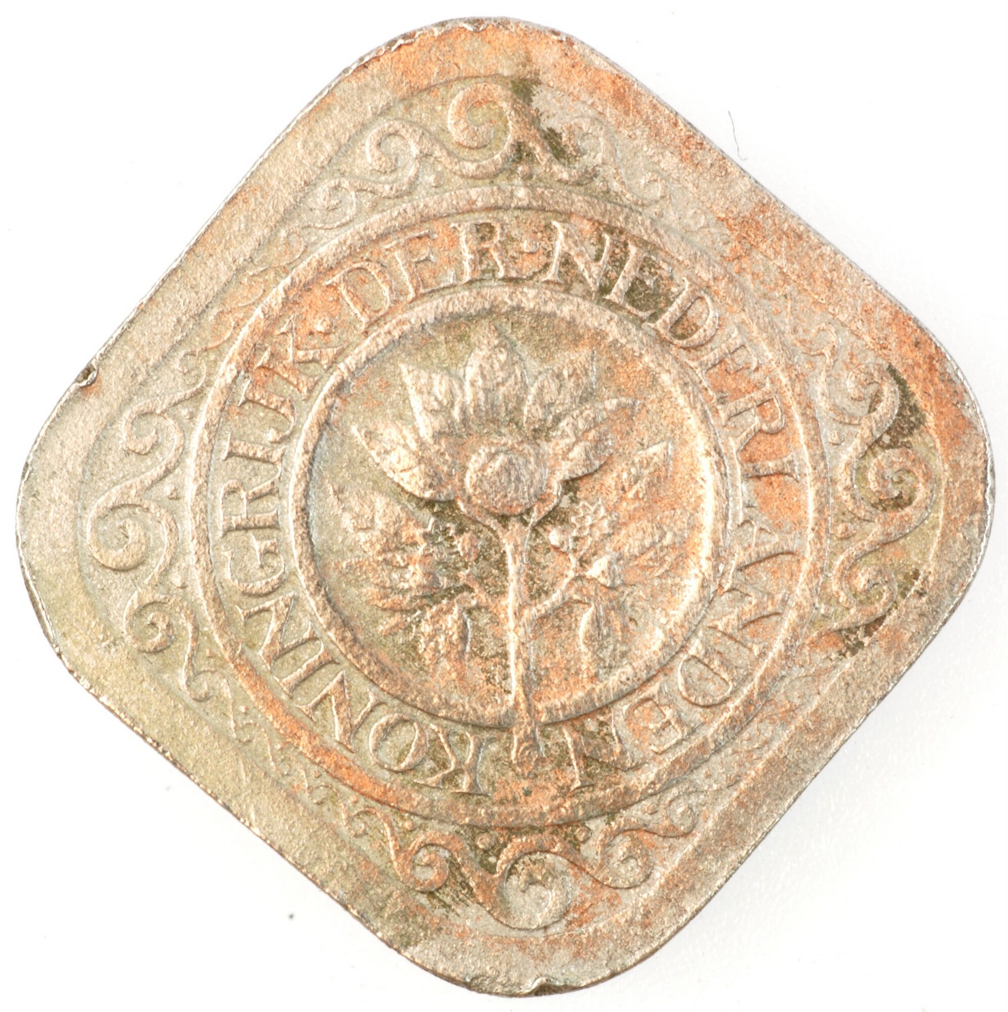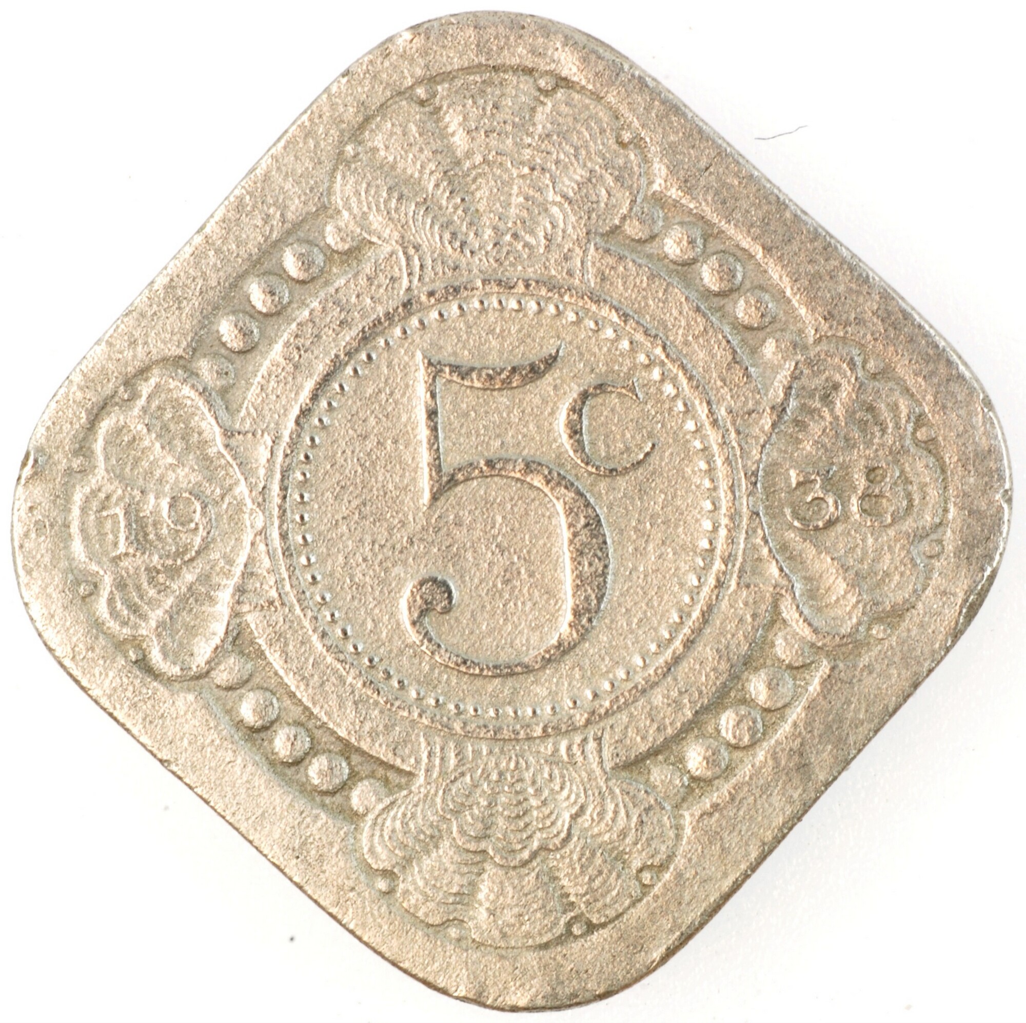 Stuiver; Nederland Koninkrijk (1813-heden); Wilhelmina (1890-1948); vz.: vruchtdragende tak van een oranje-appel binnen een dubbele cirkel, waartussen KONINGRIJK•DER•NEDERLANDEN; kz.:waarde-aanduiding 5c binnen een parelcirkel met 19 – 38 in twee schelpversieringen links en rechts; muntplaats: Utrecht; gewicht: 4.38 gram; referentie: Schulman 923