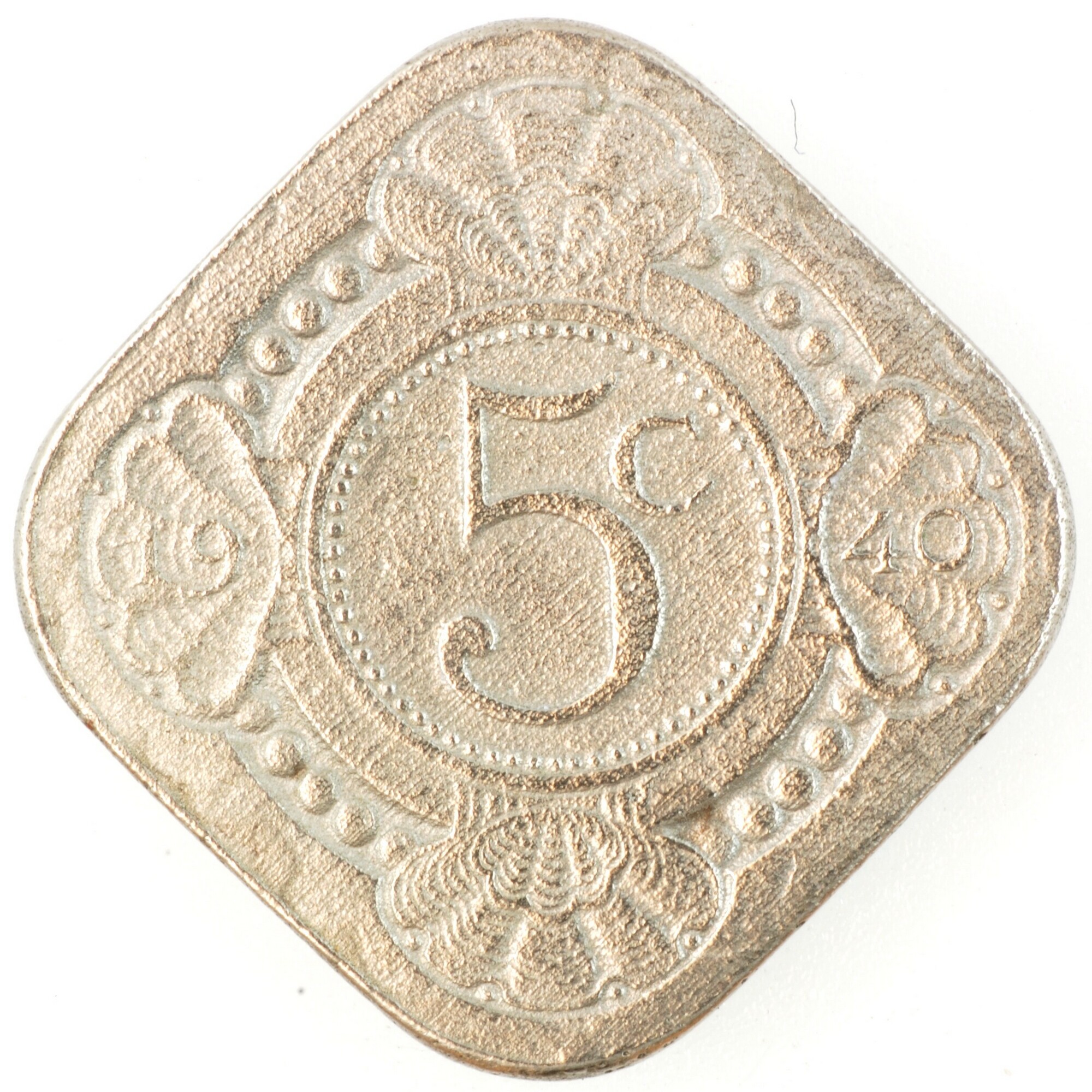 Stuiver; Nederland Koninkrijk (1813-heden); Wilhelmina (1890-1948); vz.: vruchtdragende tak van een oranje-appel binnen een dubbele cirkel, waartussen KONINGRIJK•DER•NEDERLANDEN; kz.:waarde-aanduiding 5c binnen een parelcirkel met 19 – 40 in twee schelpversieringen links en rechts; muntplaats: Utrecht; gewicht: 4.32 gram; referentie: Schulman 925