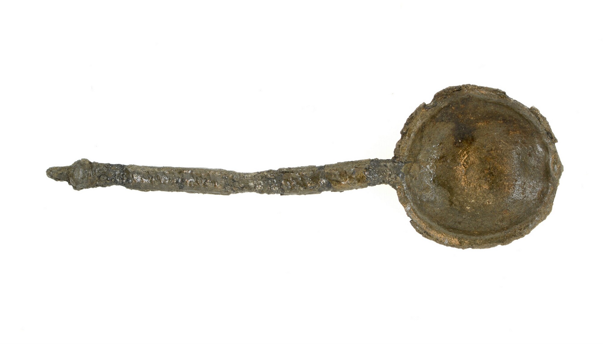 Lepel; speelgoed; miniatuur lepel met ronde bak en steel die rechthoekig in doorsnede is; vondstomstandigheden: afvallaag ten W. spoor 107