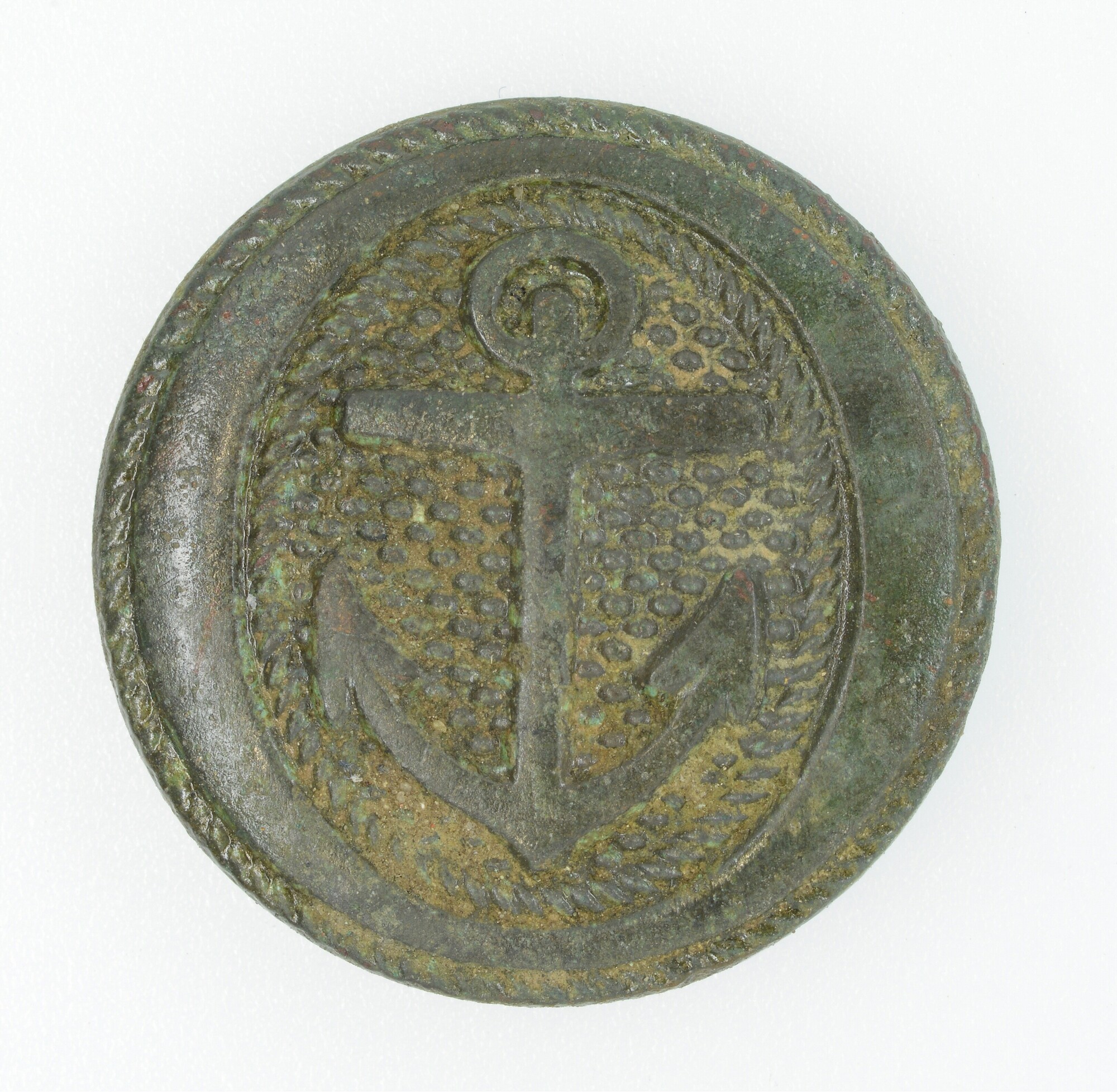 Knoop; Marineknoop uit de periode 1813-1827. Anker op fijn gepuncteerde ondergrond binnen een kabel. Het beeldvlak is eliptisch van vorm, door een verdikte rand aan linker en rechter zijde; achterzijde gemerkt: SUPERIOR QUALITY