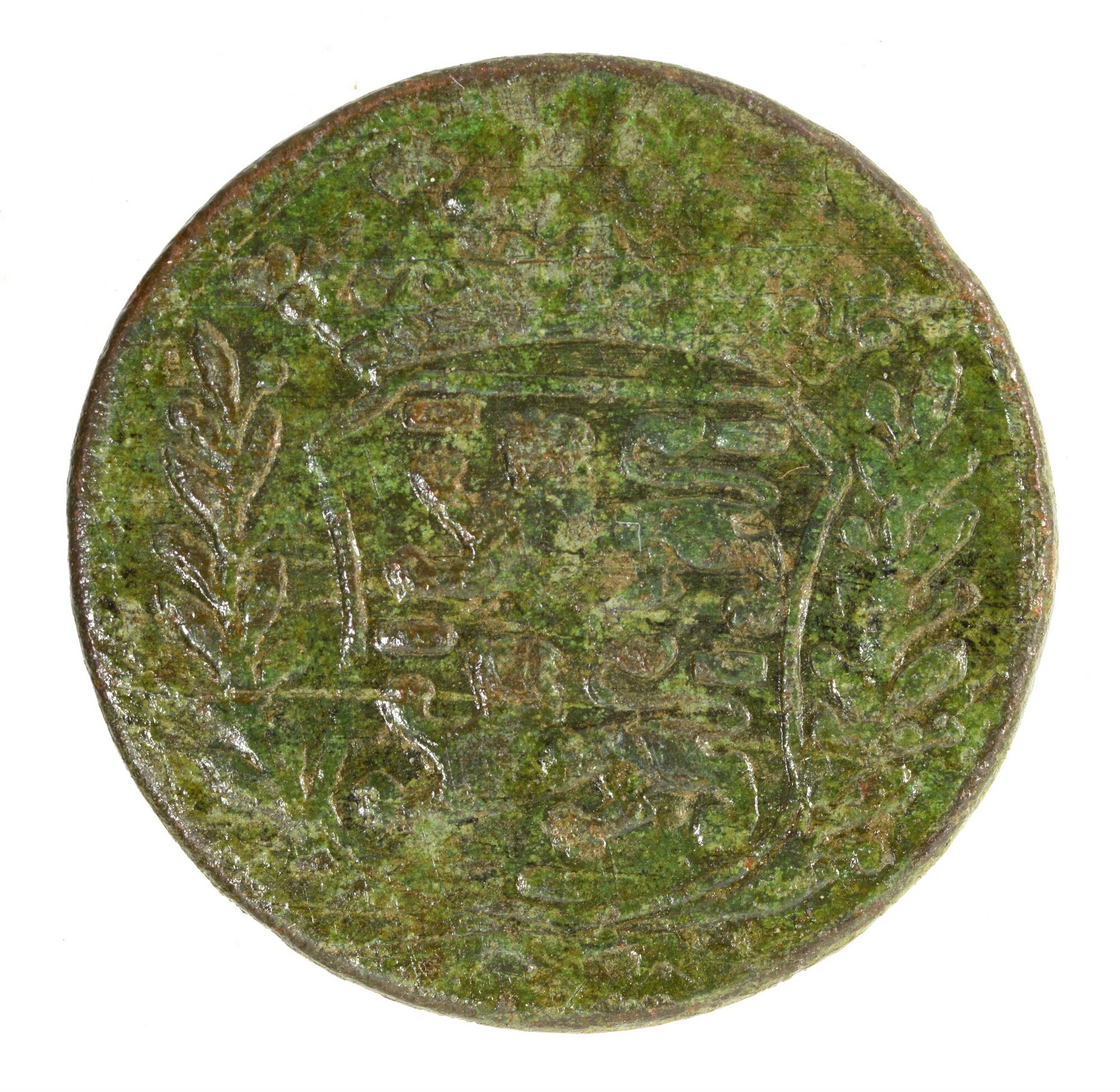 Duit West-Frisia; vz.: Haringbuis, daaronder WEST FRI SIA in drie regels en het jaartal 1730; kz.: Gekroond wapenschild met twee gaande leeuwen boven elkaar. De leeuwen hebben hun kop 'en face' gericht; Het wapen is versierd met lauwertakken; gewicht: 3.35 gram