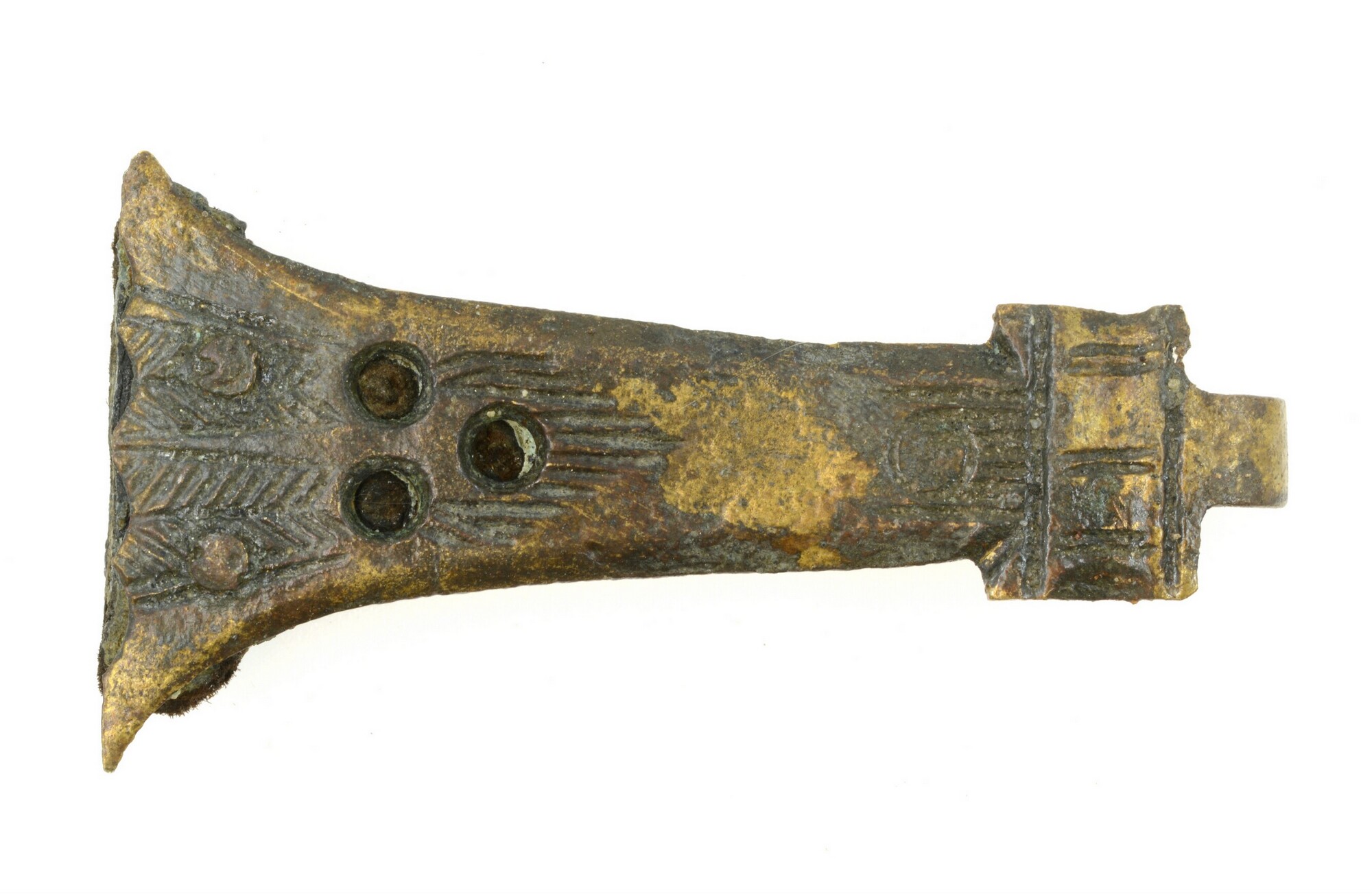 Boekbandsluiting; sluithaak; voorzien van een klinkplaatje dat aan de achterzijde is vastgeklonken. versierd met zaagsnedes, graveerwerk en drie gaten; deel ontbreekt