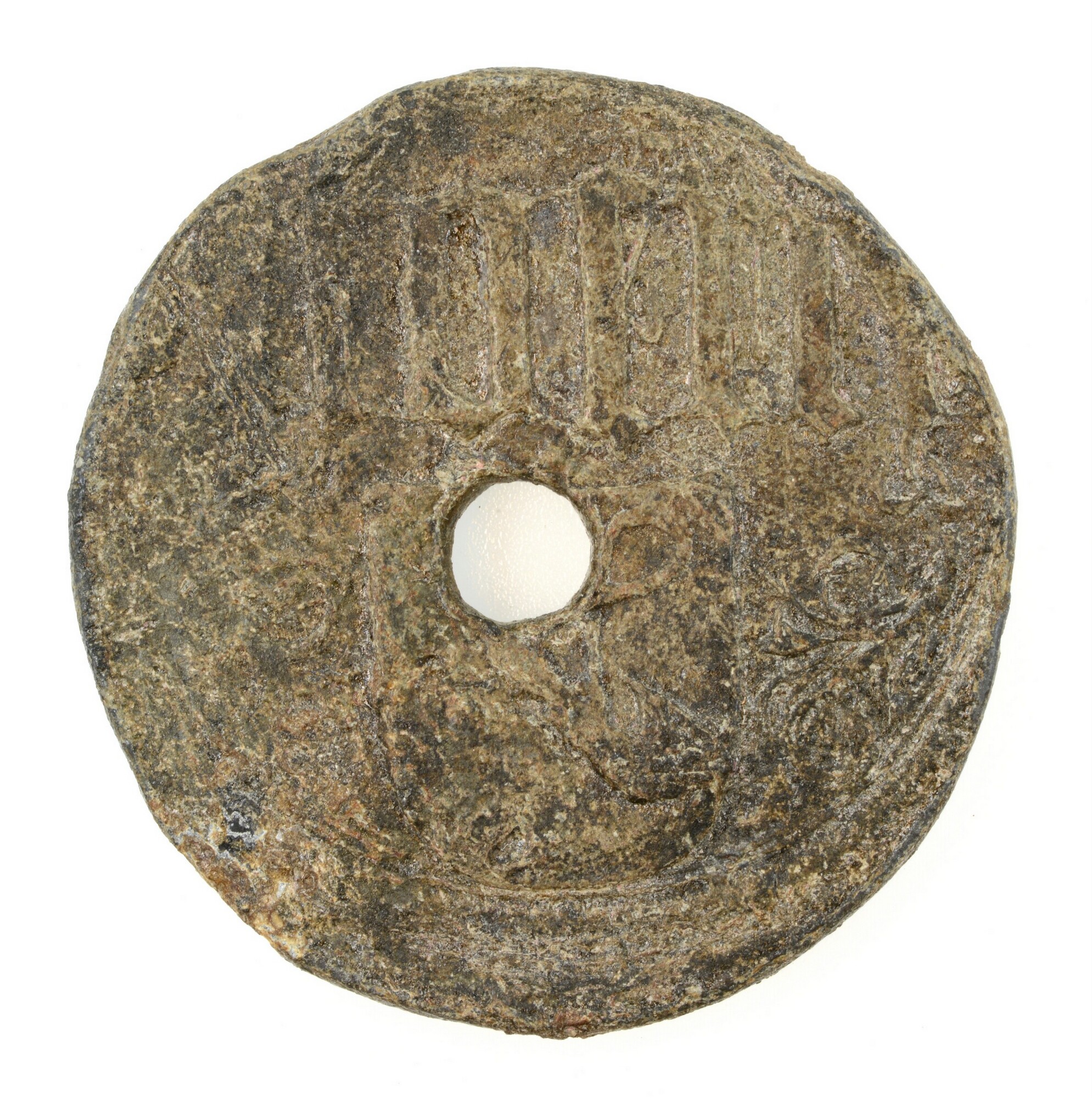 Bakenlood?; functie niet geheel duidelijk; aan één zijde een stempel en een bevestigingsgat in het midden. Bovenaan staat in gotische letters HOERN en daaronder het stadswapen van Hoorn met aan weerszijden een florale versiering