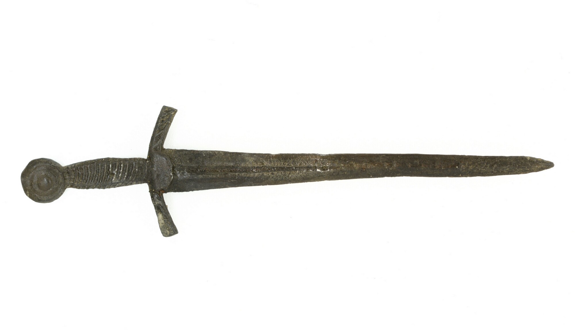 Miniatuur zwaard; speelgoed; zwaard met details van het gevest met ronde knop (pommel) en de bloedgeul op de kling; op de greep is met diagonale lijntjes de omwikkeling met zwart leer geïmiteerd