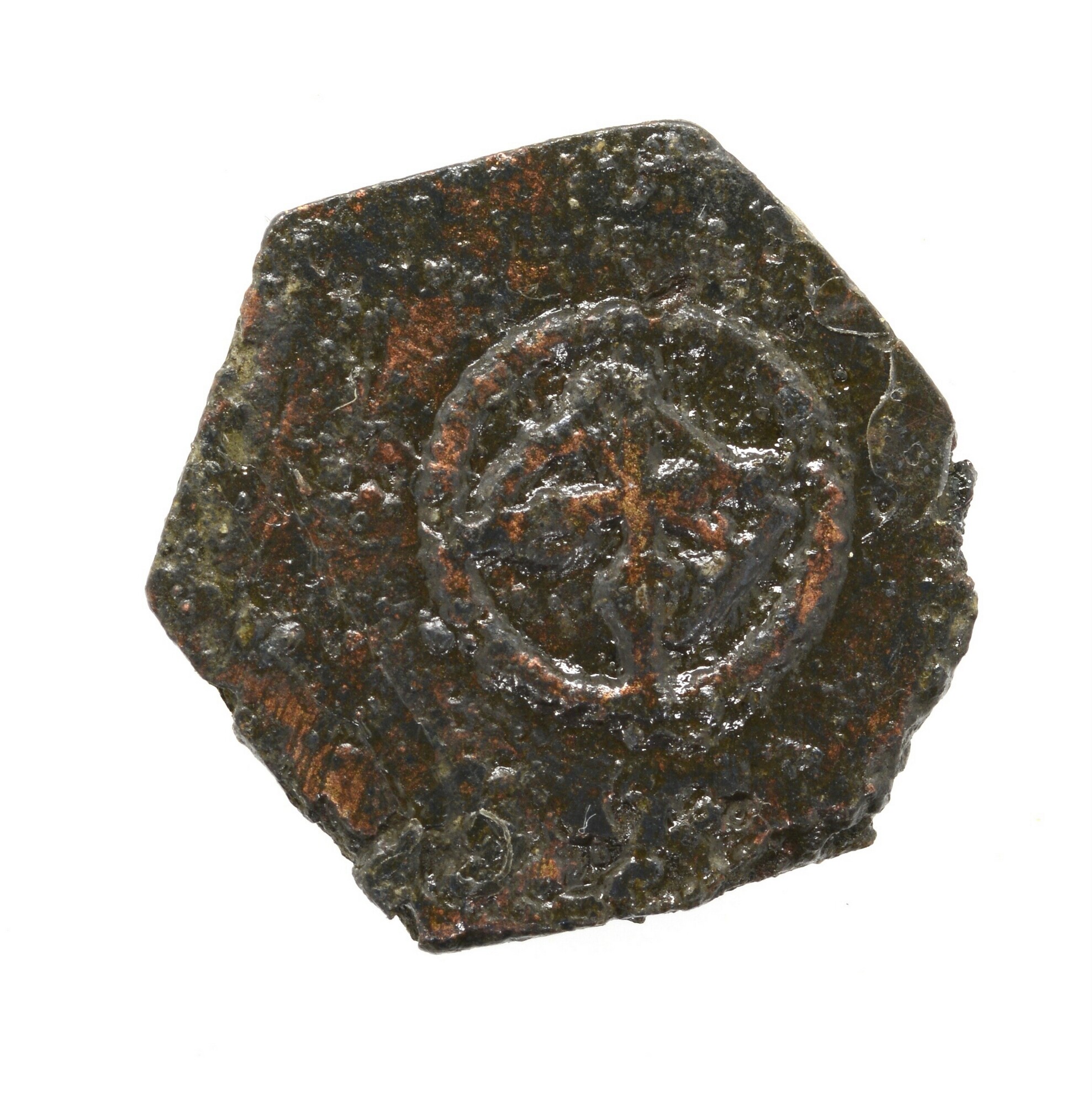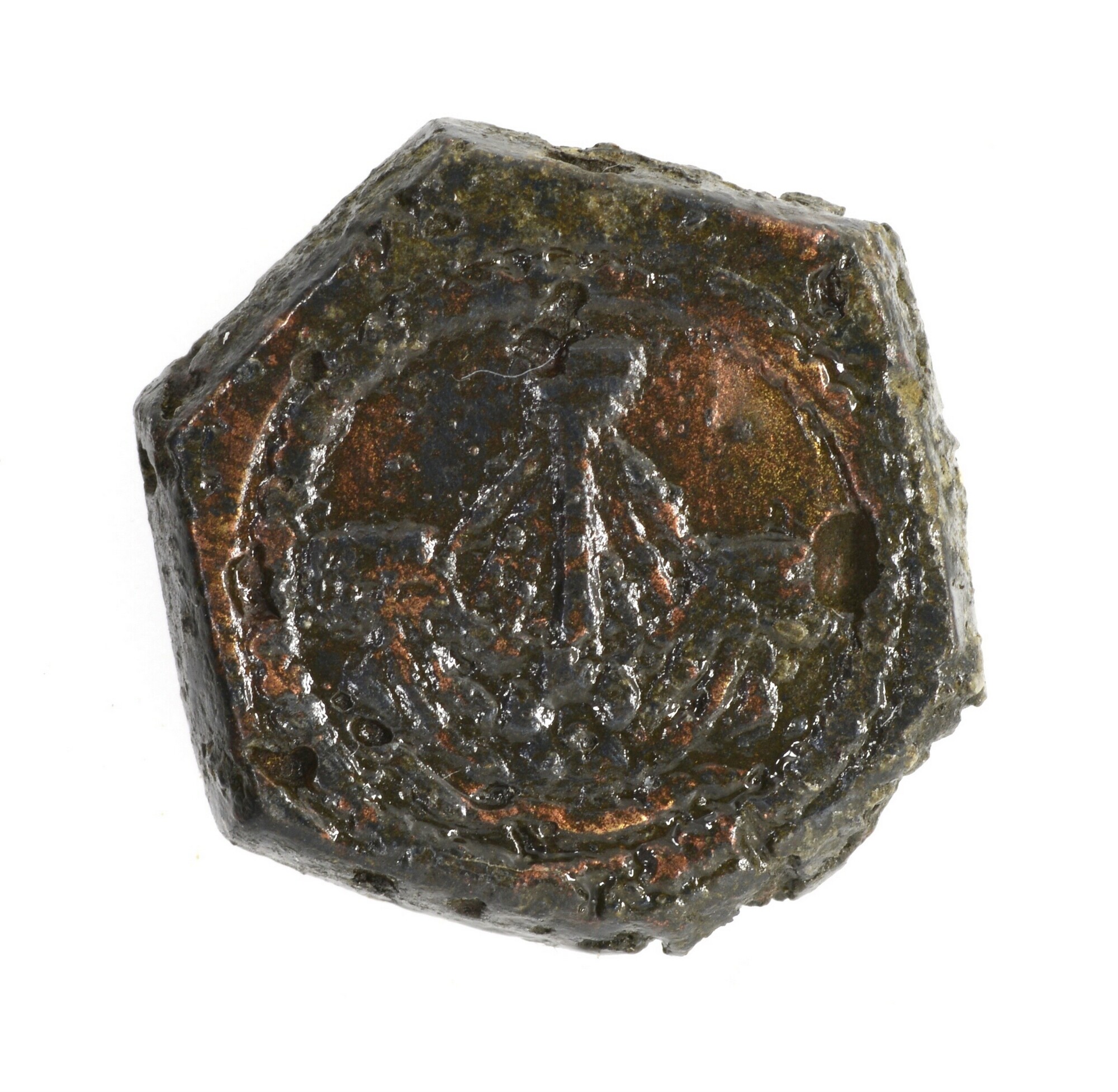Muntgewicht; zeskantig; vz.: koggeschip; kz.: bourgondische vuurslag met kruis; gewicht: 3.11 gram