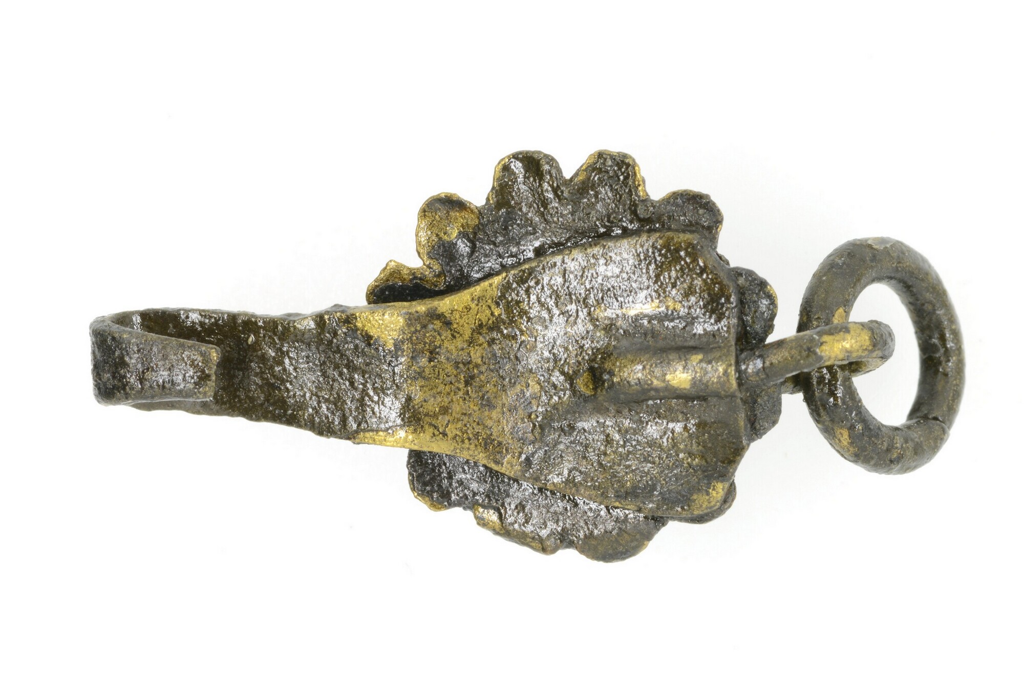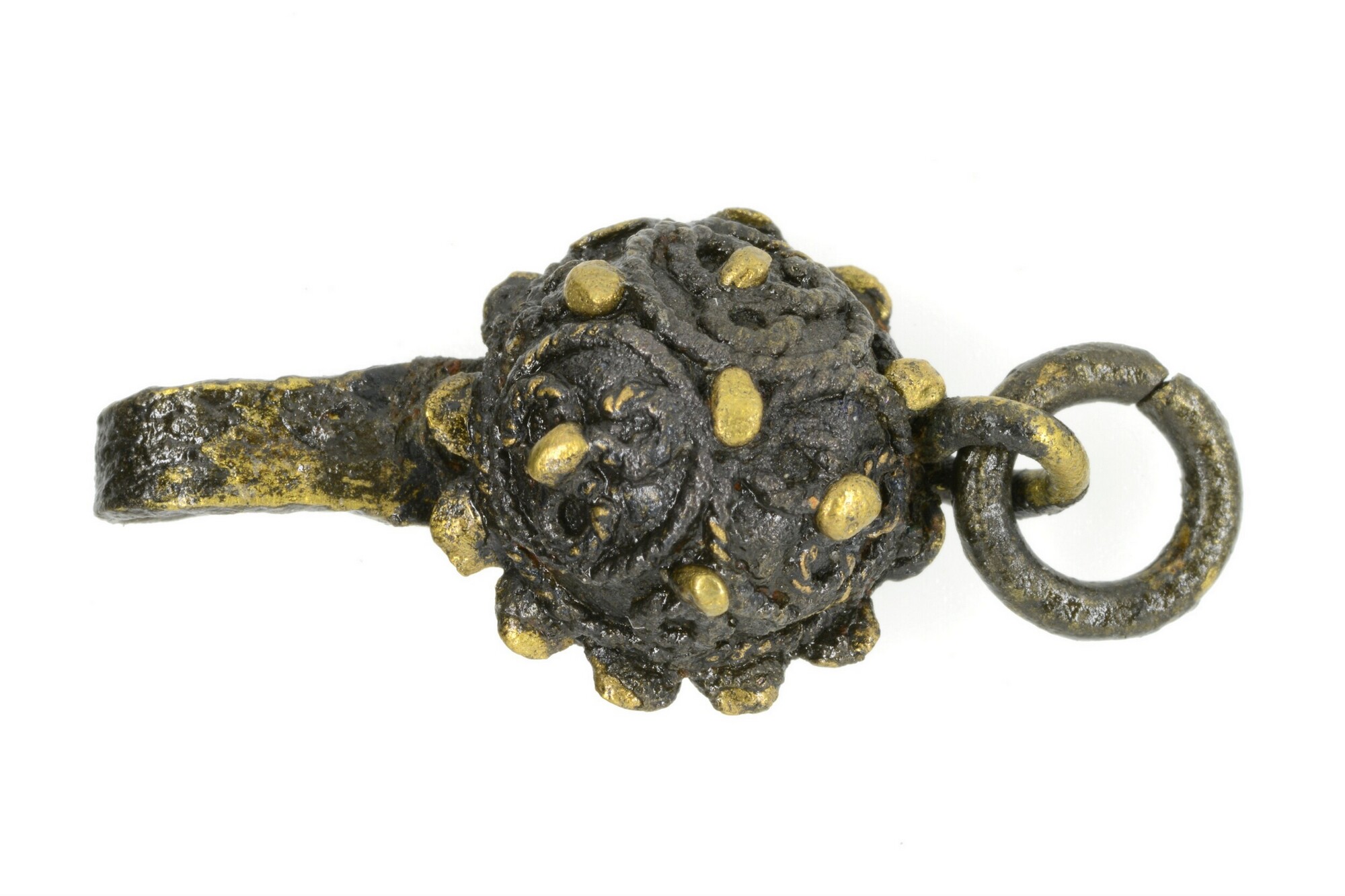Riemhanger; imitatie filigrain; de versiering is gemaakt met kleine bolletjes messing en getordeerde messingdraadjes; hoort bij inv.nr. 5289-053