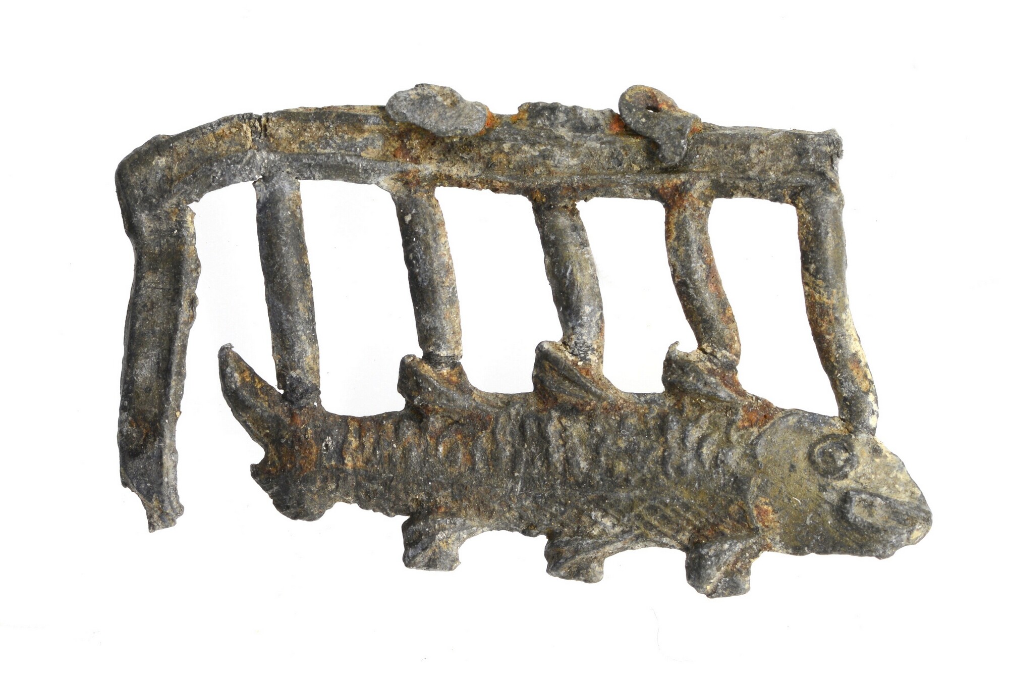 Treeft; miniatuur/speelgoed; met afbeelding van een vis op het rooster