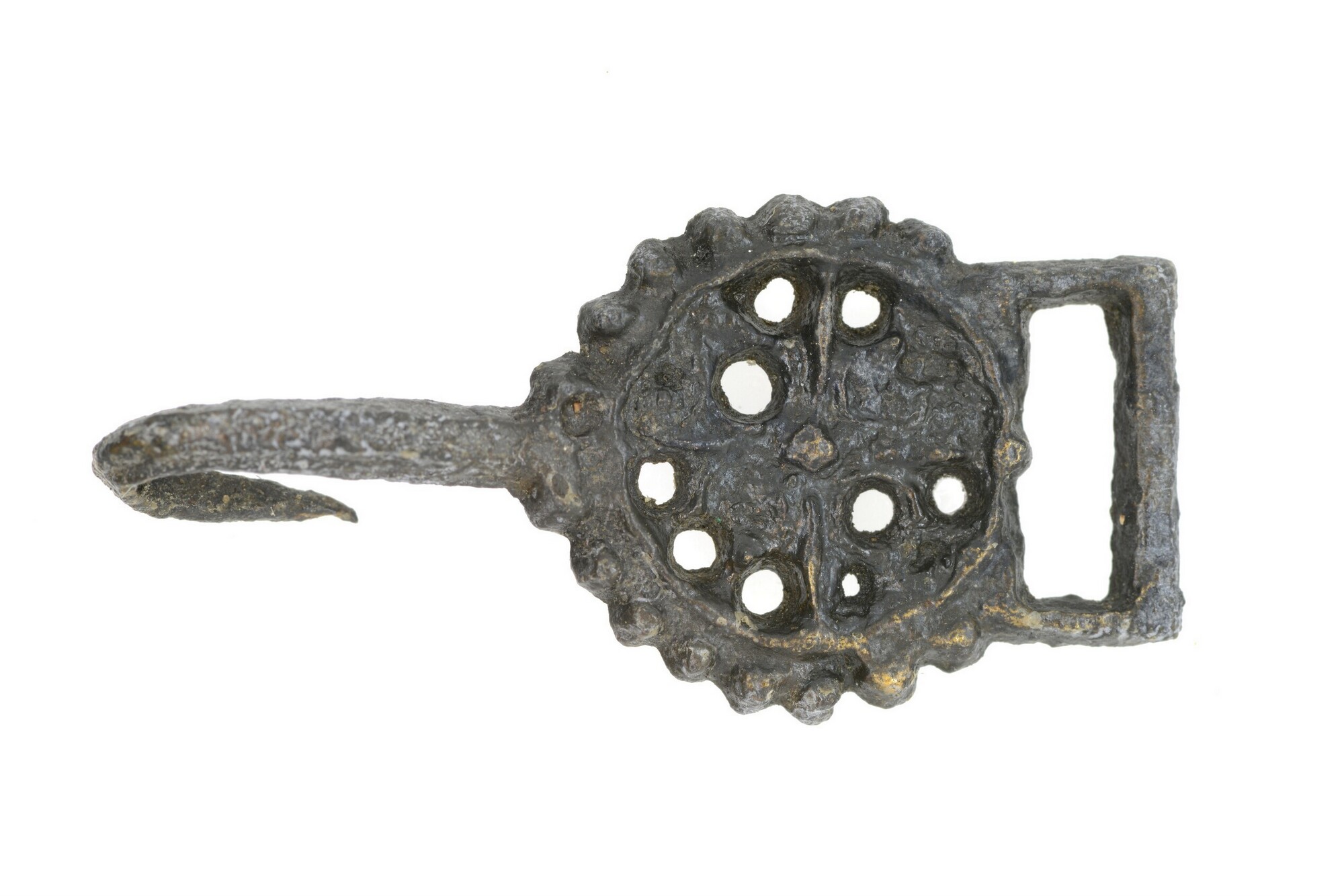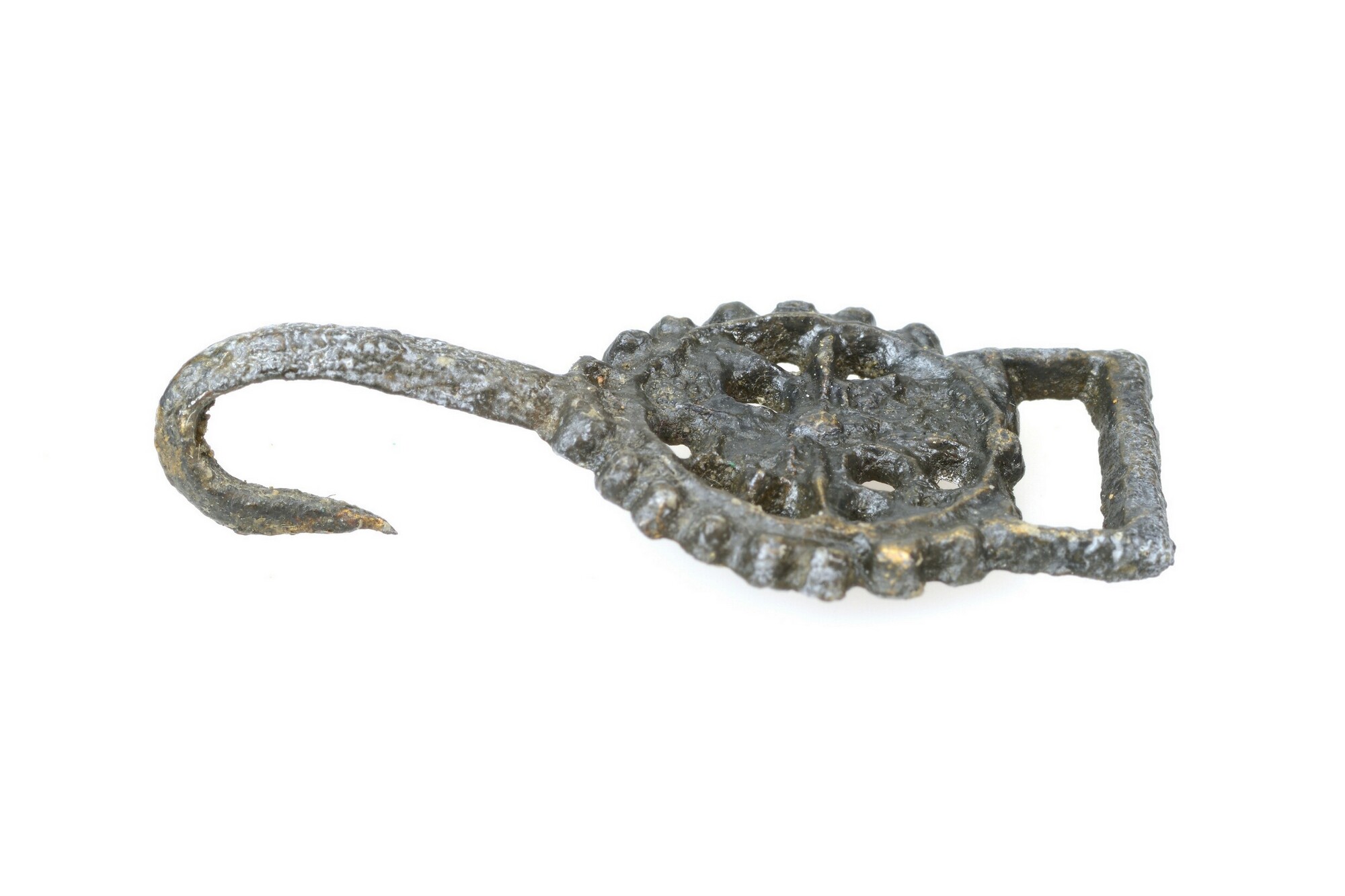 Kledinghaak; opengewerkt met rechthoekig oog en omgebogen haak