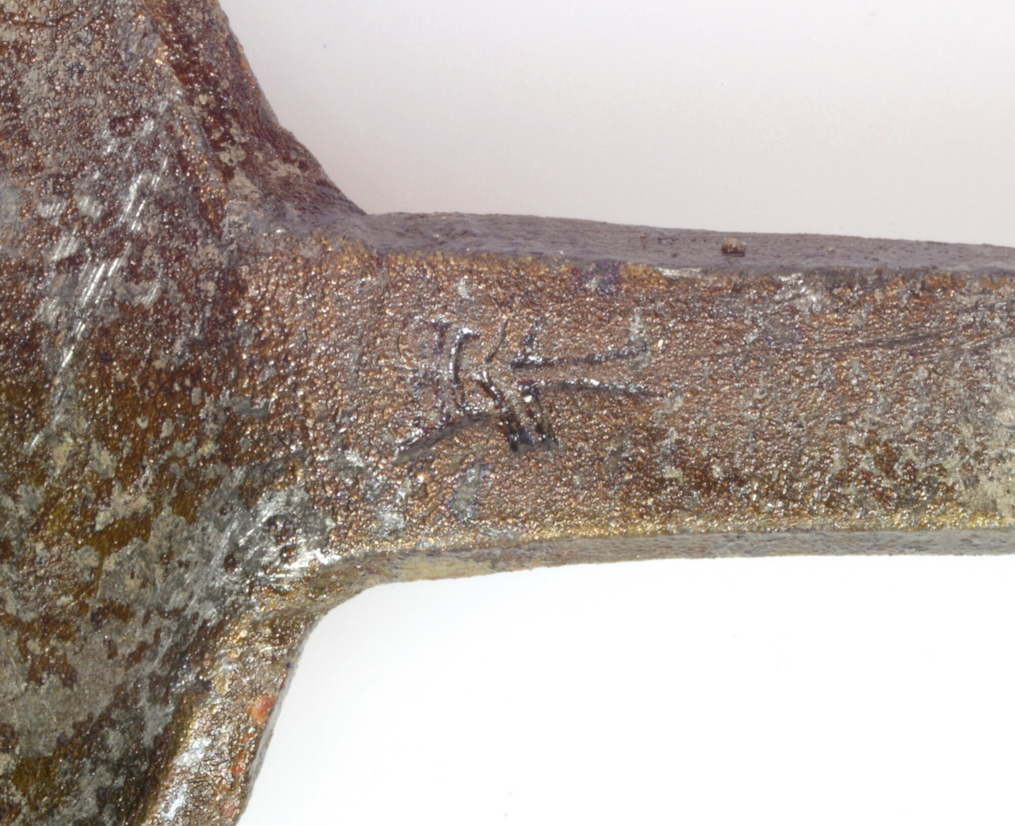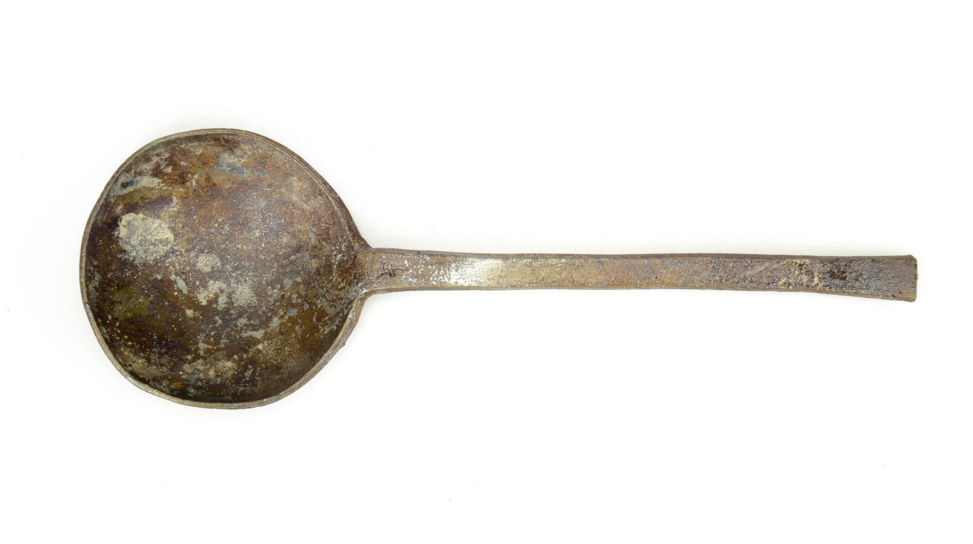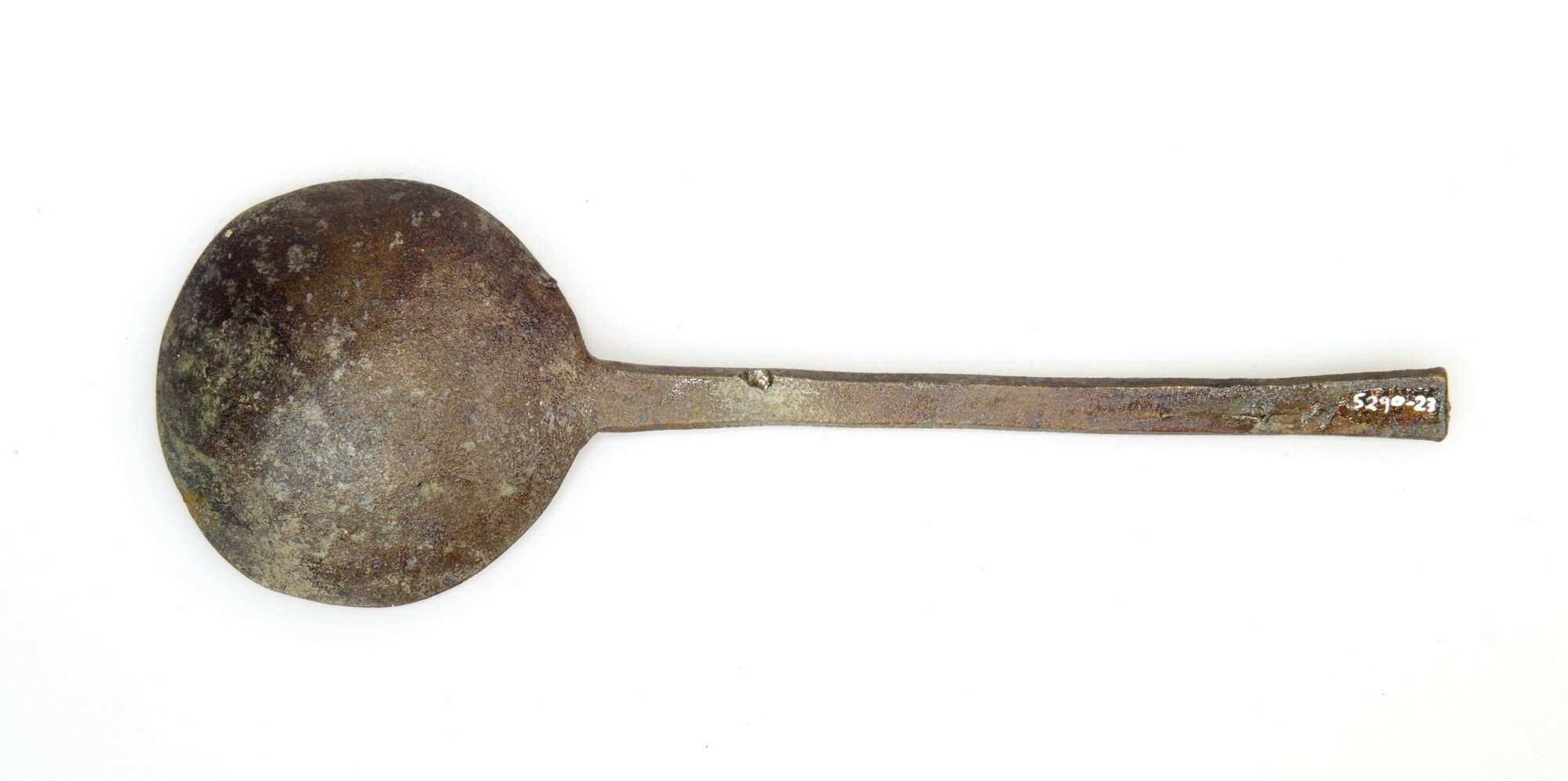 Lepel; sn-lep-; ronde bak zonder naald aan de achterzijde en een steel die rechthoekig in doorsnede is; merkteken op de steel