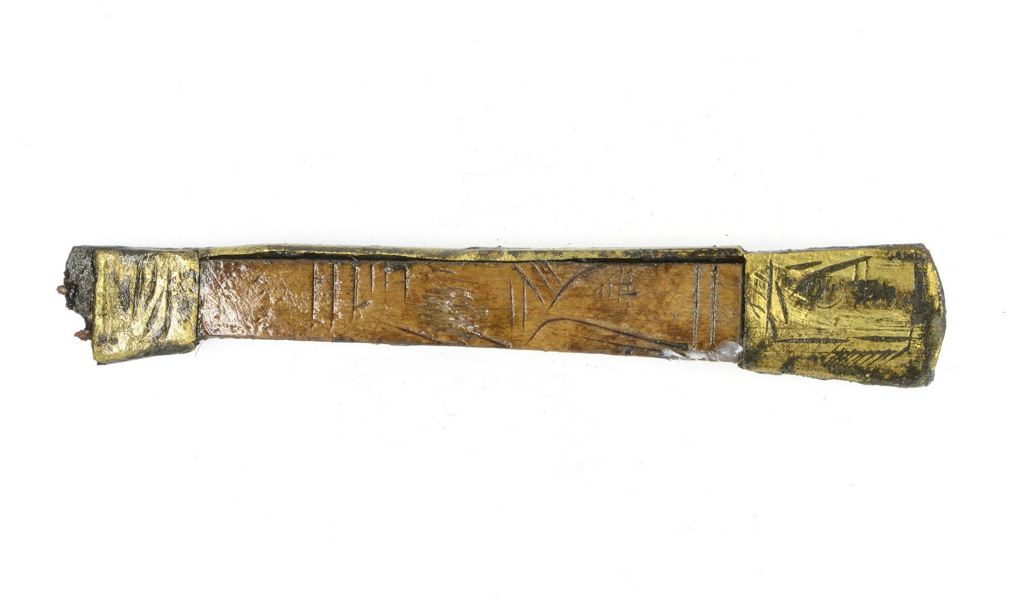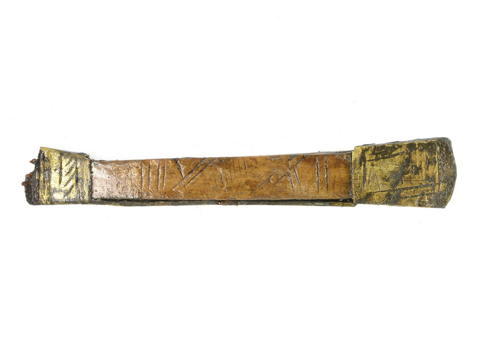 Mes; fe-mes; messing heftbekroning en heftbeschermer en benen heftplaten